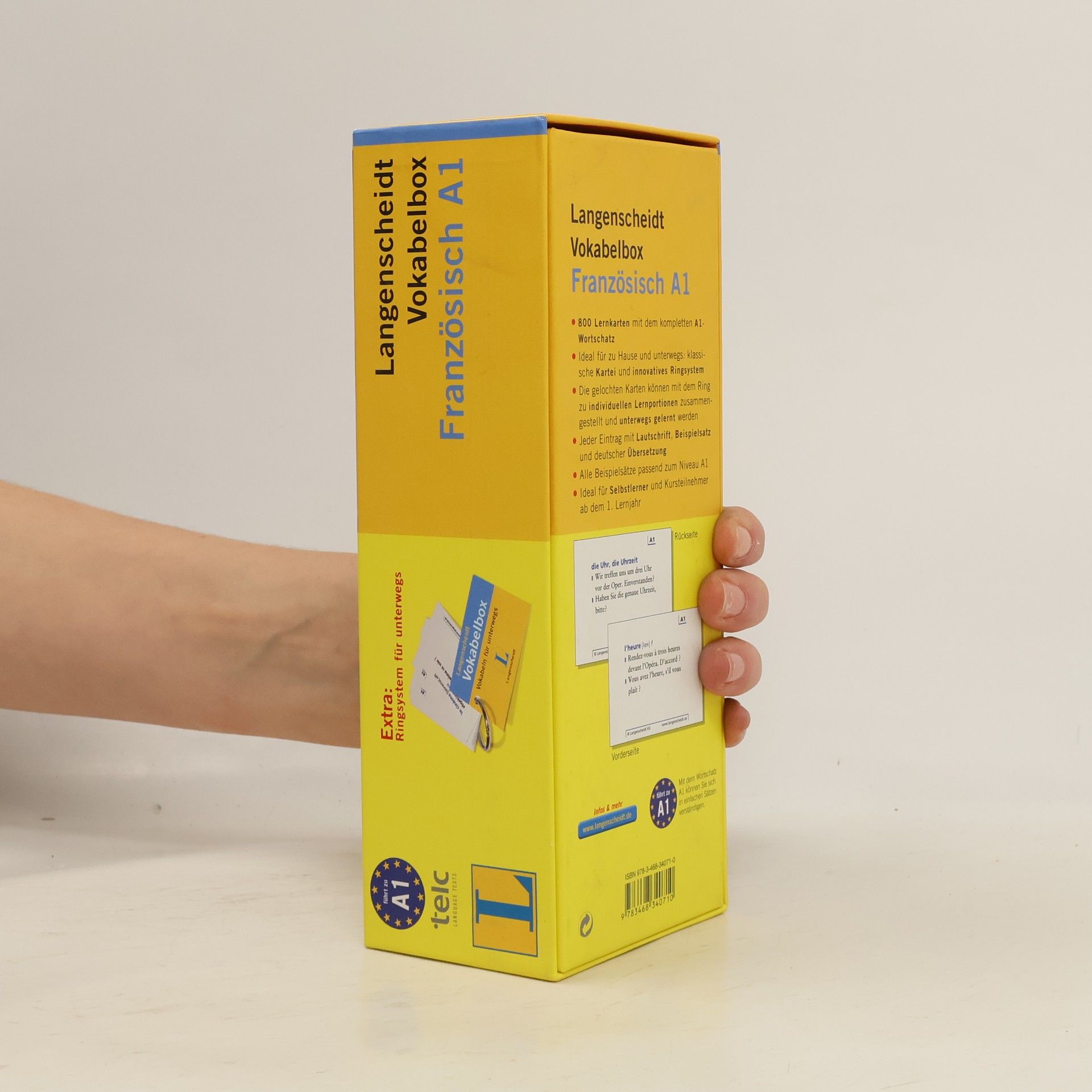 800 Lernkarten mit dem kompletten Wortschatz von A1 in der Kartei. Die gelochten Karten können mit dem Ring zu individuellen Lernportionen zusammengestellt und unterwegs gelernt werden. Jeder Eintrag mit Lautschrift, Anwendungsbeispiel und deutscher Übersetzung. Ideal für Selbstlerner, Kursteilnehmer ab dem 1. VHS-Semester und Studenten. Der Zertifikatswortschatz für das Niveau A1, in Zusammenarbeit mit telc GmbH.