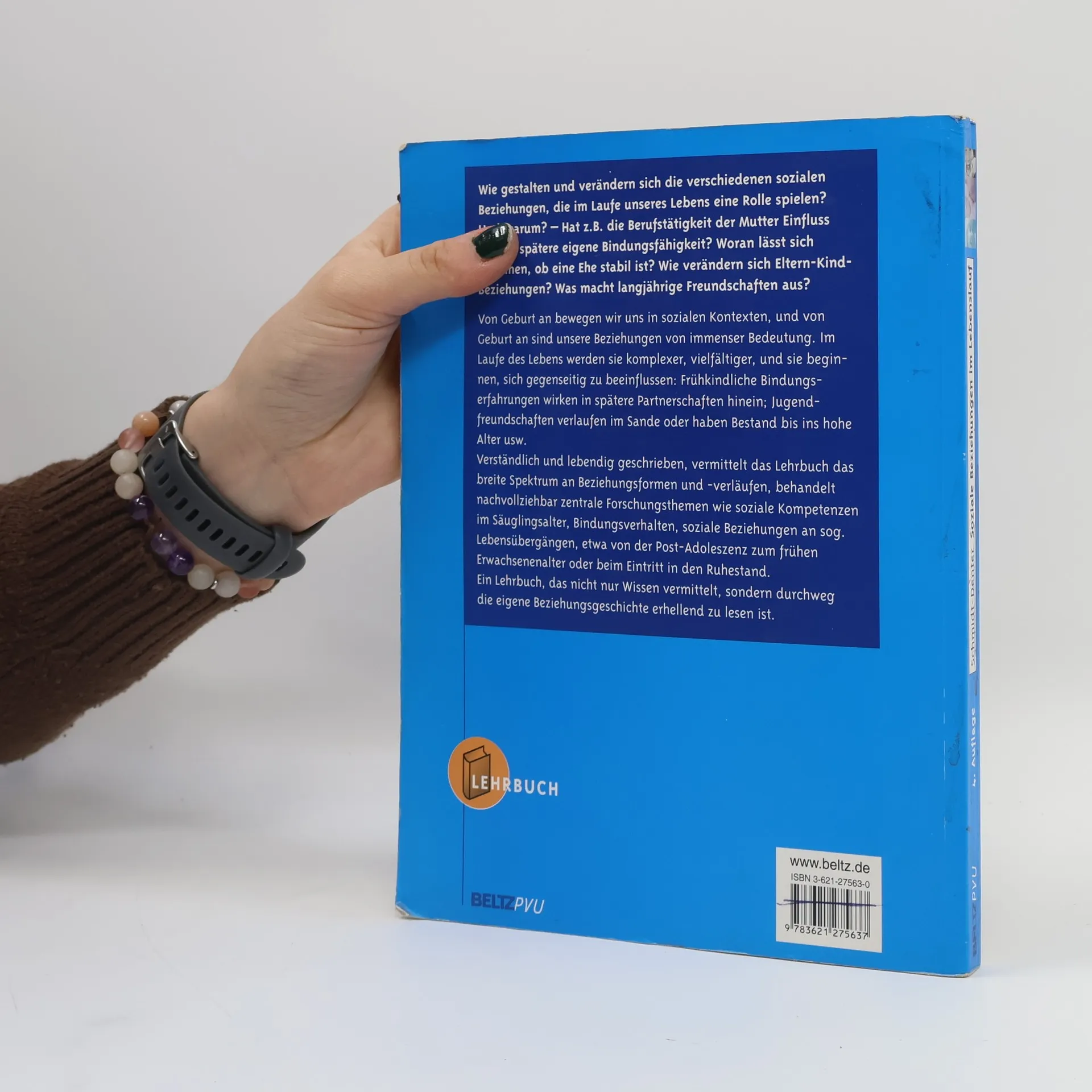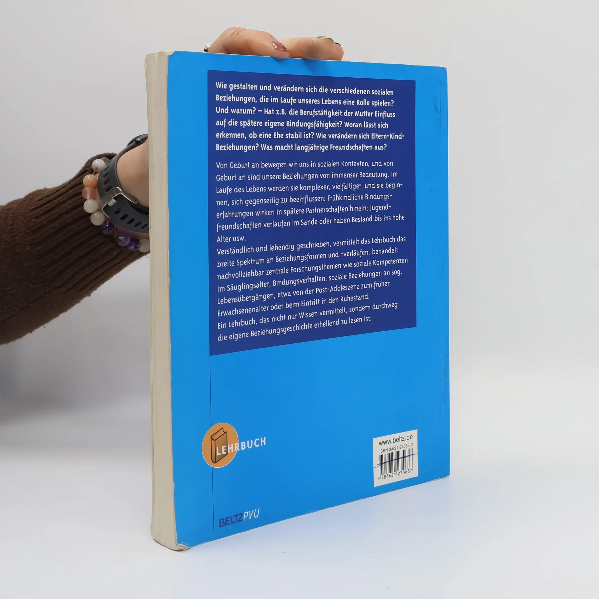 Wie gestalten und verändern sich die verschiedenen sozialen Beziehungen, die im Laufe unseres Lebens eine Rolle spielen? Und warum? - Hat z. B. die Berufstätigkeit der Mutter Einfluss auf die spätere eigene Bindungsfähigkeit? Woran lässt sich erkennen, ob eine Ehe stabil ist? Wie verändern sich Eltern-Kind-Beziehungen? Was macht langjährige Freundschaften aus? Von Geburt an bewegen wir uns in sozialen Kontexten, und von Geburt an sind unsere Beziehungen von immenser Bedeutung. Im Laufe des Lebens werden sie komplexer, vielfältiger, und sie beginnen, sich gegenseitig zu beeinflussen: Frühkindliche Bindungserfahrungen wirken in spätere Partnerschaften hinein; Jugendfreundschaften verlaufen im Sande oder haben Bestand bis ins hohe Alter usw. Verständlich und lebendig geschrieben, vermittelt das Lehrbuch das breite Spektrum an Beziehungsformen und -verläufen, behandelt nachvollziehbar zentrale Forschungsthemen wie soziale Kompetenzen im Säuglingsalter, Bindungsverhalten, soziale Beziehungen an sog. Lebensübergängen, etwa von der Post-Adoleszenz zum frühen Erwachsenenalter oder beim Eintritt in den Ruhestand. Ein Lehrbuch, das nicht nur Wissen vermittelt, sondern durchweg die eigene Beziehungsgeschichte erhellend zu lesen ist.