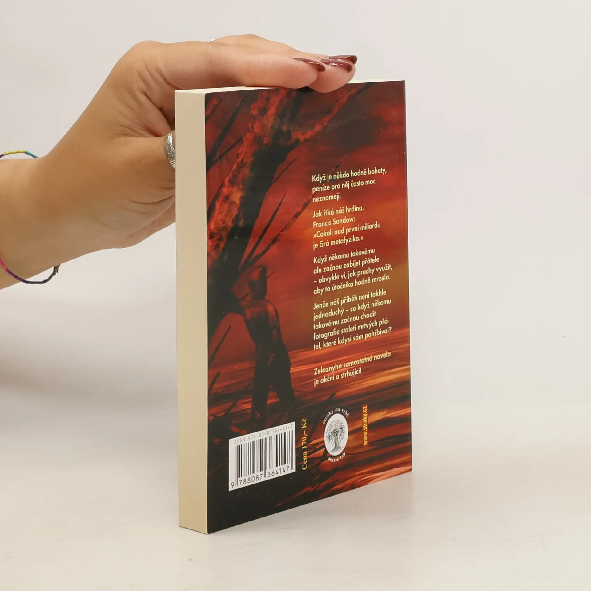 Když je někdo hodně bohatý, peníze pro něj často moc neznamenají. Jak říká náš hrdina, Francis Sandow: „Cokoli nad první miliardu je čirá metafyzika." Když někomu takovému ale začnou zabíjet přátele, tak obvykle ví, jak prachy využít, aby to útočníka hodně mrzelo. Jenže náš příběh není takhle jednoduchý – co když někomu takovému začnou chodit fotografie staletí mrtvých přátel, které kdysi sám pohřbíval? Zelaznyho samostatná novela je akční a strhující!