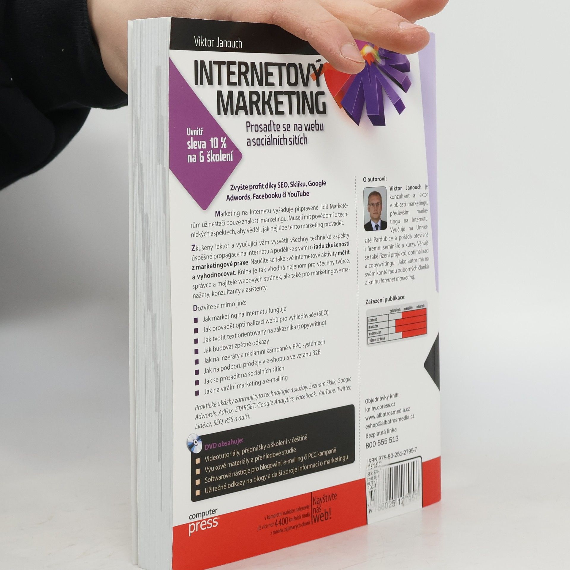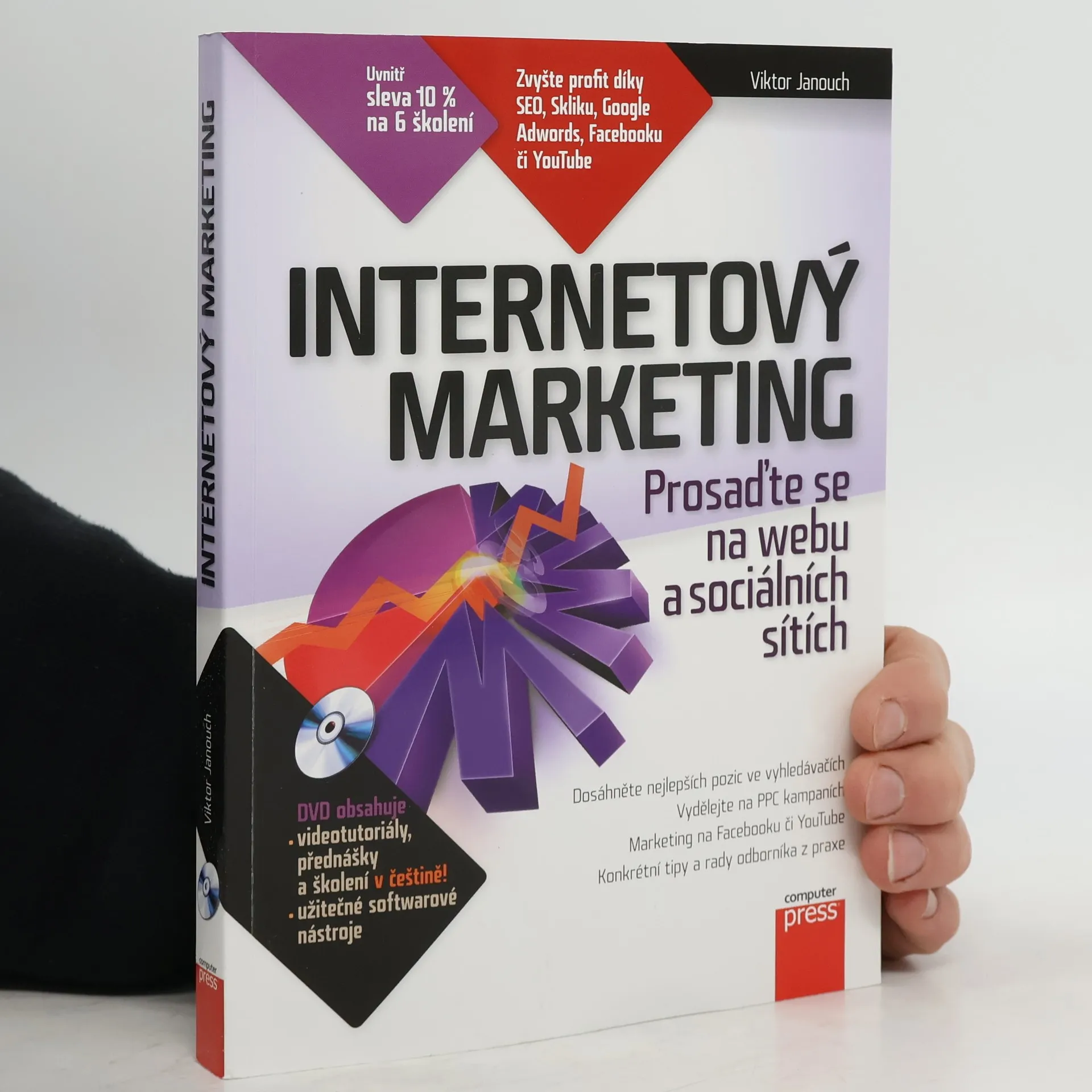 Zvyšte svůj profit díky SEO, Skliku, Google Adwords, Facebooku či YouTube! Marketing na Internetu vyžaduje připravené lidi, kteří mají nejen znalosti marketingu, ale také povědomí o technických aspektech. Zkušený lektor vám vysvětlí všechny technické aspekty úspěšné propagace a podělí se o cenné zkušenosti z praxe. Naučíte se měřit a vyhodnocovat své internetové aktivity. Kniha je určena tvůrcům, správcům a majitelům webových stránek, marketingovým manažerům, konzultantům a asistentům. Dozvíte se, jak marketing na Internetu funguje, jak provádět optimalizaci webů pro vyhledávače (SEO), jak tvořit texty orientované na zákazníka (copywriting), budovat zpětné odkazy, spravovat inzeráty a reklamní kampaně v PPC systémech, podporovat prodej v e-shopu a ve vztahu B2B, prosadit se na sociálních sítích, a jak na virální marketing a e-mailing. Praktické ukázky zahrnují technologie a služby jako Seznam Sklik, Google Adwords, Google Analytics, Facebook a další. DVD obsahuje videotutoriály, školení, výukové materiály a užitečné odkazy na blogy a další zdroje informací o marketingu. Autor, Viktor Janouch, je konzultant a lektor v oblasti marketingu, vyučuje na Univerzitě Pardubice a má na svém kontě řadu odborných článků.
