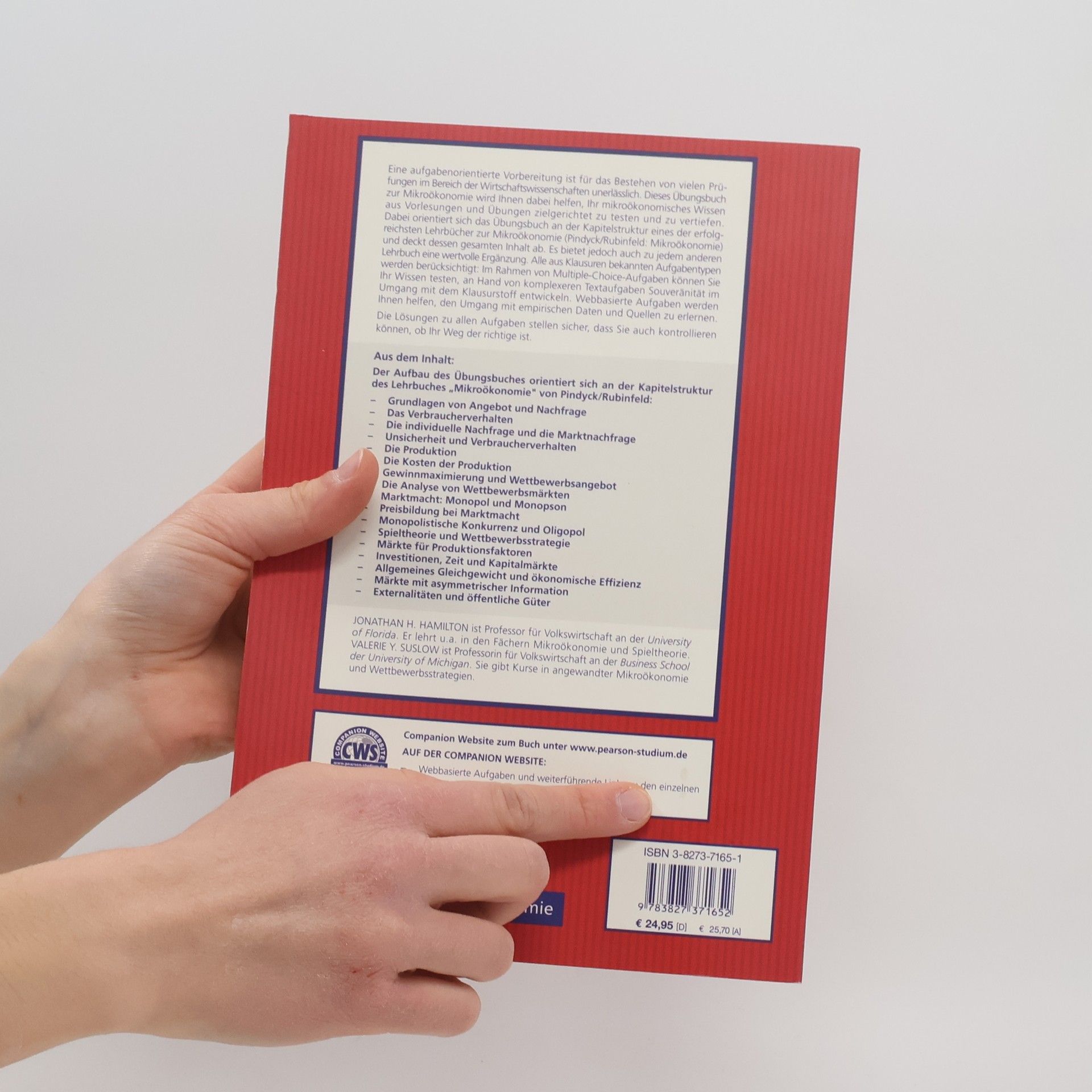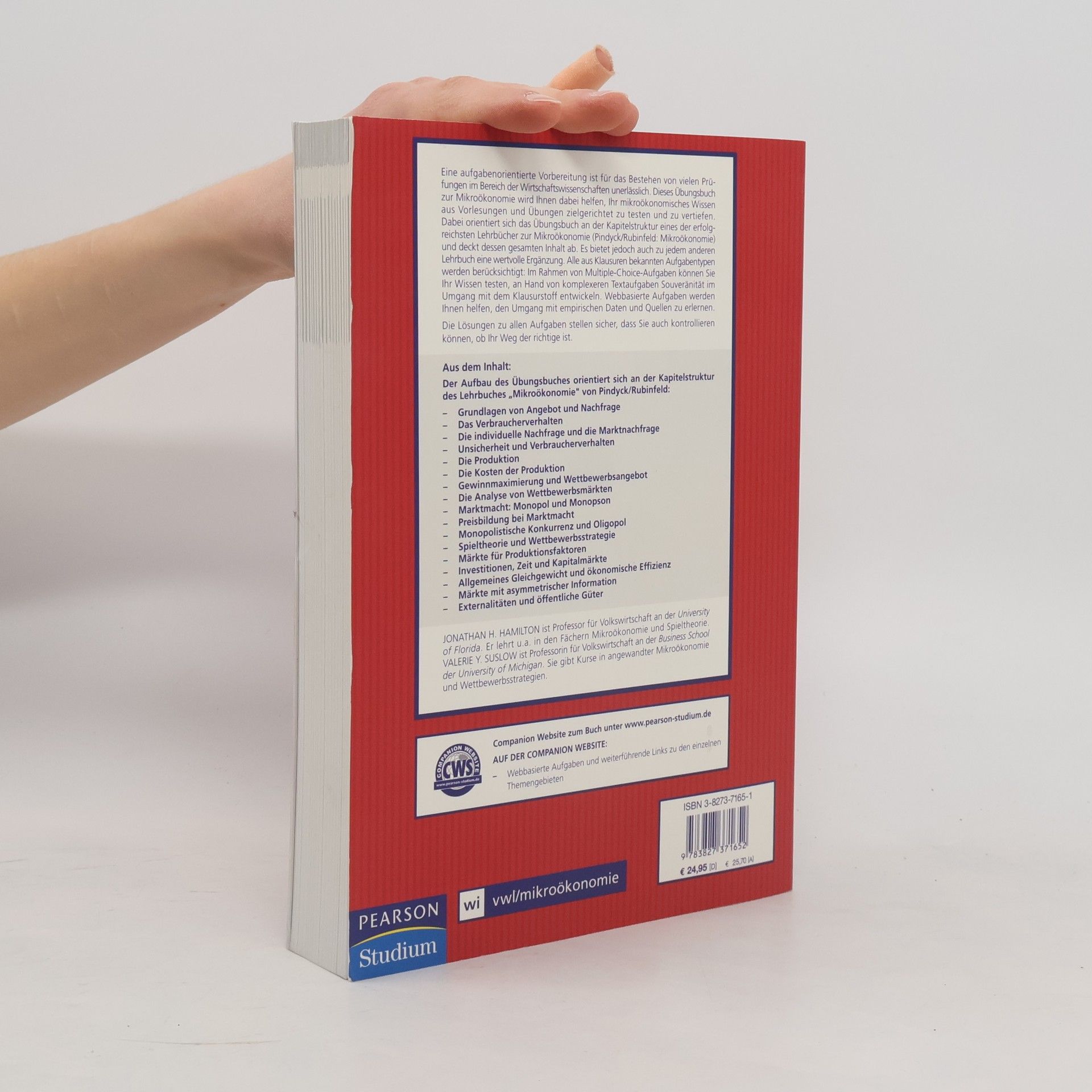 Über dieses Buch: Eine aufgabenorientierte Vorbereitung ist für das Bestehen von vielen Prüfungen im Bereich der Wirtschaftswissenschaften unerlässlich. Dieses Übungsbuch zur Mikroökonomie wird Ihnen dabei helfen, Ihr mikroökonomisches Wissen aus Vorlesungen und Übungen zielgerichtet zu testen und zu vertiefen. Dabei orientiert sich das Übungsbuch an der Kapitelstruktur eines der erfolgreichsten Lehrbücher zur Mikroökonomie (Pindyck/Rubinfeld: Mikroökonomie) und deckt dessen gesamten Inhalt ab. Es bietet jedoch auch zu jedem anderen Lehrbuch eine wertvolle Ergänzung. Jedes Kapitel ist folgendermaßen aufgebaut:- Wiederholung der wichtigsten Konzepte aus dem Lehrbuch,- einfachere bis komplexere Textaufgaben zum Erlernen von Souveränität im Umgang mit dem Klausurstoff,- Multiple Choice-Aufgaben zum Wissenstest. Die Lösungen zu allen Aufgaben am Ende jedes Kapitels stellen sicher, dass Sie auch kontrollieren können, ob Ihr Weg der richtige ist.Über die Autoren: JONANTHAN H. HAMILTON ist Professor für Volkswirtschaft an der University of Florida. Er lehrt u. a. in den Fächern Mikroökonomie und Spieltheorie. VALERIE Y. SUSLOW ist Professorin für Volkswirtschaft an der Business School der University of Michigan. Sie hält Kurse in angewandter Mikroökonomie und Wettbewerbsstrategien.