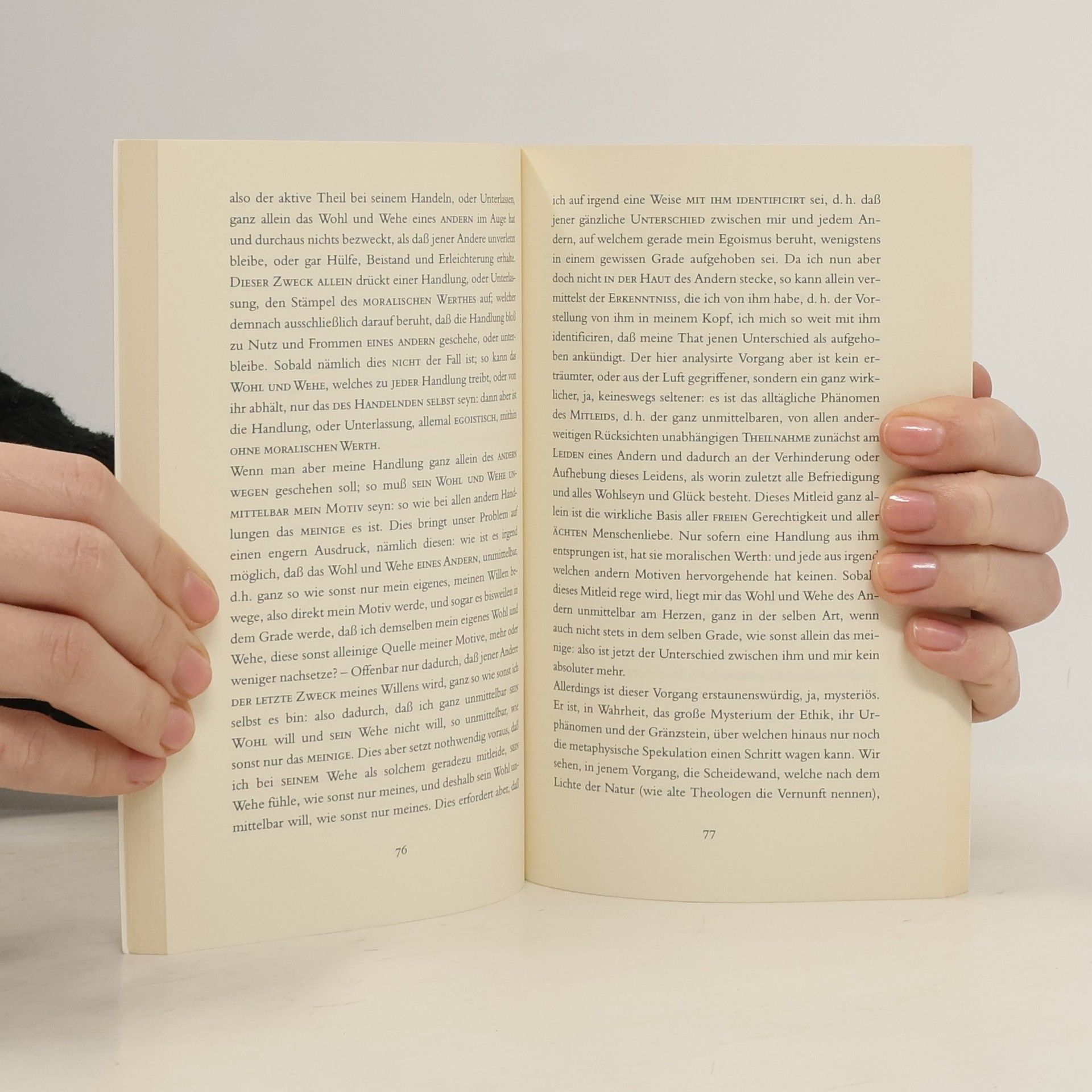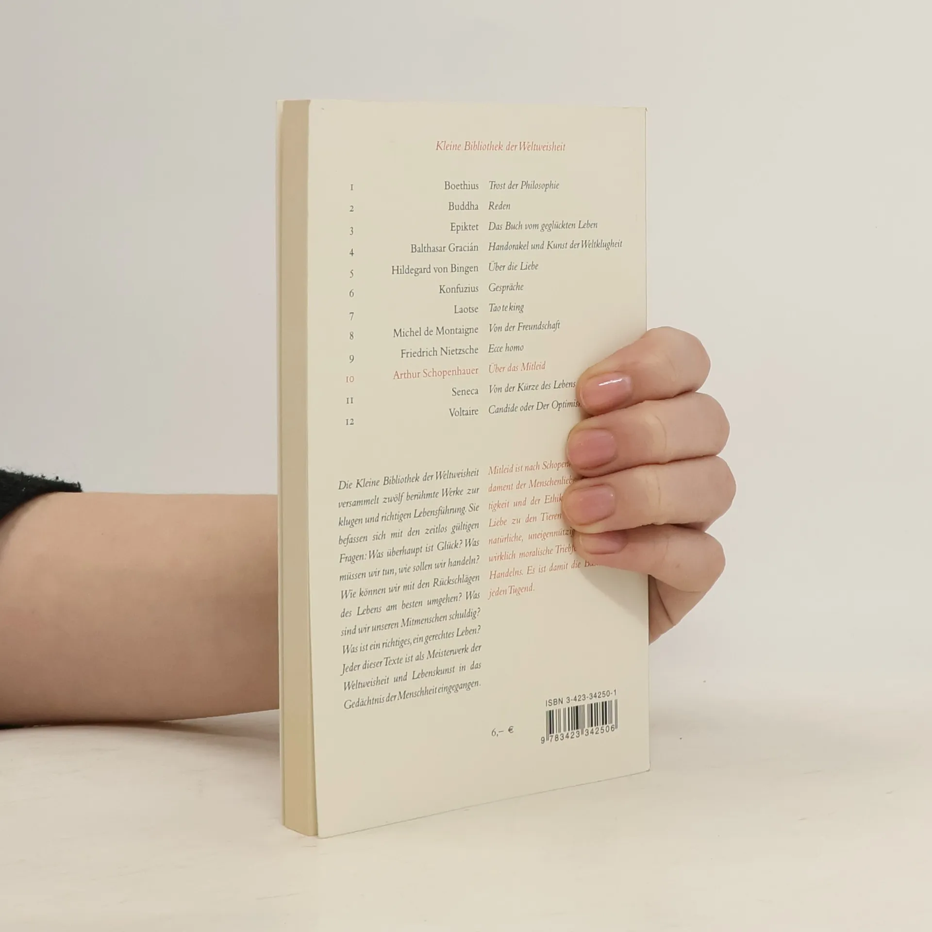 »Das Mitleid hebt die Mauer zwischen Du und Ich auf.« Mitleid ist nach Schopenhauer das Fundament der Menschenliebe, der Gerechtigkeit und der Ethik. Es schließt die Liebe zu den Tieren ein und ist die natürliche, uneigennützige und allein wirklich moralische Triebfeder ethischen Handelns. Es ist damit die Basis einer jeden Tugend. In der von Schopenhauer empfohlenen Haltung des Mitleid-Empfinden-Wollens scheint eine Quelle moralischer Energie verborgen zu sein, die den Menschen bewahren und das noch offene Potential von Toleranz und Solidarität ausschöpfen möchte. Dadurch soll in einer durch zunehmende kulturelle Konflikte gekennzeichneten Gesellschaft Humanität wieder möglich sein. Mit einem Nachwort von Franco Volpi.