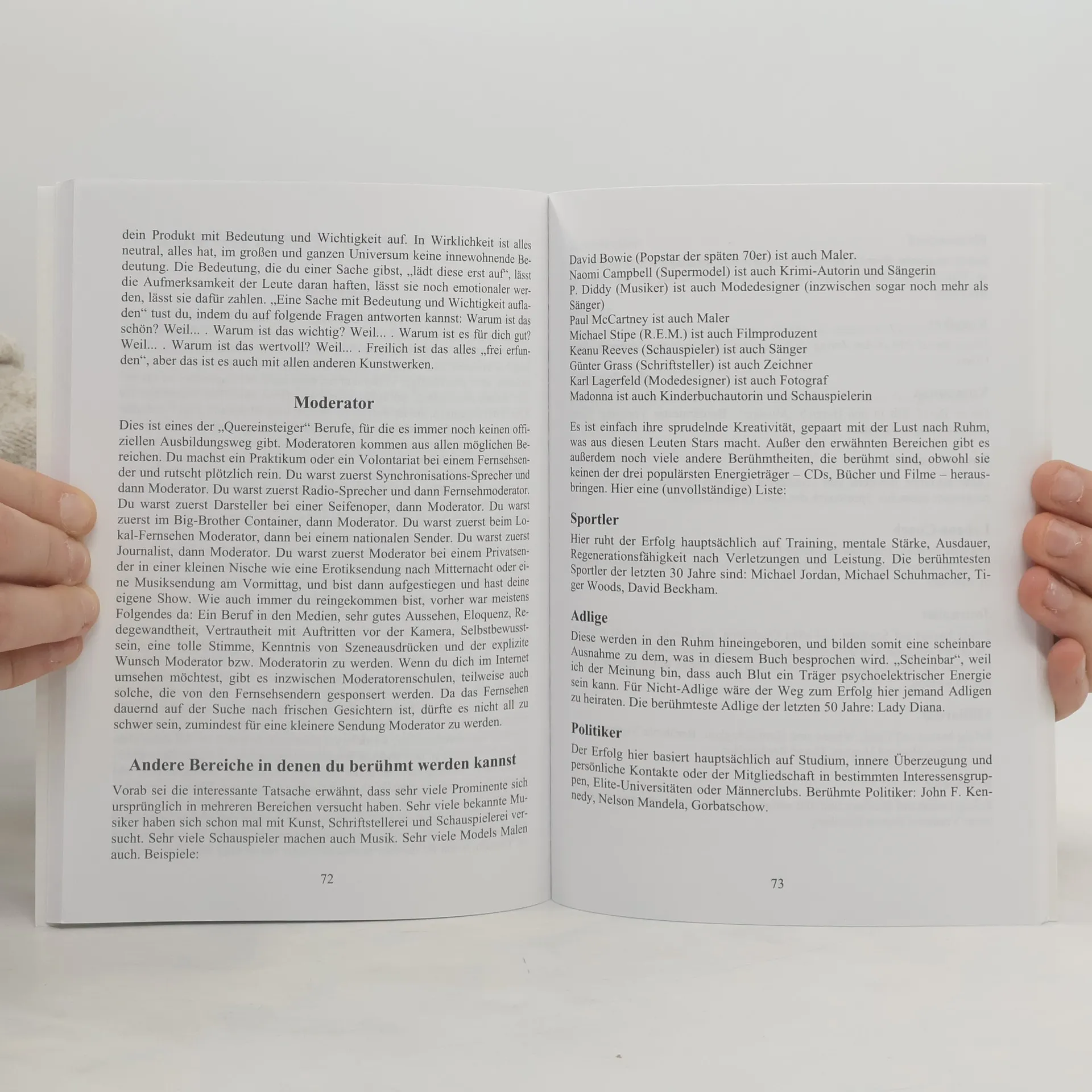 Hast du den Traum, ein Filmstar, Musiker, Model, Künstler oder Fernsehmoderator zu werden? Vielleicht möchtest du auch als Starautor bekannt sein? Wenn du den Wunsch nach Prominenz hegst, wird dieses Buch dein persönlicher Begleiter sein! Um ein Star zu werden, benötigst du nicht nur ein bestimmtes Aussehen, Talent und Disziplin, sondern auch eine emotionale und spirituelle Komponente. Begeisterung, Euphorie, Wohlbefinden, Liebe und Entspanntheit sind die emotionalen Kraftquellen, die dich zu deinem Ziel führen. Diese Emotionen sind nicht das Ende deiner Reise, sondern die Voraussetzung dafür. Du wirst lernen, diese Emotionen in dir selbst zu erzeugen und sie fokussiert auf deine Absichten und Etappenziele zu projizieren. Viele der beschriebenen Techniken können auch in deinem „normalen Job“ angewendet werden. Der Inhalt umfasst verschiedene Wege zum Erfolg in den Bereichen Schauspiel, Musik, Schriftstellerei und anderen kreativen Berufen. Zudem wird auf Themen wie Disziplin, Kreativität, Selbstbestimmung und das Phänomen der Aufmerksamkeit eingegangen. Es ist ein umfassender Leitfaden, der dir helfen kann, deine Träume zu verwirklichen.