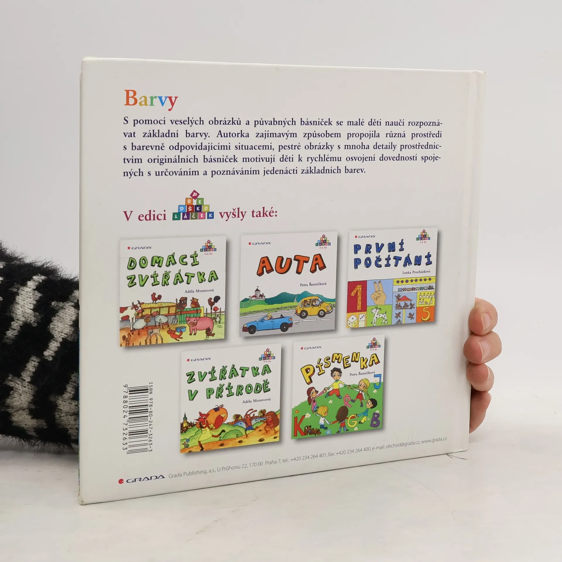 S pomocí veselých obrázků a půvabných básniček se malé děti naučí rozpoznávat základní barvy. Autorka zajímavým způsobem propojila různá prostředí s barevně odpovídajícími situacemi, pestré obrázky s mnoha detaily prostřednictvím originálních básniček motivují děti k rychlému osvojení dovedností spojených s určováním a poznáváním jedenácti základních barev. Nová ediční řada Předškoláček, určená pro děti předškolního věku a jejich rodiče, přináší říkanky, básničky, veselá zvířátka, zajímavé úkoly, to vše vycházející z pravých českých reálií. Naše barevné knížky s veselými obrázky jsou zdrojem zábavy i poučení, mohou se stát odrazovým můstkem na cestě vašich dětí do světa literatury a poznání.