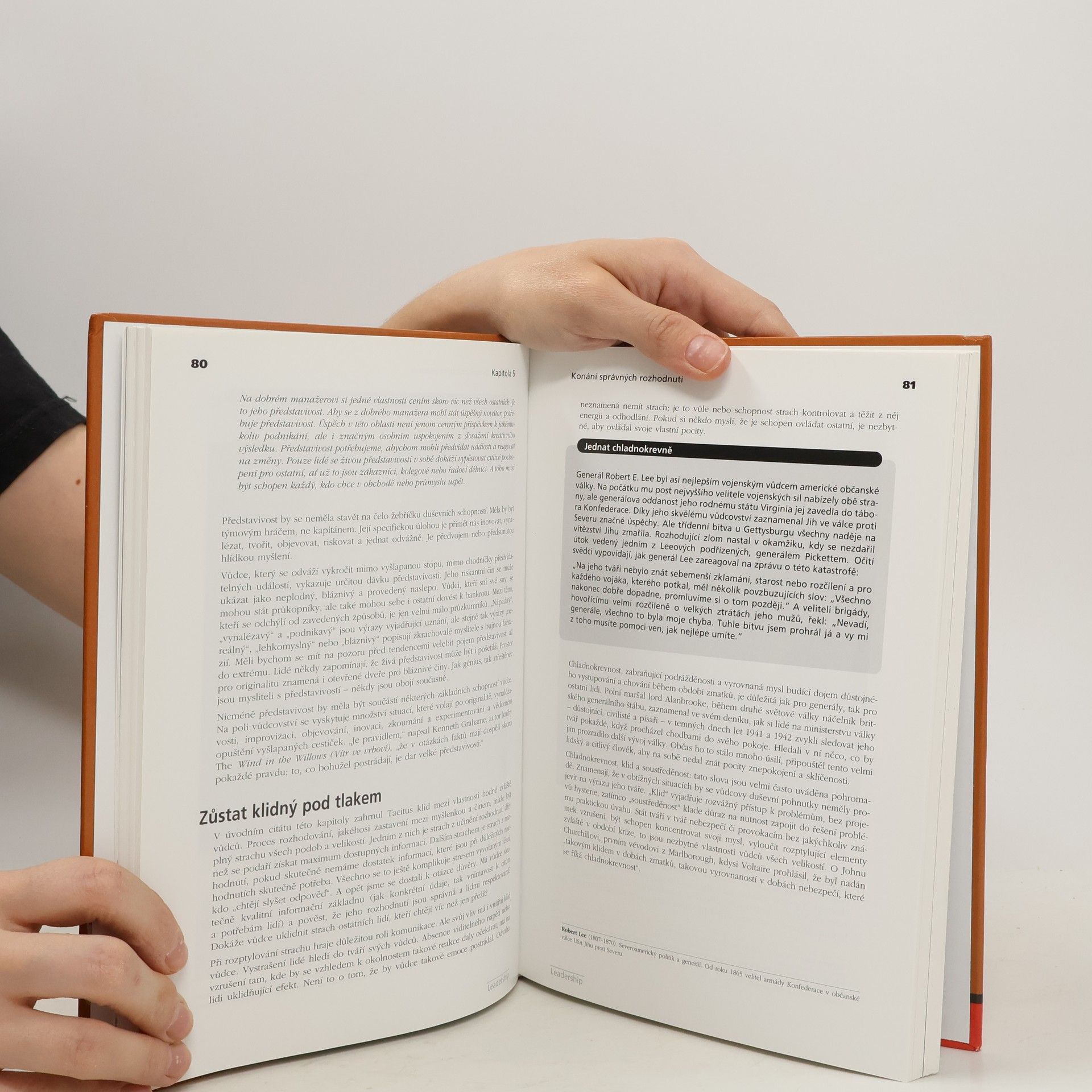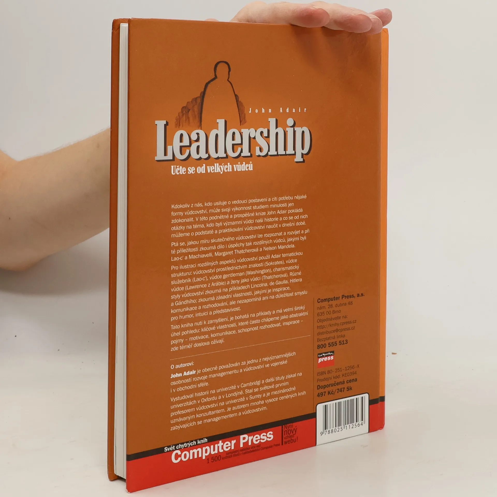 Kdokoliv, kdo usiluje o vedoucí postavení, může svou výkonnost zlepšit studiem minulosti. John Adair v této podnětné knize zkoumá významné vůdce historie a lekce, které nám mohou poskytnout pro současnost. Klade otázky o podstatě a praktikování vůdcovství, přičemž analyzuje dílo a úspěchy různých osobností, jako jsou Lao-c', Machiavelli, Margaret Thatcherová a Nelson Mandela. Adair strukturuje své úvahy podle různých aspektů vůdcovství: vůdcovství prostřednictvím znalostí (Sokrates), vůdce služebník (Lao-c'), vůdce gentleman (Washington), charismatický vůdce (Lawrence z Arábie) a ženy jako vůdci (Thatcherová). Zkoumá různé styly vůdcovství na příkladech Lincolna, de Gaulla, Hitlera a Gándhího a zaměřuje se na klíčové vlastnosti jako inspiraci, komunikaci a rozhodování, ale také na smysl pro humor, intuici a představivost. Tato kniha vyzývá k zamyšlení a je bohatá na příklady, přičemž klíčové vlastnosti, jako motivace a schopnost rozhodovat, ožívají v konkrétních kontextech. John Adair, uznávaný odborník na rozvoj managementu a vůdcovství, je autorem mnoha ceněných knih a byl prvním profesorem vůdcovství na univerzitě v Surrey.
