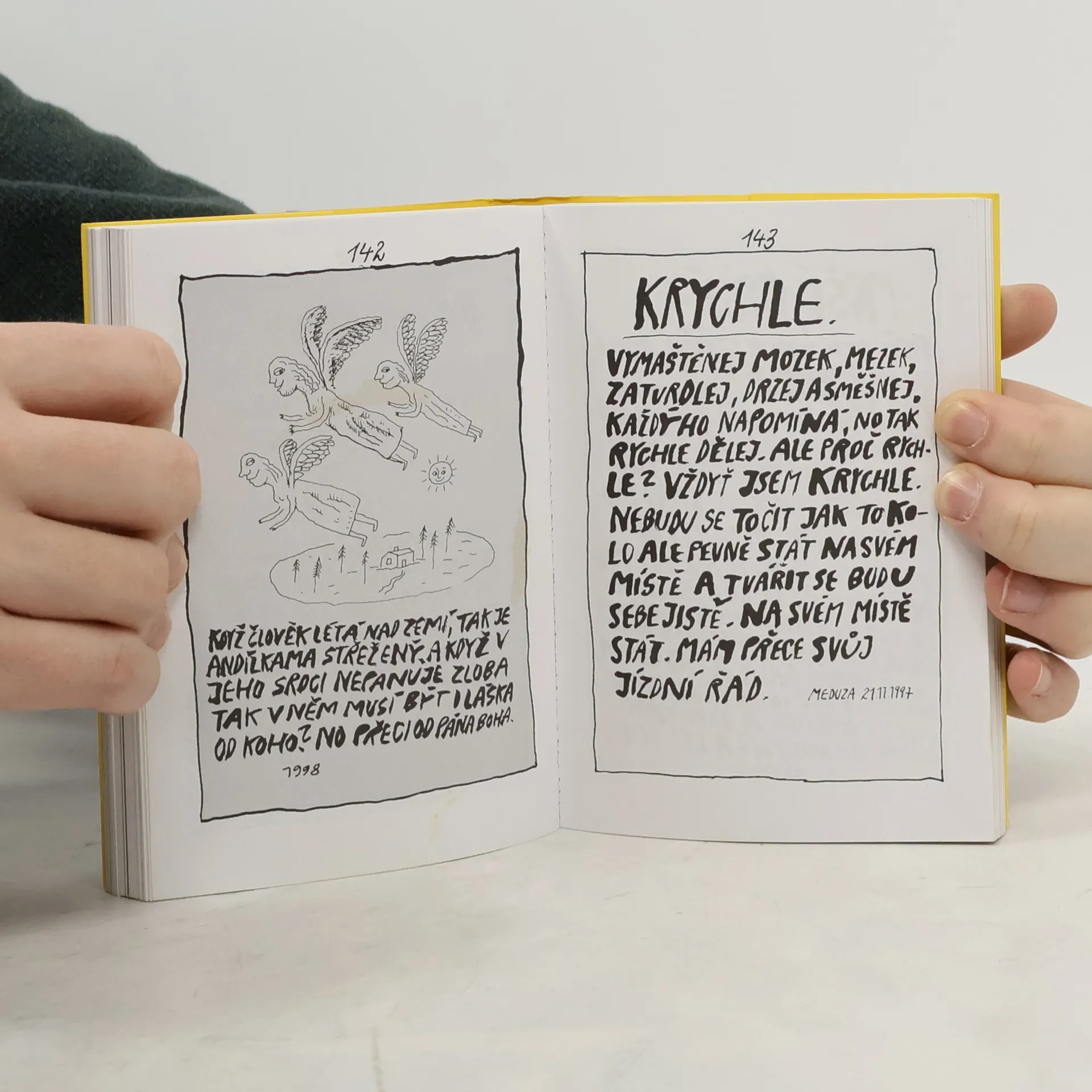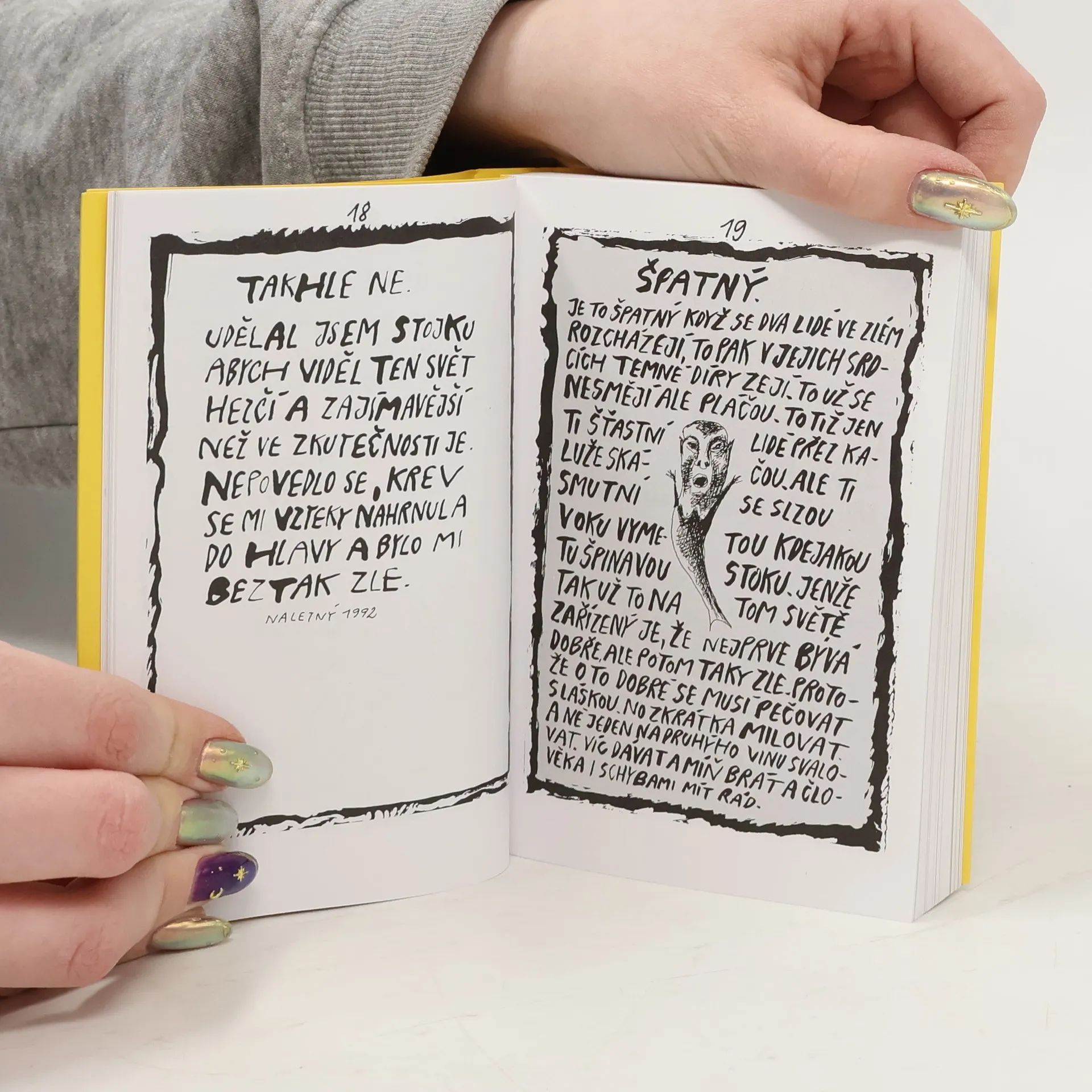 Humorné a satirické verše, doprovázené svéráznou grafickou úpravou a ilustracemi. Nedostatky člověka předkládá autor s jakousi ležérní laskavostí, v níž se projevují i jeho fyziognomické nedostatky. Snad proto člověka zobrazuje jako skřeta v různých pozicích, zahleděného a uzavřeného do sebe a nevnímajícího svět okolo. Autorův jazyk i forma potvrzují jeho velký sklon k jadrné recesi, znásobené ještě záměrnými gramatickými chybami.... celý text