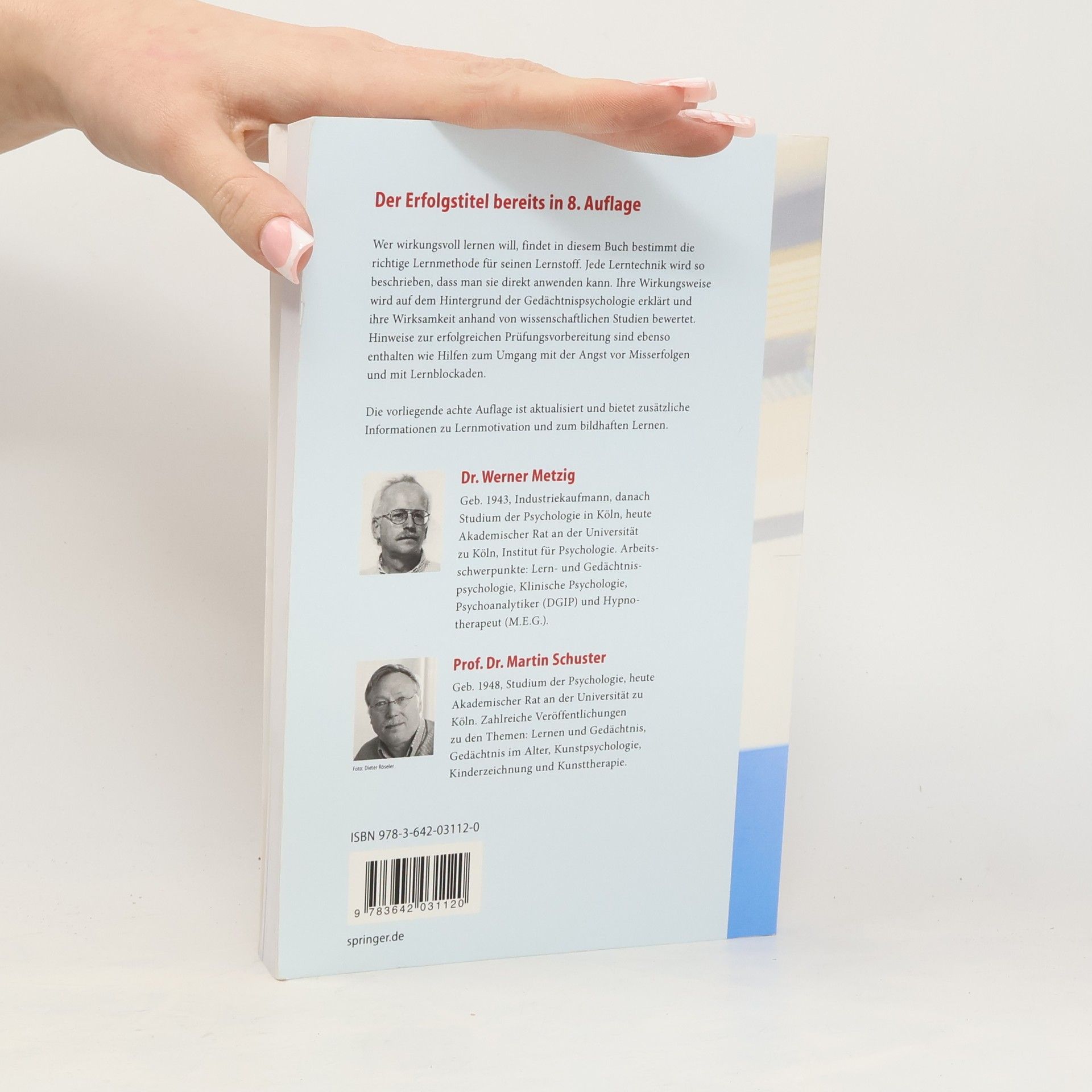 Wer effektiv lernen will, benötigt die passende Lernmethode für den jeweiligen Lernstoff. Die Autoren beschreiben verschiedene Lerntechniken so, dass sie direkt angewendet werden können. Ihre Wirkweise erklären sie gedächtnispsychologisch, die Wirksamkeit wird aufgrund wissenschaftlicher Studien bewertet. Der Band enthält Hinweise zur erfolgreichen Prüfungsvorbereitung und Tipps zum Umgang mit der Angst vor Misserfolgen und mit Lernblockaden. Die 8., aktualisierte Auflage bietet zusätzliche Informationen zur Lernmotivation und zum bildhaften Lernen.