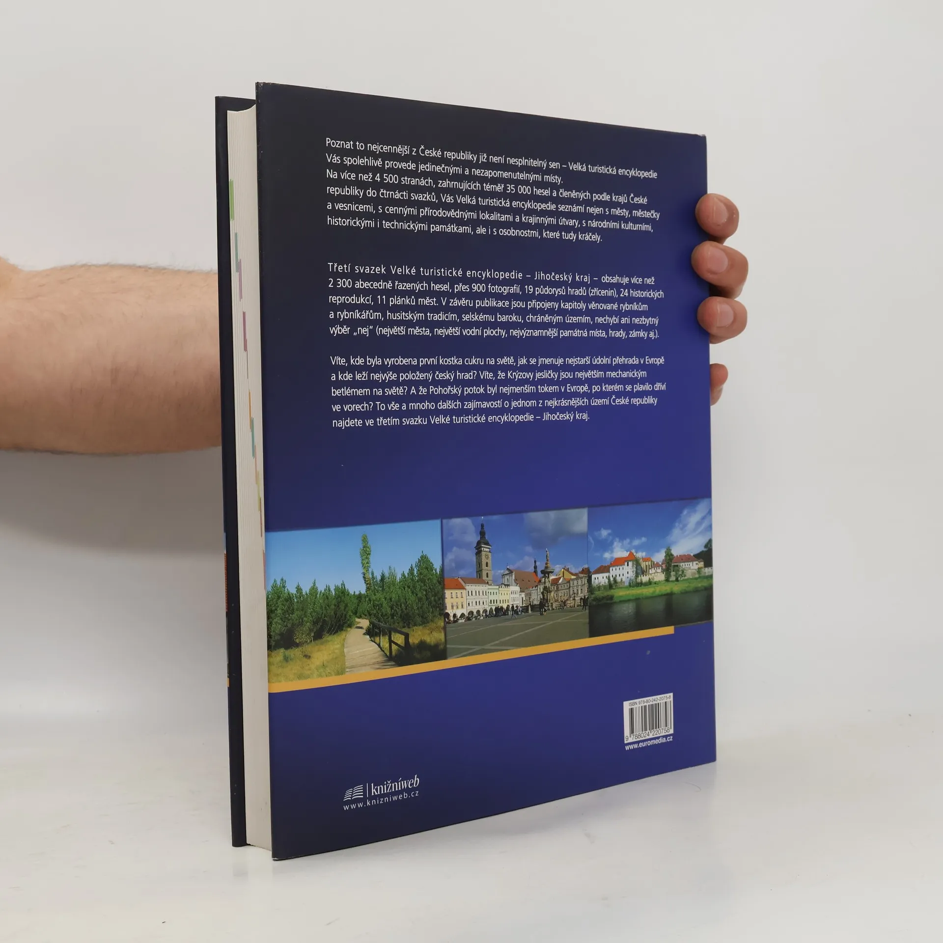 Třetí svazek Velké encyklopedie turistiky, věnovaný Jihočeskému kraji, obsahuje více než 2 300 abecedně řazených hesel, více než 900 fotografií, 19 půdorysů hradů (zřícenin), 24 historických reprodukcí, 11 plánků měst. V závěru publikace jsou kapitoly věnované rybníkům a rybníkářům, husitským tradicím, selskému baroku, chráněným územím, nechybí ani nezbytný výběr "nej" (největší města, největší vodní plochy, nejvýznamnější památná místa, hrady, zámky aj.). Víte, kde byla vyrobena první kostka cukru na světě, jak se jmenuje nejstarší údolní přehrada v Evropě, kde leží nejvýše položený český hrad ? Víte, že Krýzovy jesličky jsou největším mechanickým betlémem na světě ? A že Pohořský potok byl nejmenším tokem v Evropě, po kterém se plavilo dříví ve vorech ? To všechno a množství dalších zajímavostí objevíte ve Velké turistické encyklopedii - Jihočeský kraj.