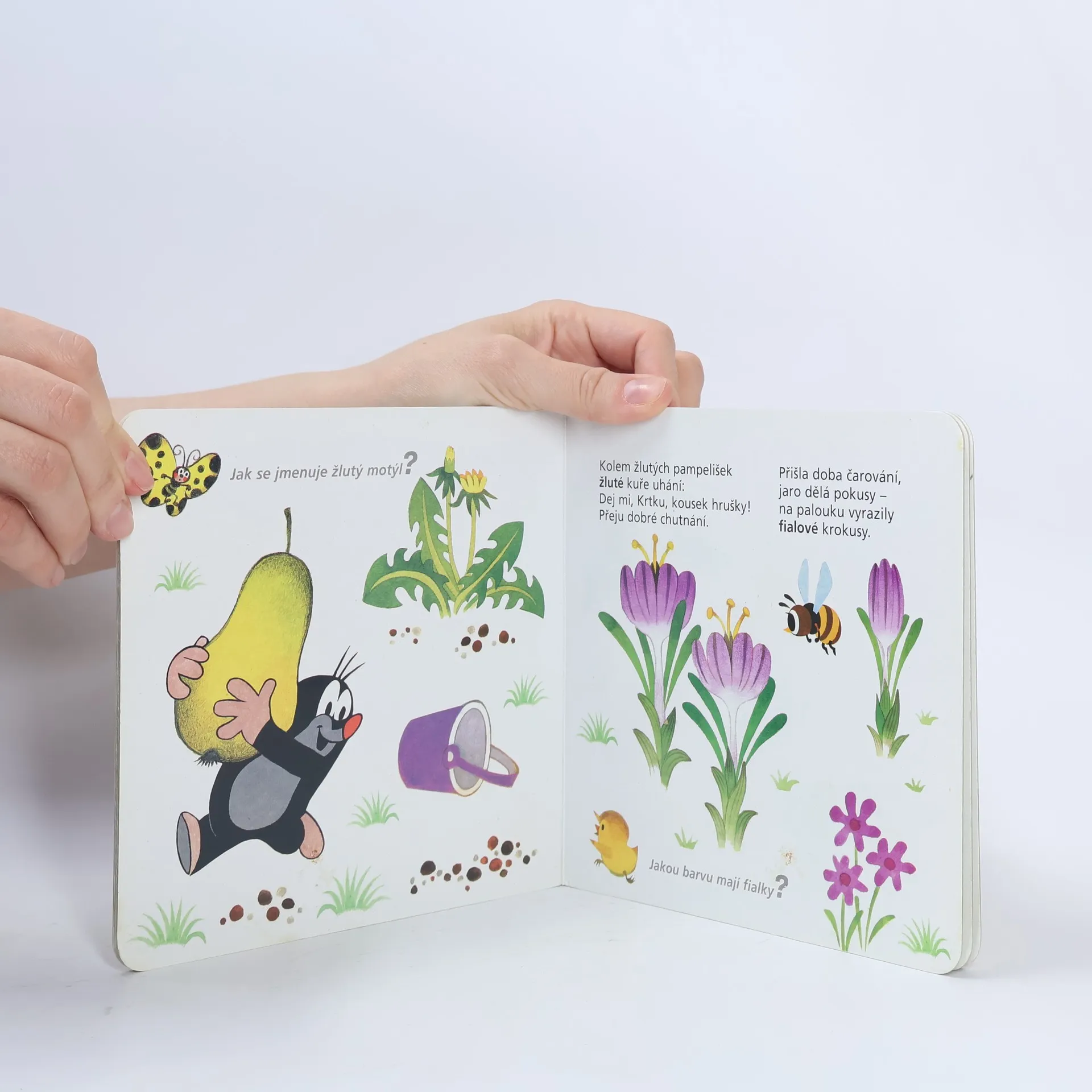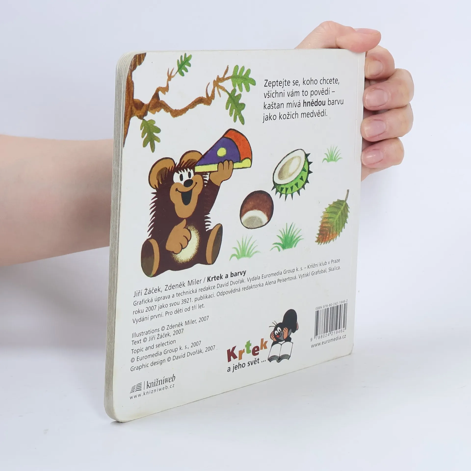 Čtvrtý svazek poznávací řady leporel zavede nejmenší čtenáře do světa barev. S hravými obrázky Zdeňka Milera a jednoduchými vtipnými verši Jiřího Žáčka se děti naučí rozlišovat jednotlivé barvy, které nás obklopují. Učitelem v této škole pro nejmenší je oblíbený Krteček, který si připravil - společně s pejskem, žabkou, mravenečkem, zajícem, medvědem a dalšími kamarády - pro své malé žáčky zvídavé otázky.