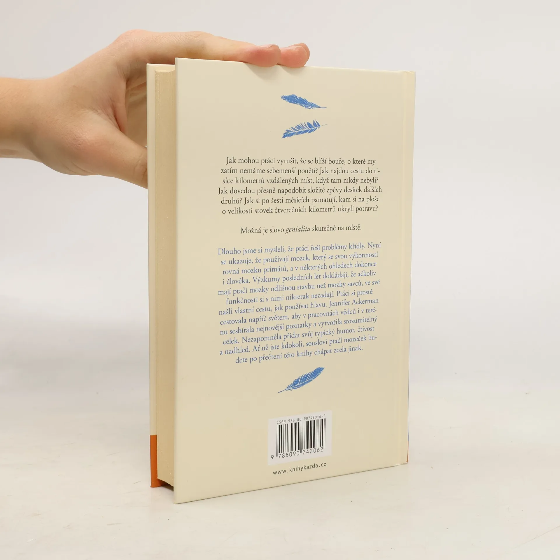 Jak mohou ptáci vytušit, že se blíží bouře, o které my zatím nemáme sebemenší ponětí? Jak najdou cestu do tisíce kilometrů vzdálených míst, když tam nikdy nebyli? Jak dovedou přesně napodobit složité zpěvy desítek dalších druhů? Jak si po šesti měsících pamatují, kam si na ploše o velikosti stovek čtverečních kilometrů ukryli potravu? Možná je slovo genialita skutečně na místě. Dlouho jsme si mysleli, že ptáci řeší problémy křídly. Nyní se ukazuje, že používají mozek, který se svou výkonností rovná mozku primátů, a v některých ohledech dokonce i člověka. Výzkumy posledních let dokládají, že ačkoliv mají ptačí mozky odlišnou stavbu než mozky savců, ve své funkčnosti si s nimi nikterak nezadají. Ptáci si prostě našli vlastní cestu, jak používat hlavu. Jennifer Ackerman cestovala napříč světem, aby v pracovnách vědců i v terénu sesbírala nejnovější poznatky a vytvořila srozumitelný celek. Nezapomněla přidat svůj typický humor, čtivost a nadhled. Ať už jste kdokoli, sousloví ptačí mozeček budete po přečtení této knihy chápat zcela jinak.