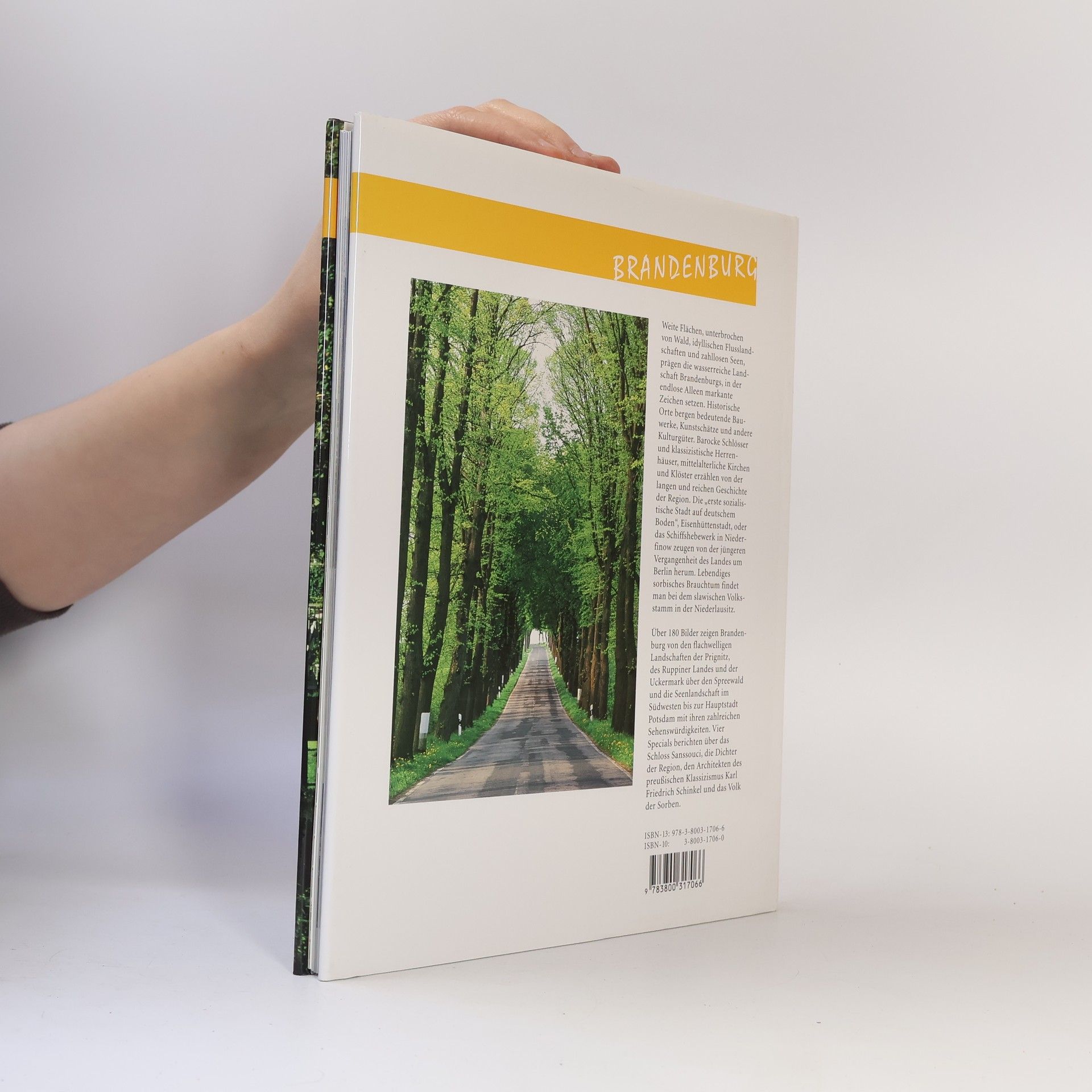 Endlose Alleen – oft schon im 18. Jahrhundert gepflanzt als Straßenmarkierung, Schattenspender und Windschutz – durchziehen als markantes Wahrzeichen die Brandenburger Landschaft. Es ist das gewässerreichste Land der Bundesrepublik Deutschland mit rund 3000 Seen, die im Sommer zu Badevergnügen einladen. Unzählige Kilometer fließende Gewässer zum Paddeln oder einer gemütlichen Kahnfahrt warten nicht nur mit den großen Flüssen Spree und Havel. Die alten Orte der Mark bergen Kleinodien der Baukunst, Kunstschätze und andere Kulturgüter. Historische Stätten, viele Schlösser und Herrenhäuser, über 1500 Kirchen und beeindruckende Klöster wie das mittelalterliche Lehnin und Chorin geben Zeugnis von der bedeutenden Geschichte der Region. Über 200 Bilder zeigen Brandenburg mit seinen Regionen Prignitz, Uckermark, Neumark, Havelland, Mittelmark, Spreewald und Niederlausitz in seiner ganzen Vielfalt. Vier Specials berichten über die Dichter der Region, über die slawische Volksgruppe der Sorben, über die Schlossanlage Sanssouci und den Baumeister des preußischen Klassizismus: Karl Friedrich Schinkel.