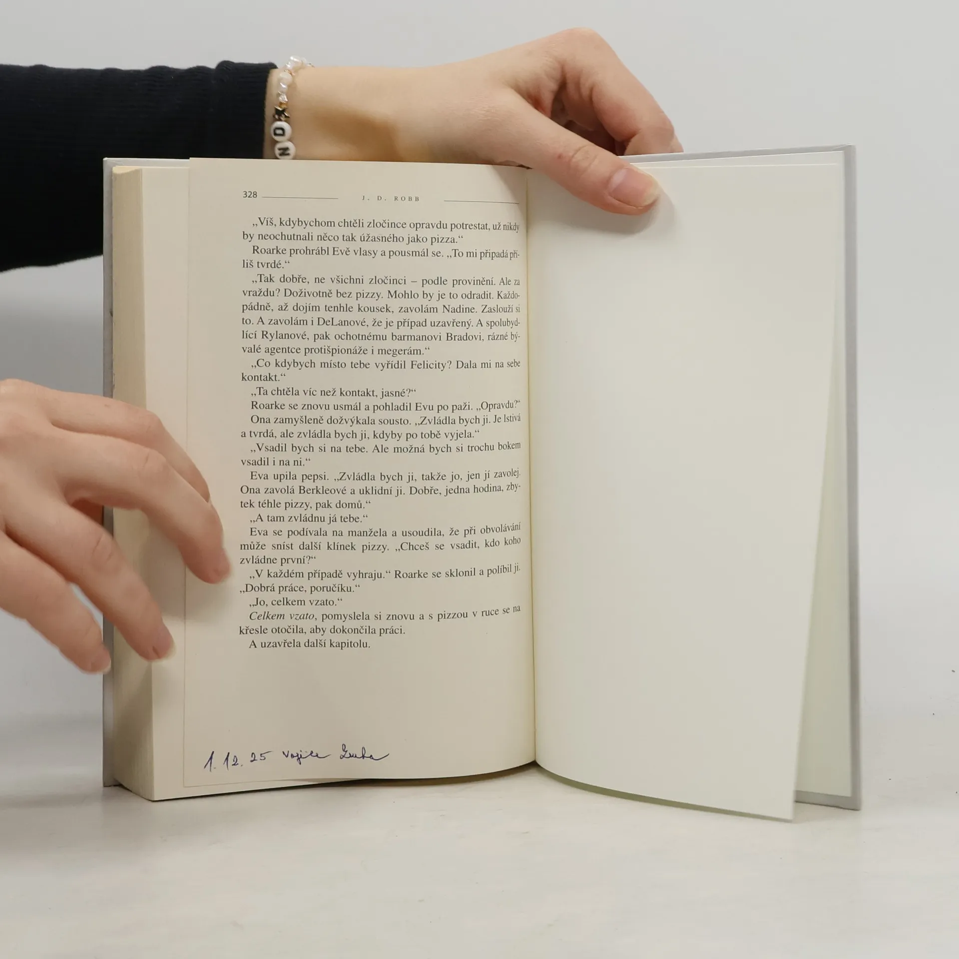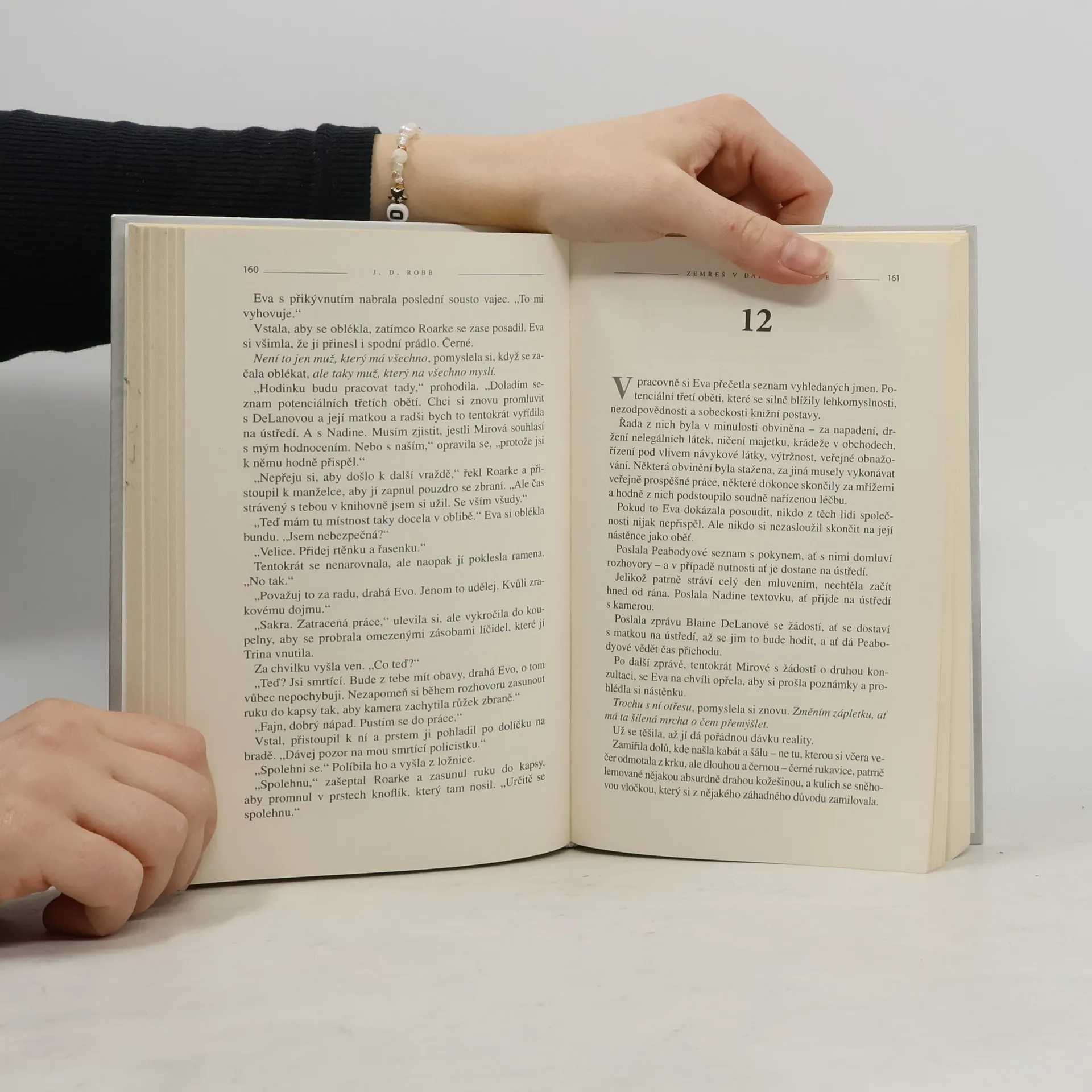 Při vyšetřování vraždy obdrží policistka Eva Dallasová tip z nečekaného zdroje – od autorky thrillerů, která zločin poznává ze stránek vlastní knihy. Eva se stulí s kocourem u krbu a čte, jenže čas ubíhá rychle, a pokud se zločinec opravdu inspiroval v knize, jedná se teď teprve o druhou kapitolu v dlouhé sérii.