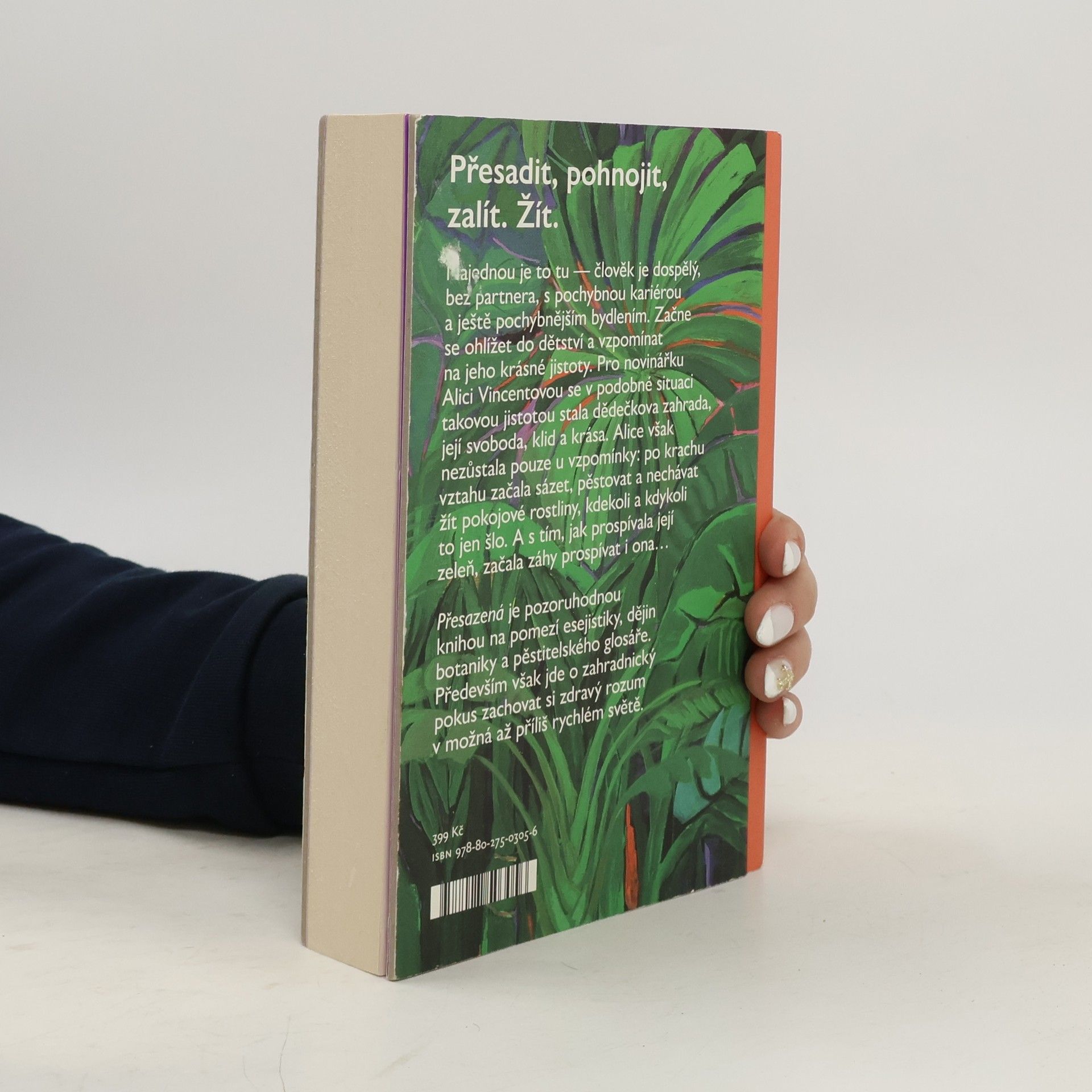 Zalít, pohnojit, přesadit. Žít. Najednou je to tu — člověk je dospělý, bez partnera, s pochybnou kariérou a ještě pochybnějším bydlením. Začne se ohlížet do dětství a vzpomínat na jeho krásné jistoty. Pro novinářku Alici Vincentovou se v podobné situaci takovou jistotou stala dědečkova zahrada, její svoboda, klid a krása. Nezůstala však u vzpomínky: po krachu vztahu začala sázet, pěstovat a nechávat žít pokojové rostliny, kdekoli a kdykoli to jen šlo. A s tím, jak prospívaly její rostliny, záhy začala prospívat i ona… Přesazená je pozoruhodnou knihou na pomezí esejistiky, dějin botaniky a pěstitelského glosáře. Především však jde o zahradnický pokus zachovat si zdravý rozum v možná až příliš rychlém světě.