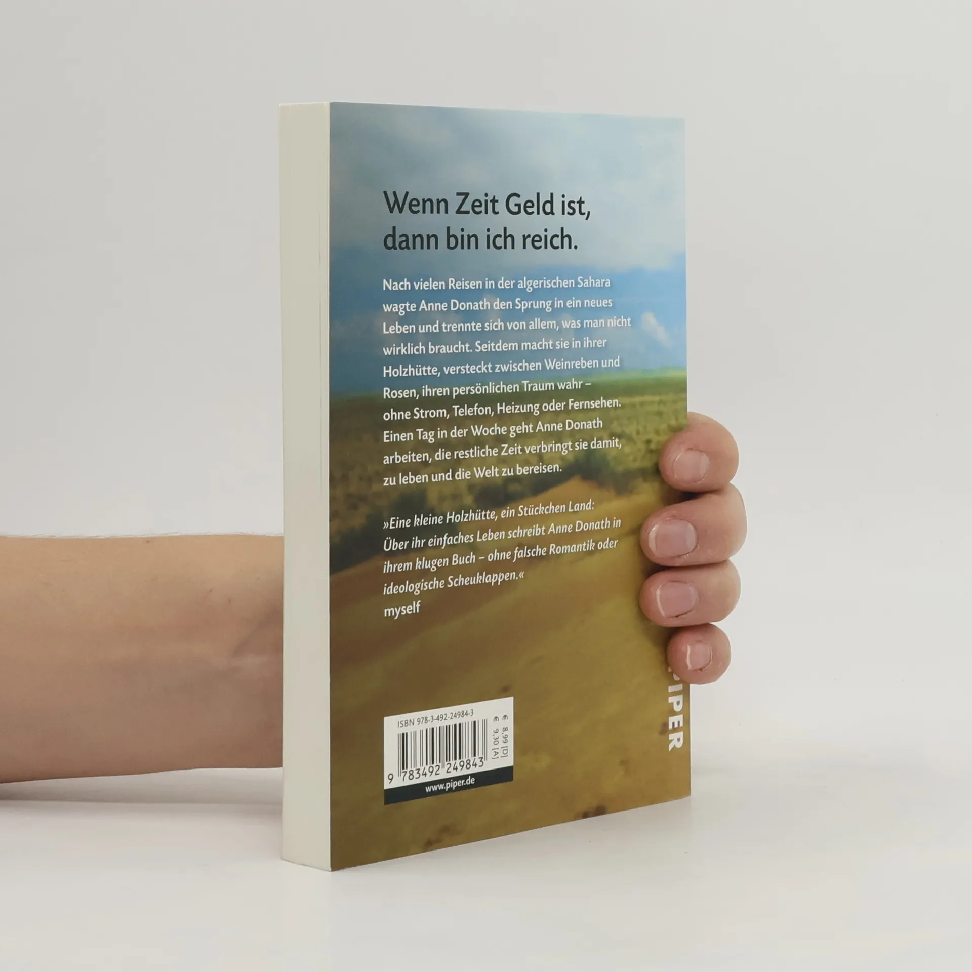 Nach vielen Reisen in der algerischen Sahara wagte Anne Donath den Sprung in ein neues Leben und trennte sich von allem, was man nicht wirklich braucht. Seitdem macht sie in ihrer Holzhütte, versteckt zwischen Weinreben und Rosen, ihren persönlichen Traum wahr – ohne Strom, Telefon, Heizung und Fernsehen. Einen Tag in der Woche geht Anne Donath arbeiten, die restliche Zeit verbringt sie damit, zu leben und die Welt zu bereisen.