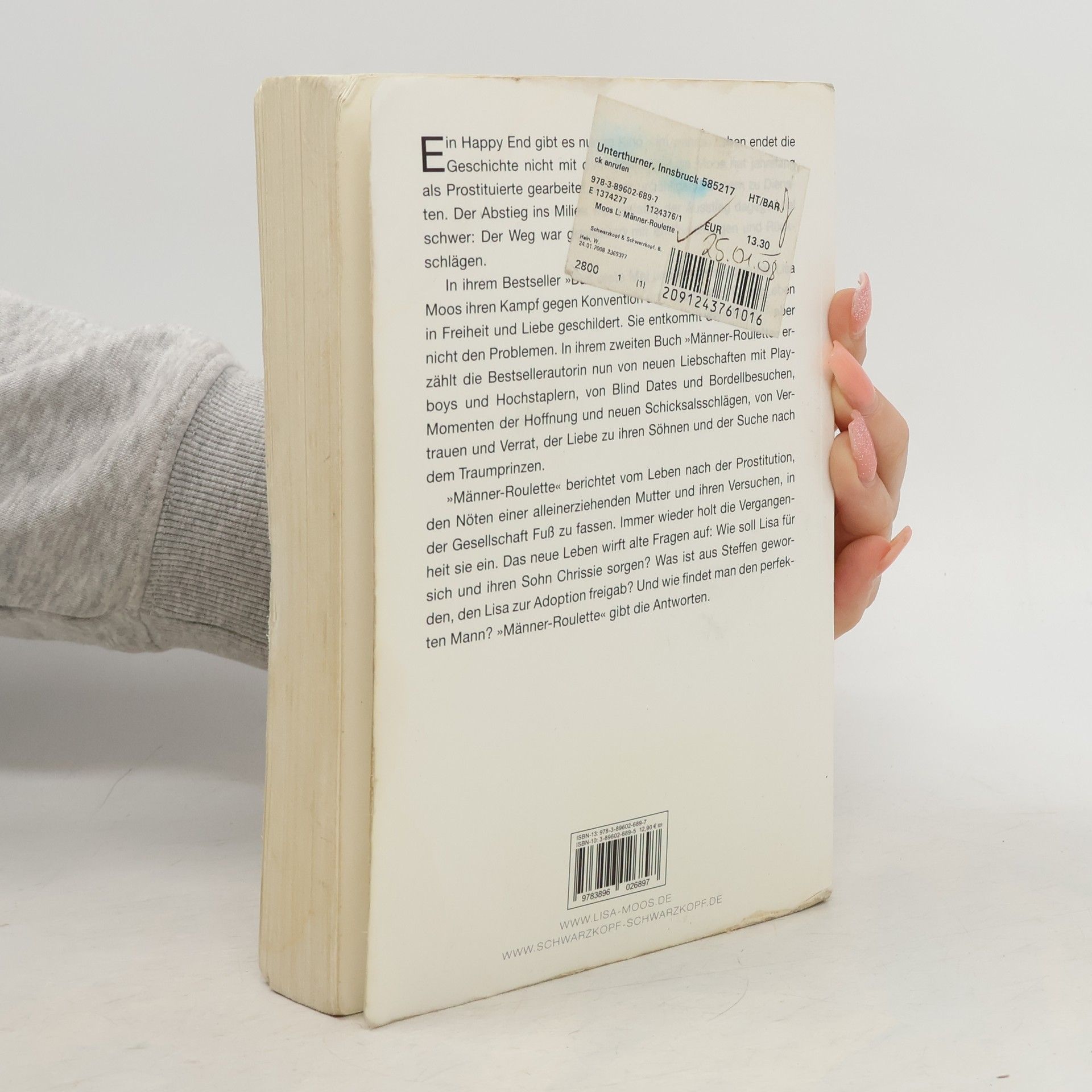 In »Das erste Mal und immer wieder« erzählt Lisa Moos offen von ihren Erfahrungen als Prostituierte, von den Höhen und Tiefen des Rotlichtmilieus und der käuflichen Liebe. Sie hat Leidenschaft, Perversion, Erniedrigung sowie Freundschaft, Hoffnung und Liebe erlebt. Auf der Suche nach der großen Liebe möchte sie diese Welt hinter sich lassen, doch der Weg zu einem bürgerlichen Leben gestaltet sich schwierig. »Männer-Roulette« setzt die fesselnde Autobiografie fort und beleuchtet das Zerbrechen ihrer Hoffnungen auf eine neue Beziehung sowie den Überlebenskampf in einer Gesellschaft, die keinen Makel duldet und jeden Fehltritt bestraft. Trost findet Lisa bei einem attraktiven Geschäftsmann, der sich als Betrüger entpuppt. Es folgen zahlreiche kurze, leidenschaftliche Affären, die allesamt scheitern. Finanzielle Sorgen belasten sie zusätzlich. Kann sie den gesellschaftlichen Erwartungen gerecht werden, und will sie das überhaupt? Immer wieder stößt sie auf Hindernisse, die ein bürgerliches Leben erschweren, und mehrmals droht sie, in ihr altes Milieu zurückzufallen. Das aufregende Leben im Rotlicht erscheint oft vertrauter als der graue Alltag. Lisa beginnt, ihre Wünsche zu hinterfragen. Als ehemalige Prostituierte hat sie eigene Vorstellungen von Glück und setzt unkonventionelle Mittel ein, um ihre Ziele zu erreichen. Mit Lebenslust schildert sie ihre Suche nach Liebe und Erfüllung.