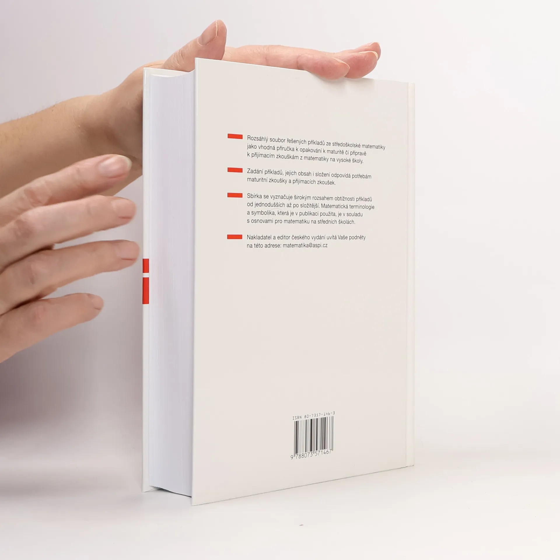 Publikace obsahuje rozsáhlý soubor řešených příkladů ze středoškolské matematiky, který lze využít při opakování k maturitě či přípravě k přijímacím zkouškám z matematiky na vysoké školy. Uchazeč o studium má tak k dispozici ucelené skupiny řešených příkladů z jednotlivých tématických celků s tím, že publikace obsahuje typy a druhy příkladů potřebné k úspěšnému zvládnutí testu z matematiky. Řešení příkladů jsou úplná, v případě potřeby je uveden také popis postupu. Sbírka se vyznačuje širokým rozsahem obtížnosti příkladů od jednodušších až po složitější. Matematická terminologie a symbolika, která je v ní použita, je v souladu s osnovami pro matematiku na středních školách. 2., doplněné a rozšířené vydání.