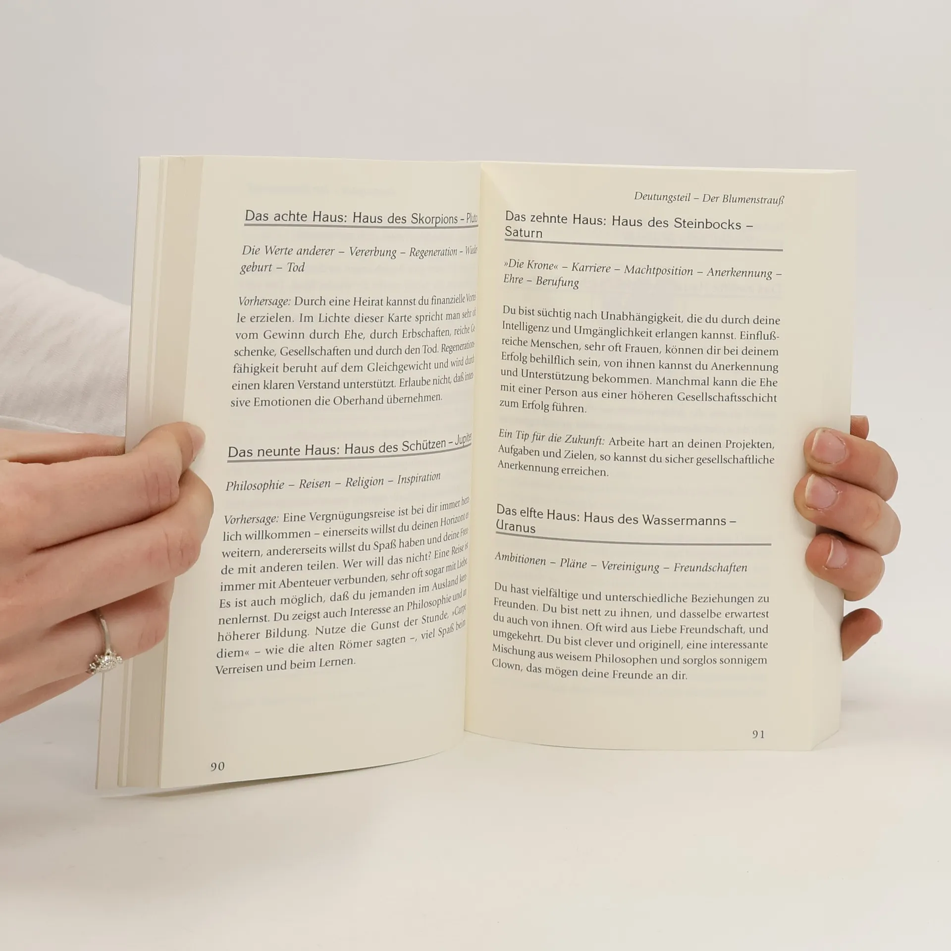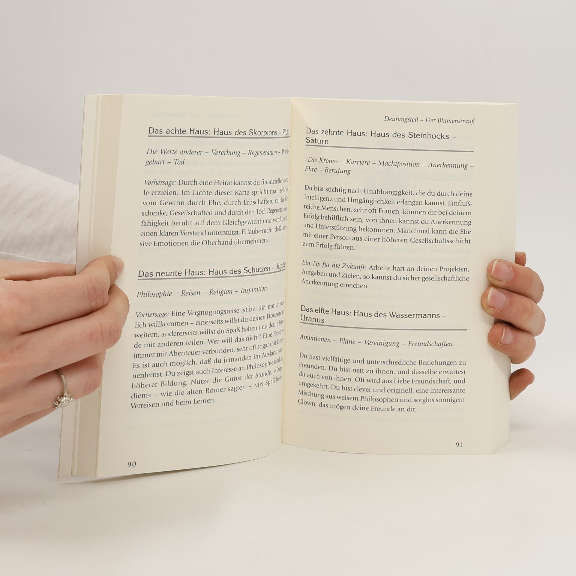 Dieses Buch verbindet die Technik des Kartenlegens mit der Astrologie. Die 12 zunächst gezogenen Karten stehen für die einzelnen Planeten und werden in die 12 Häuser des astrologischen Systems gelegt; jedes der Häuser verkörpert ein bestimmtes Lebensthema wie Beruf, Familie oder das eigene Ich. So erhält der Praktizierende eine Momentaufnahme seines seelischen Weges, außerdem Hinweise darauf, welche Aufgaben und Ereignisse auf ihn zukommen können. Der Leser erhält zudem eine umfassende Einführung in die Systematik der Häuser.