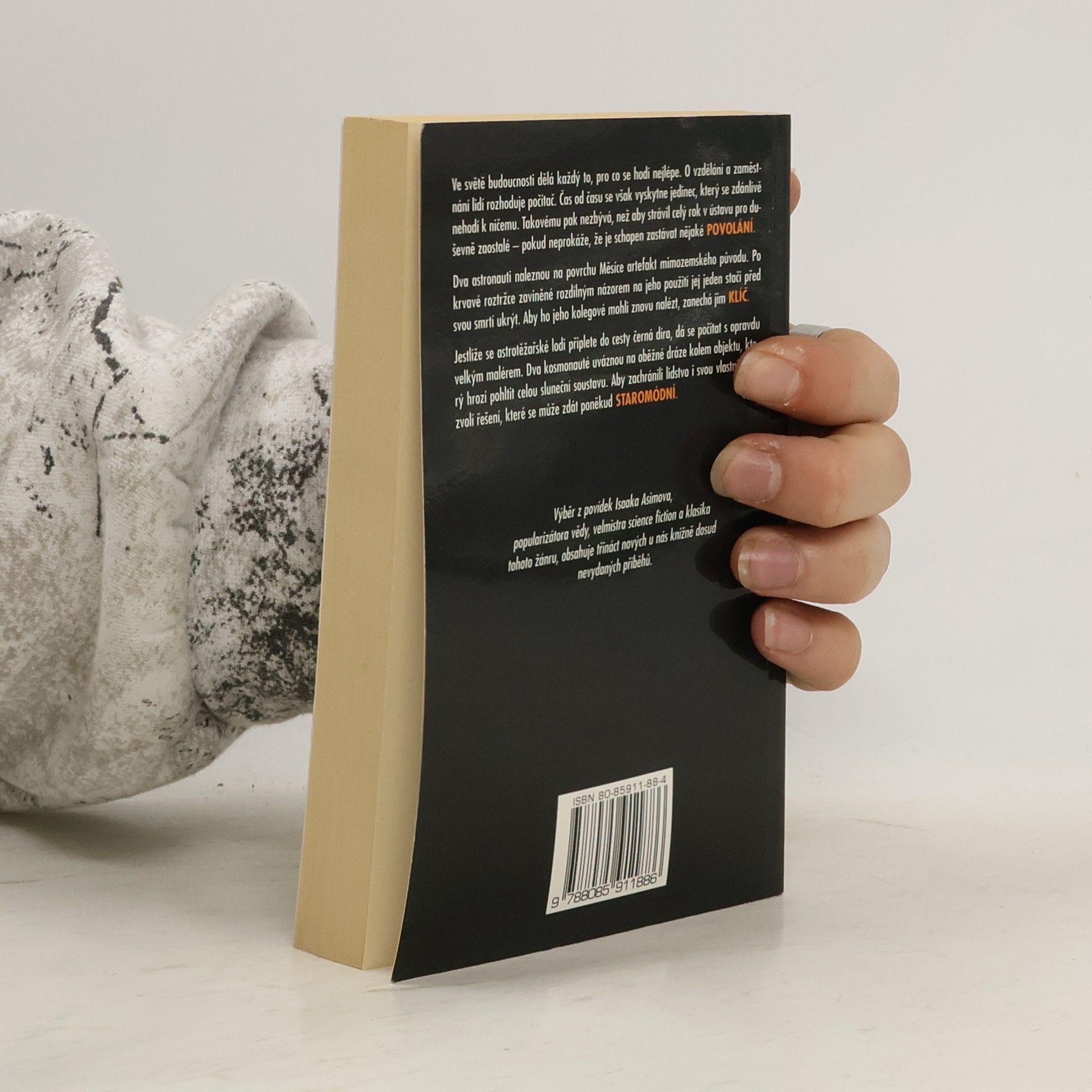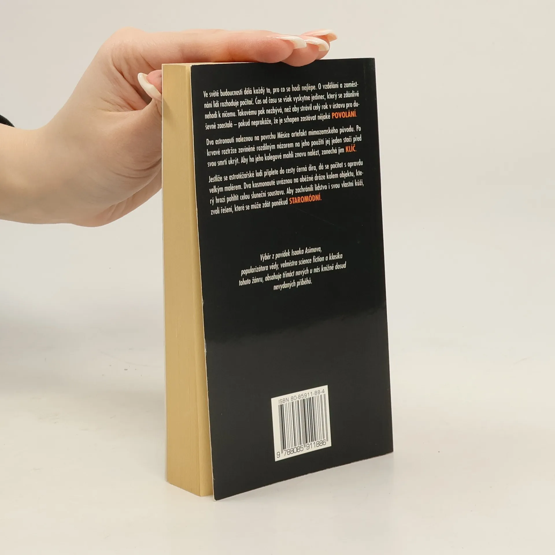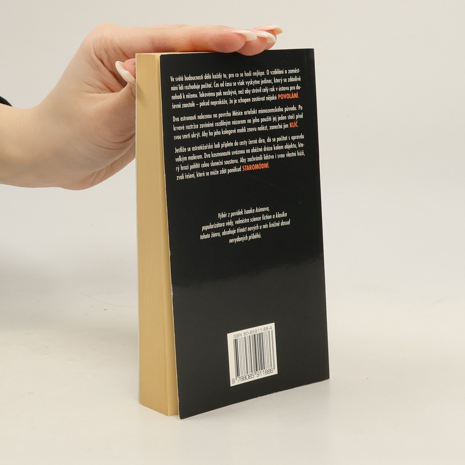 Dva astronauti naleznou na povrchu Měsíce artefakt mimozemského původu. Po krvavé roztržce zaviněné rozdílným názorem na jeho použití jej jeden stačí před svou smrtí ukrýt. Aby ho jeho kolegové mohli znovu nalézt, zanechá jim klíč… Jestliže se astrotěžařské lodi připlete do cesty černá díra, dá se počítat s opravdu velkým malérem. Dva kosmonauté uváznou na oběžné dráze kolem objektu, který hrozí pohltit celou sluneční soustavu. Aby zachránili lidstvo i svou vlastní kůži, zvolí řešení, které se může zdát ponědud staromódní… Ve světě budoucnosti dělá každý to, pro co se hodí nejlépe. O vzdělání a zaměstnání lidí rozhoduje počítač. Čas od času se však vyskytne jedinec, který se zdánlivě nehodí k ničemu. Takovému pak nezbývá, než aby strávil celý rok v ústavu pro duševně zaostalé – pokud neprokáže, že je schopen zastávat nějaké povolání… Výběr z povídek Isaaka Asimova, popularizátora vědy, velmistra science fiction a klasika tohoto žánru, obsahuje třináct nových u nás knižně dosud nevydaných příběhů. Vybrali a sestavili Miroslav Kocián a Bohuslav Svoboda. -- zdroj: legie.info --