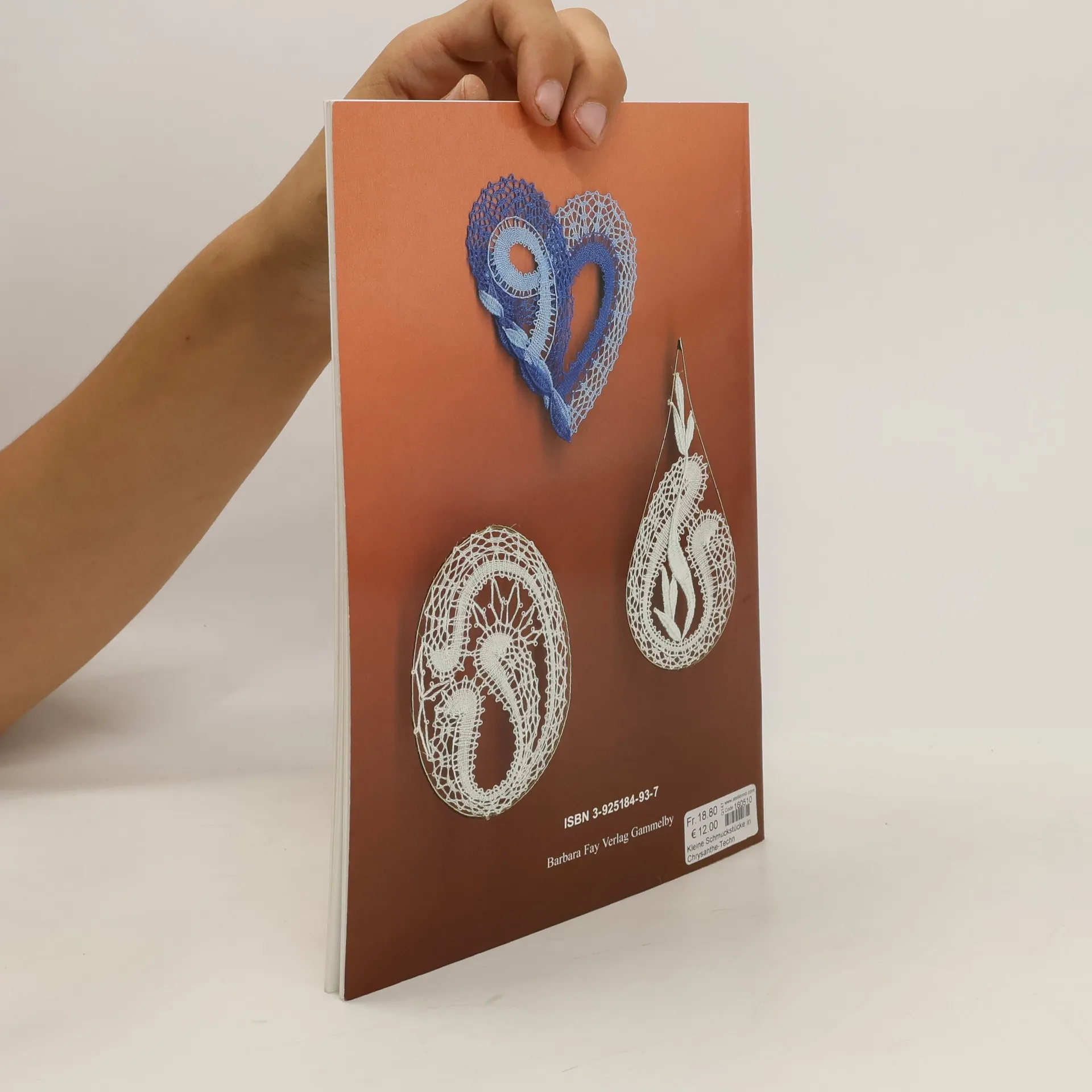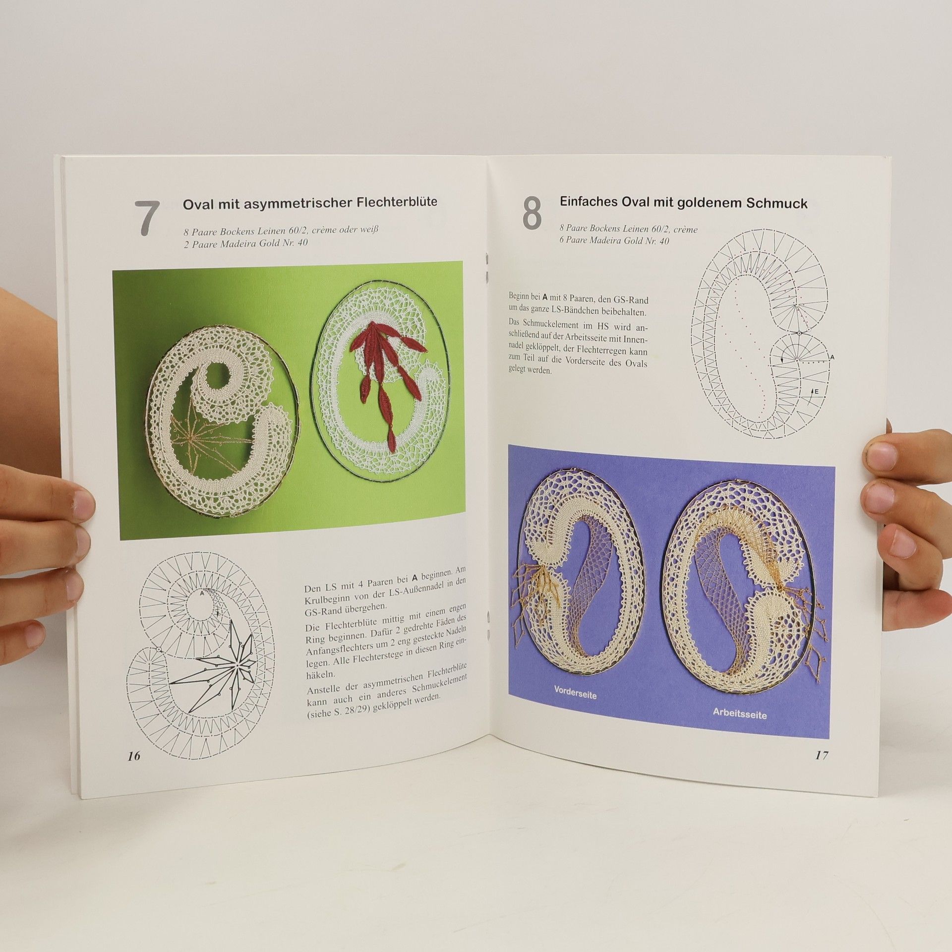 Vor einigen Jahren wurde die Chrysanthe-Technik wiederbelebt und hat seitdem viele Liebhaber gefunden, lassen sich doch in dieser Technik mit verhältnismäßig wenigen Paaren zarte und recht elegante Entwürfe gestalten. Hildegard Glös, Kursleiterin in Berlin, hat hier ein Heft mit 18 kleinen Entwürfen zusammengestellt, jeweils 6 in Tropfen-, Oval- und Herzform (ca. 8–11 cm hoch). Eine kurze Einführung in die Technik erklärt Ihnen die wesentlichen Besonderheiten der Chrysanthe. Es folgen die Muster, jeweils mit Farbabbildung, Brief und den nötigen Paar- und Garnangaben. – Nett, klein und handlich: ideal zum Schnuppern!