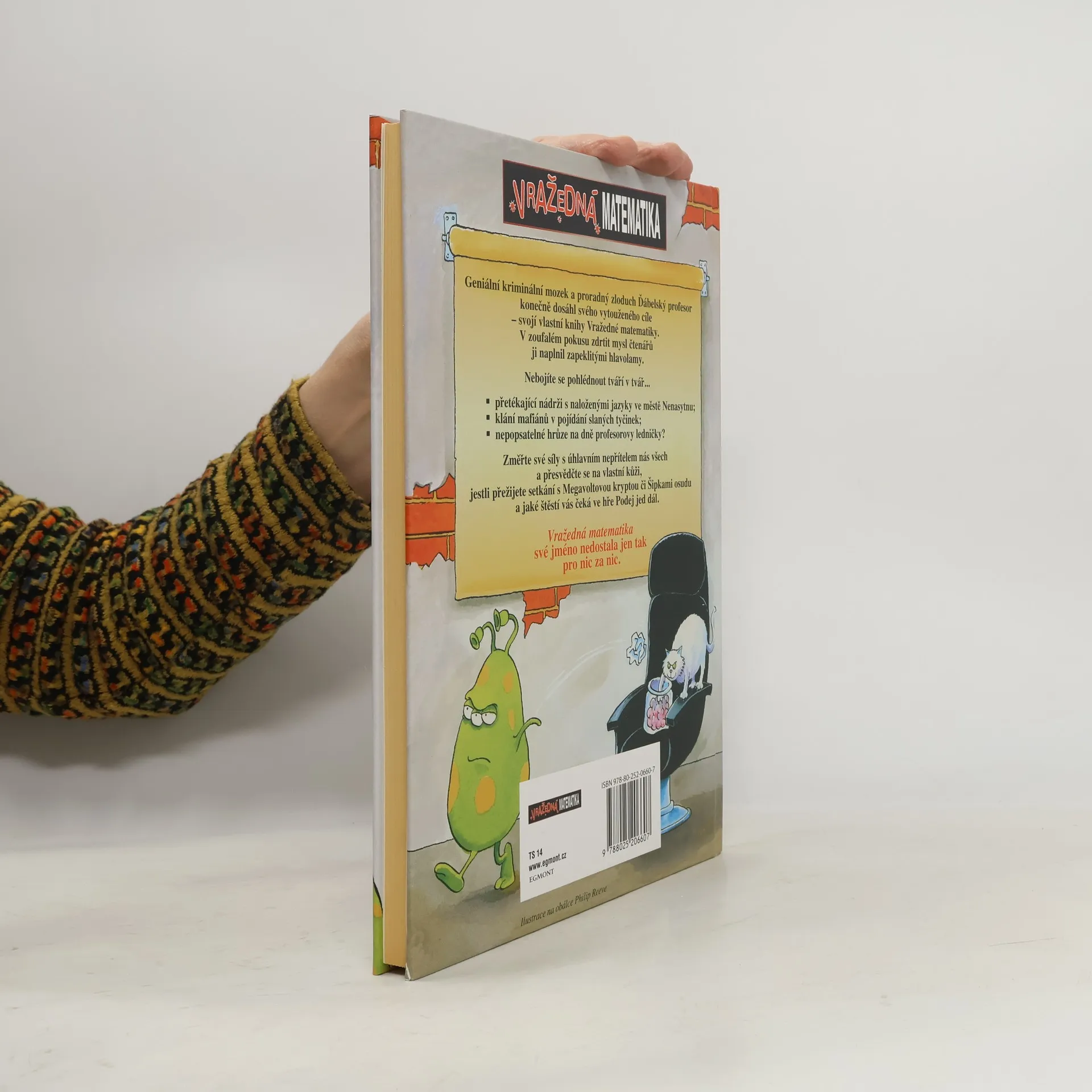 Geniální kriminální mozek a proradný zloduch Ďábelský profesor konečně dosáhl svého vytouženého cíle – své vlastní knihy Vražedné matematiky. V troufalém pokusu zdrtit mysl čtenářů naplnil ji zapeklitými hlavolamy. Setkáte se v ní s přetékající nádrží s naloženými jazyky ve městě Nenasytnu, budete svědky klání mafiánů za úsvitu v pojídání slaných tyčinek a možná vás zachvátí i nepopsatelná hrůza z toho, co se skrývá na dně profesorovy ledničky? Změřte své síly s úhlavním nepřítelem nás všech a přesvědčte se na vlastní kůži, jestli přežijete setkání s Megavoltovou kryptou či Šipkami osudu a jaké štěstí vás čeká ve hře Podej jed dál. Vražedná matematika své jméno nedostala jen tak pro nic za nic.