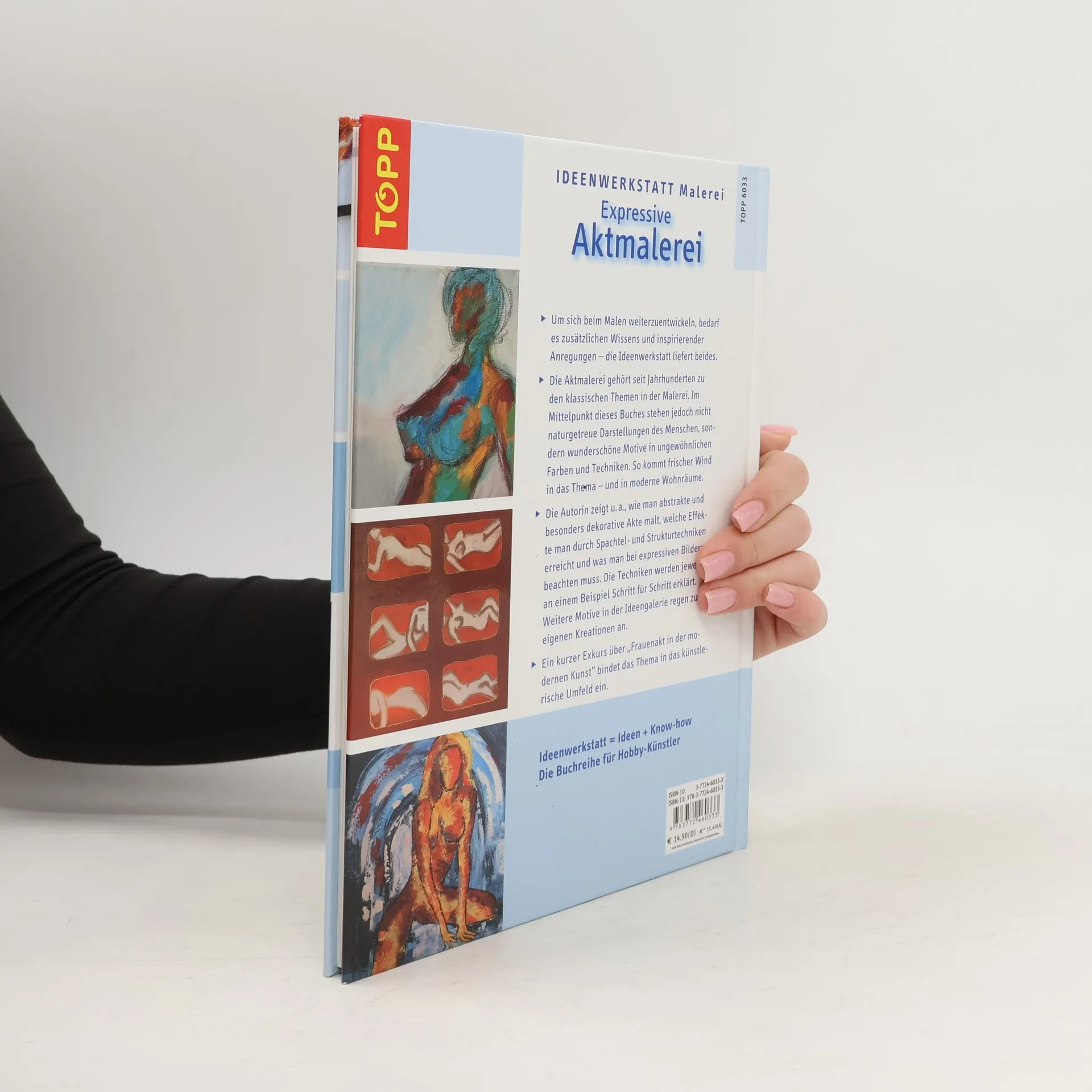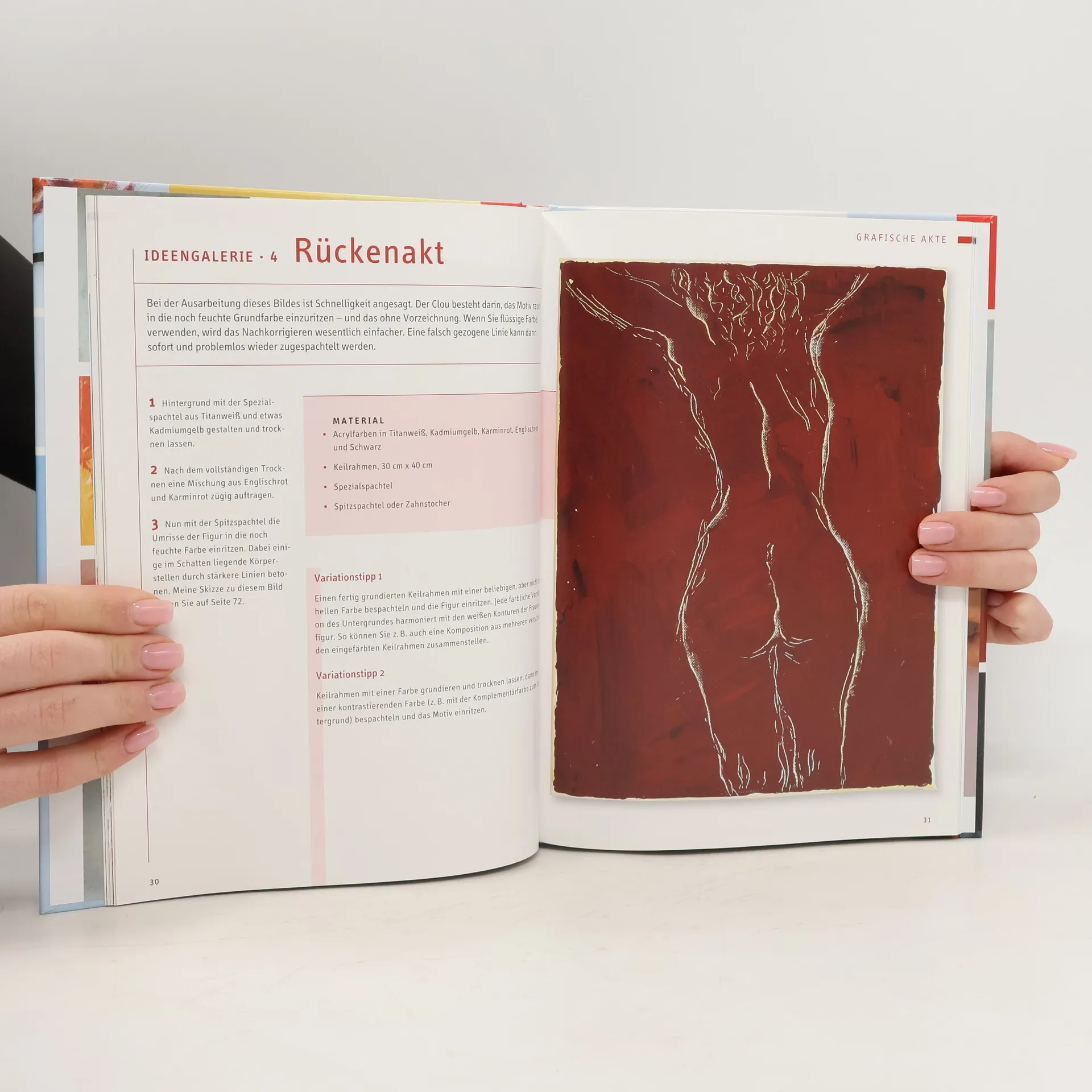 Im Mittelpunkt des Buches stehen faszinierende Akt-Motive in ungewöhnlichen Farben und Techniken. Die Autorin zeigt u. a., wie man abstrakte Akte malt, welche Effekte man durch Spachtel- und Strukturtechniken erreicht und was man bei expressiven Bildern beachten muss. Die Techniken werden jeweils an einem Beispiel Schritt für Schritt erklärt. Weitere Bilder in der Ideengalerie stellen die stilistischen Möglichkeiten dar und inspirieren zu eigenen Kreationen. Ein kurzer Exkurs über „Frauenakt in der modernen Kunst“ bindet das Thema in das künstlerische Umfeld ein. 80 Seiten, 19 x 26,5 cm, Hardcover, Skizzen im Buch