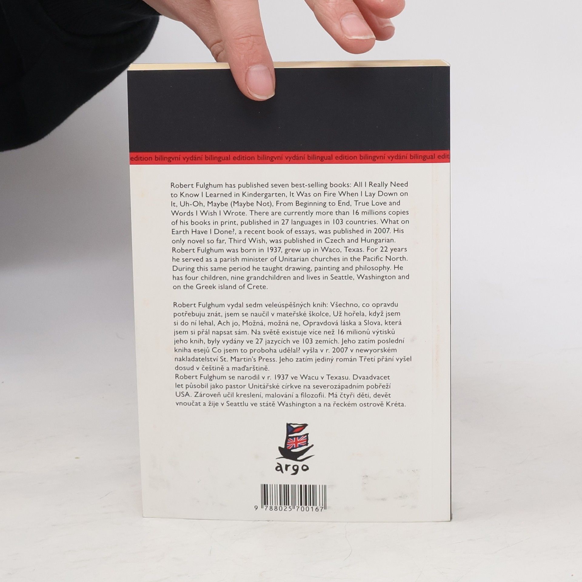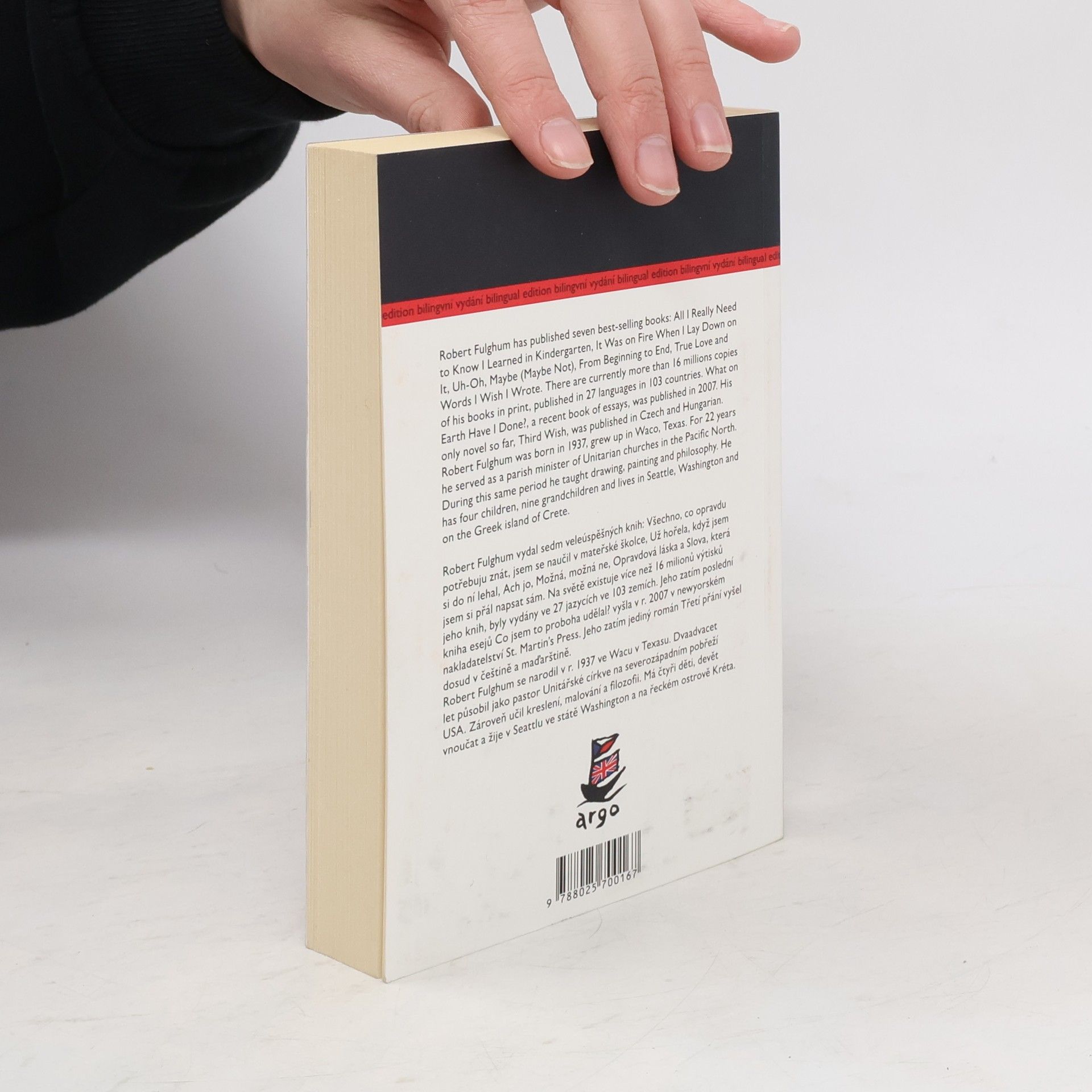 První česko-anglické dvojjazyčné vydání z Roberta Fulghuma. Do knihy, která by měla sloužit jak Fulghumovým fanouškům, tak žákům angličtiny, byly vybrány eseje a příběhy z celého díla oblíbeného amerického spisovatele, jež u nás vychází od roku 1992 v překladu Jiřího Hrubého. Prvně si tak čtenáři budou moci vychutnat vypravěčský dar Roberta Fulghuma i v originále, a konečně posoudit, zda má pravdu, když při každé své návštěvě Prahy tvrdí, že jeho překladatel je lepší spisovatel než on.