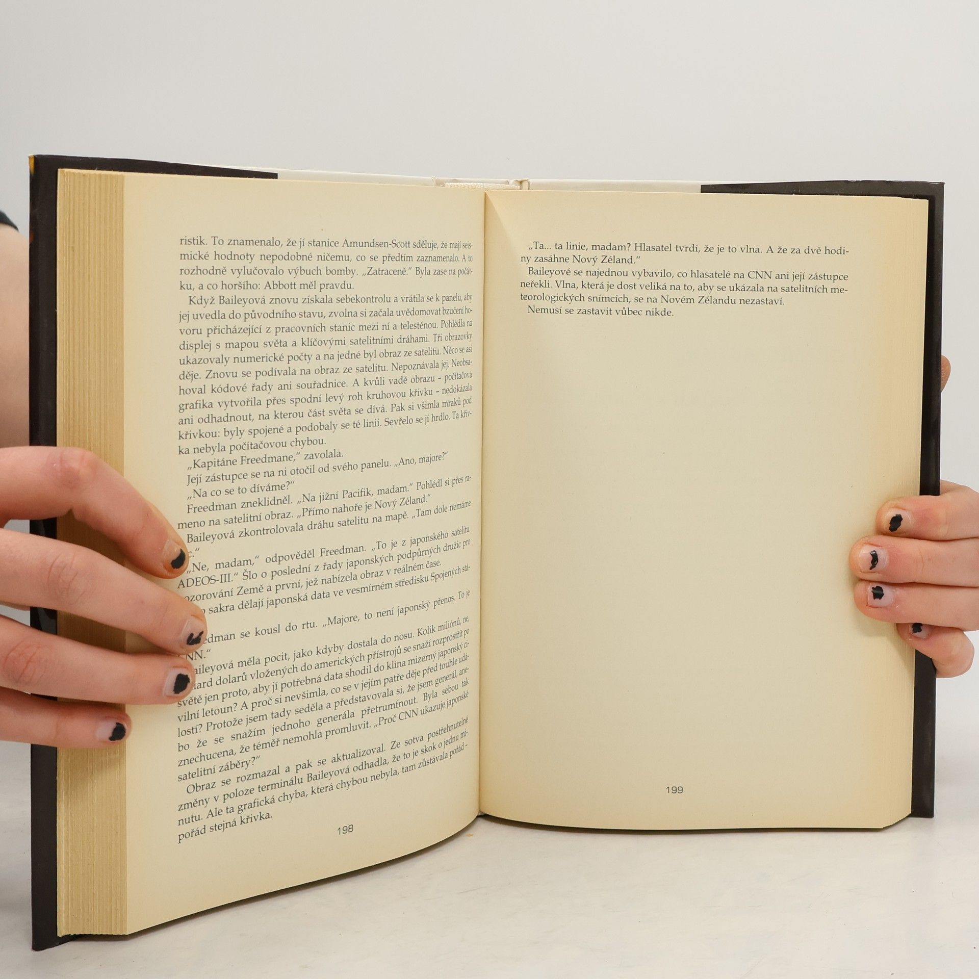Tato exploze vyvolala elektromagnetický impuls, který vyřadil z provozu veškeré špionážní a meteorologické satelity nad jižní polokoulí, a tak nebylo možné vůbec varovat před blížícím se nebezpečím. Díky nárazové vlně se ledovec řítil obrov- skou rychlostí do Pacifiku, navíc se výtlaková vlna hnala směrem na sever k Hava- ji. A právě úkolem ústředních postav knihy (jsou jimi dřívější milenci a nyní nepřátelé kapitán speciálních námořních jednotek Mitch Webber a oceánografka Cora Reyová) je najít řešení, jak tuto vlnu zastavit a odhalit teroristy, kteří ji způsobili. Musejí také čelit intrikám a zradám z nejvyšších míst v Pentagonu. Vzhledem k techničnosti námětu zaujme tento román spíše muže. lizleroh Katastrofický román o putování Rossova šelfového ledovce utrženého po výbuchu nukleárních hlavic v Antarktidě