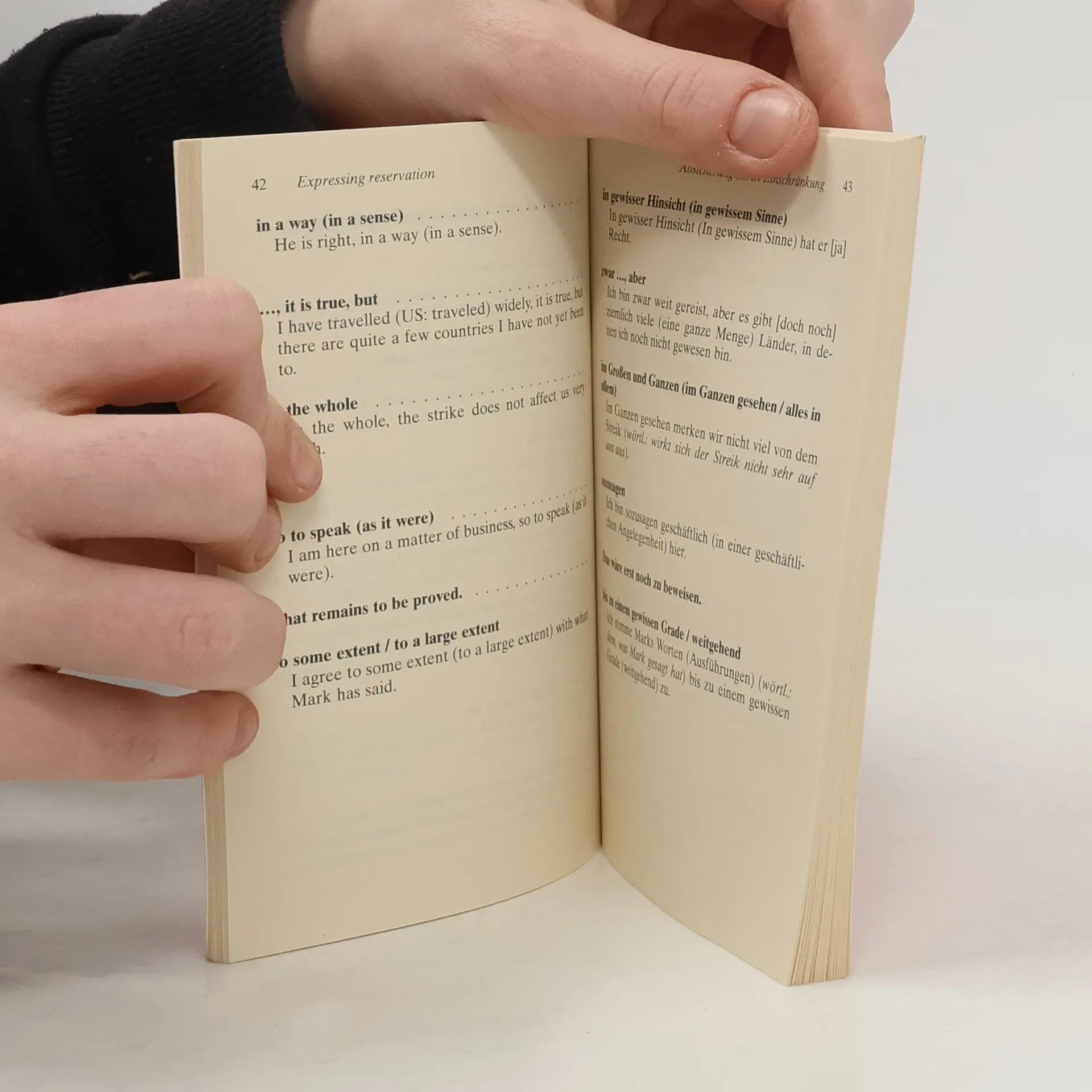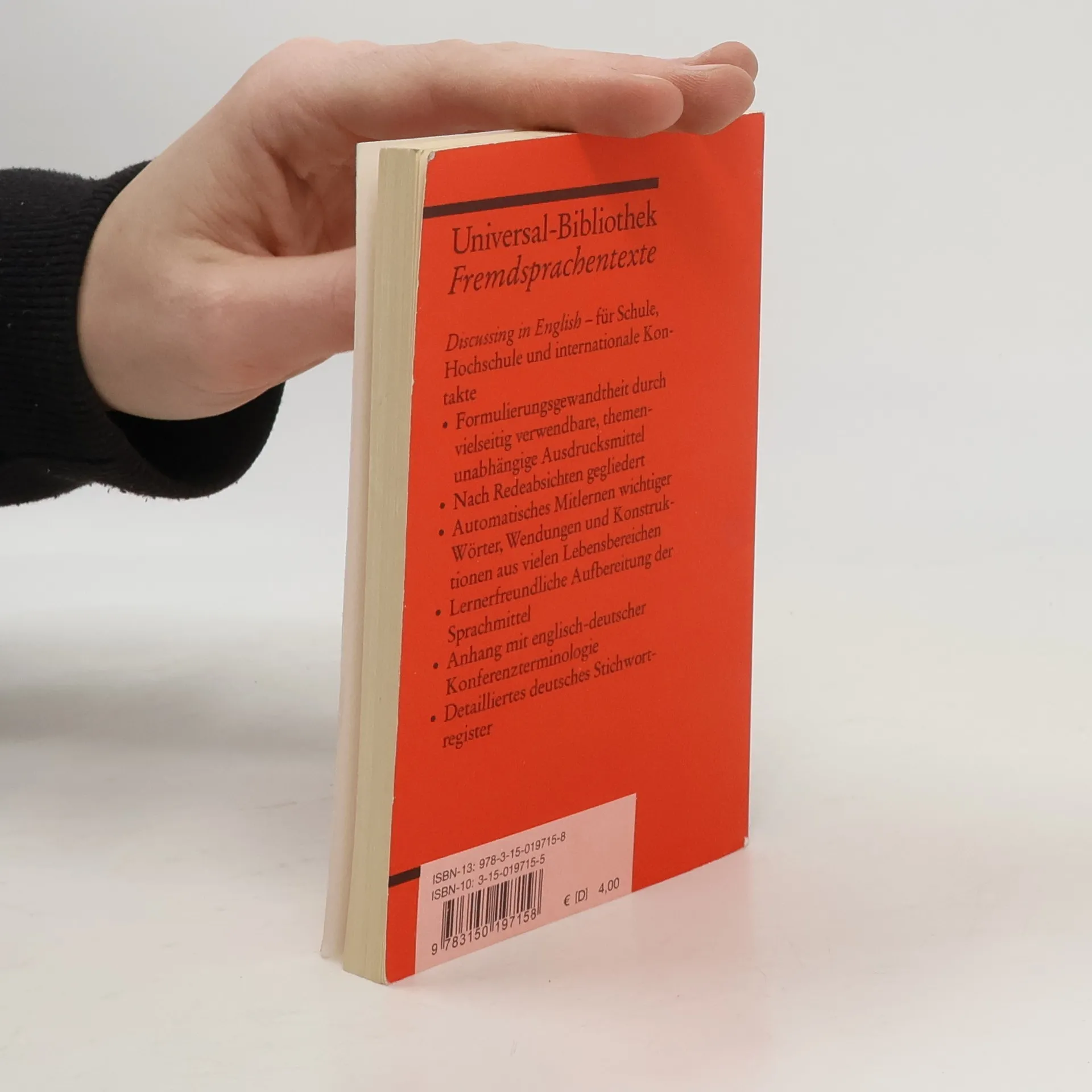 Eine Zusammenstellung wichtiger Ausdrücke für jede auf Englisch geführte Diskussion. Gegliedert ist das Buch in 10 Lerneinheiten wie ›Häufig gebrauchte Wendungen‹ oder ›Meinungsäußerung‹. Auf jede Wendung folgt ein Beispielsatz, links steht jeweils das Englische, rechts die deutsche Übersetzung. Ein letztes Kapitel enthält Formulierungen zur Organisation von Konferenzen und Sitzungen. Englische Lektüre: Niveau B1–B2 (GER)