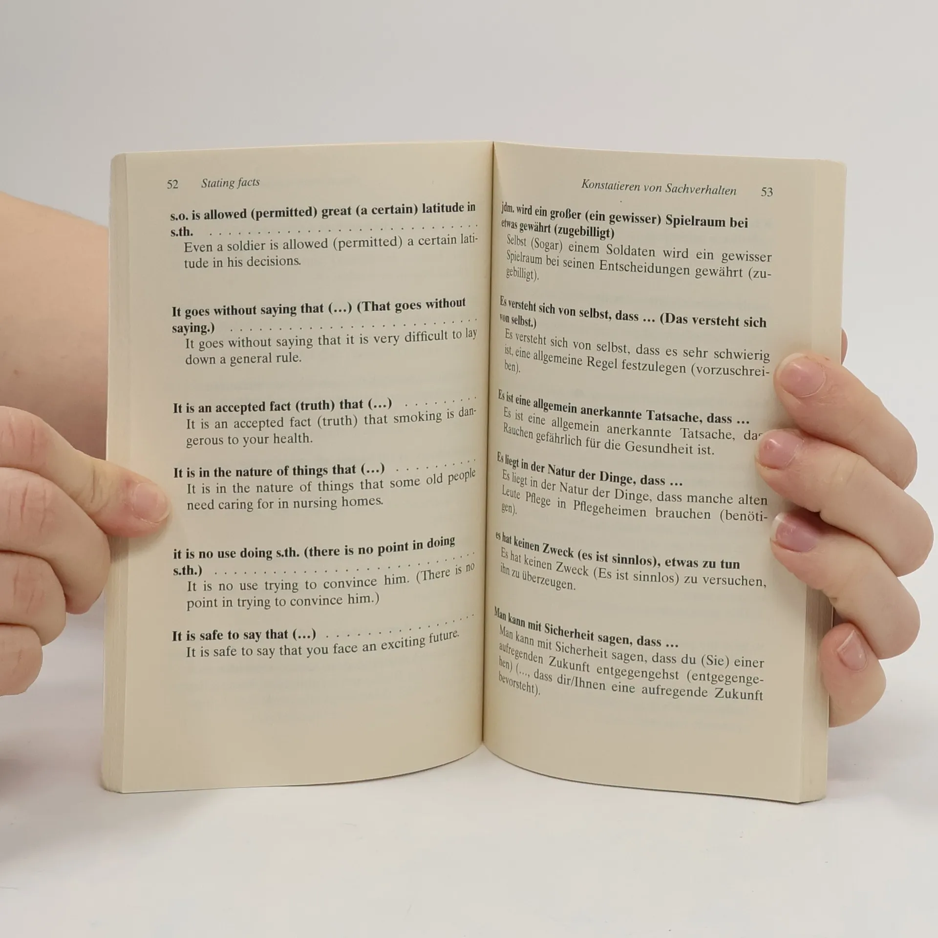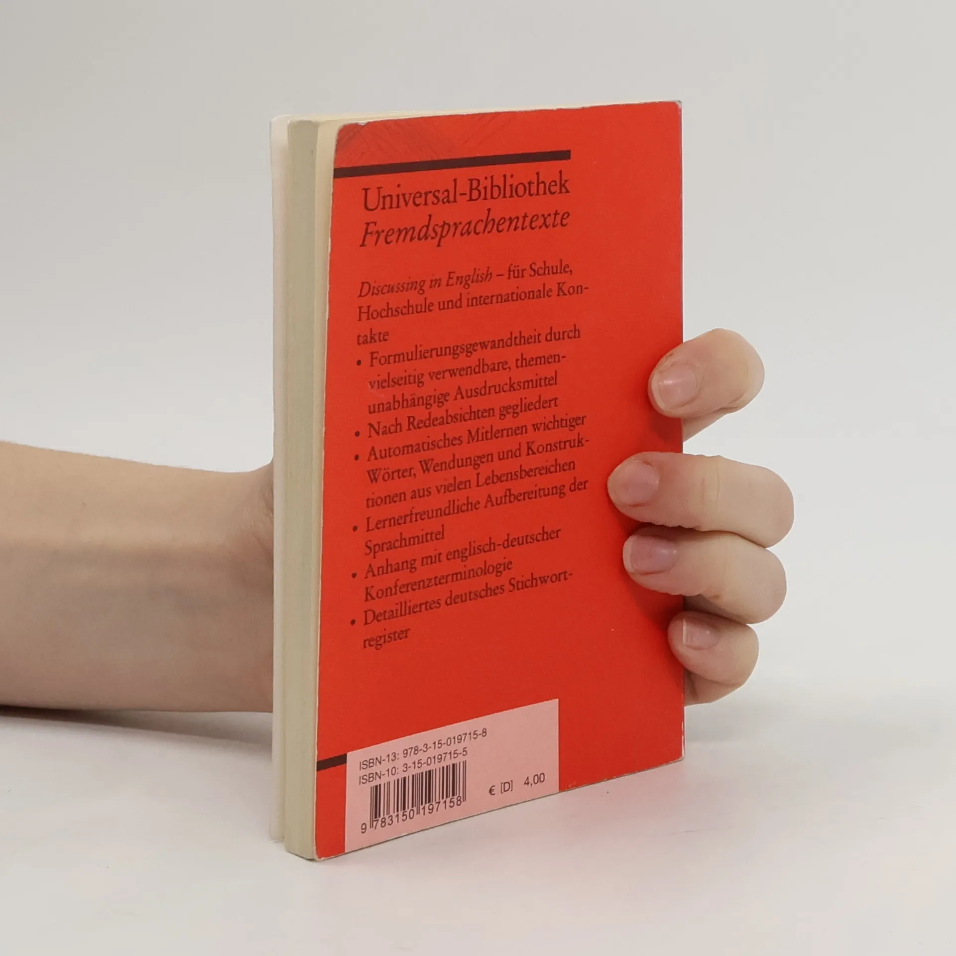 Eine Zusammenstellung wichtiger Ausdrücke für jede auf Englisch geführte Diskussion. Gegliedert ist das Buch in 10 Lerneinheiten wie ›Häufig gebrauchte Wendungen‹ oder ›Meinungsäußerung‹. Auf jede Wendung folgt ein Beispielsatz, links steht jeweils das Englische, rechts die deutsche Übersetzung. Ein letztes Kapitel enthält Formulierungen zur Organisation von Konferenzen und Sitzungen. Englische Lektüre: Niveau B1–B2 (GER)