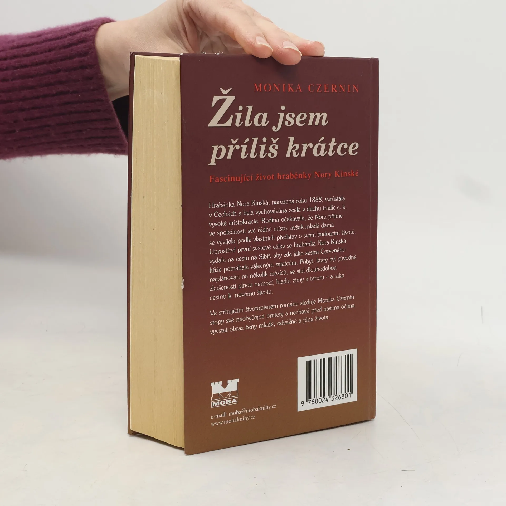 Fascinující život odvážné ženy. Hraběnka Nora Kinská, narozená roku 1888, vyrůstala v Čechách a byla vychovávána zcela v duchu tradic c. k. vysoké aristokracie. Rodina očekávala, že Nora přijme ve společnosti své řádné místo, avšak mladá dáma se vyvíjela podle vlastních představ o svém budoucím životě. Uprostřed první světové války se hraběnka Nora Kinská vydala na cestu na Sibiř, aby pomáhala válečným zajatcům. Pobyt, který byl naplánován na několik měsíců, se stal dlouholetou zkušeností plnou nemocí, hladu, zimy a teroru a také cestou k novému životu. Ve strhujícím životopisném románu sleduje Monika Czernin stopy své neobyčejné pratety a nechává před našima očima vyvstat obraz ženy mladé, odvážné a plné života.