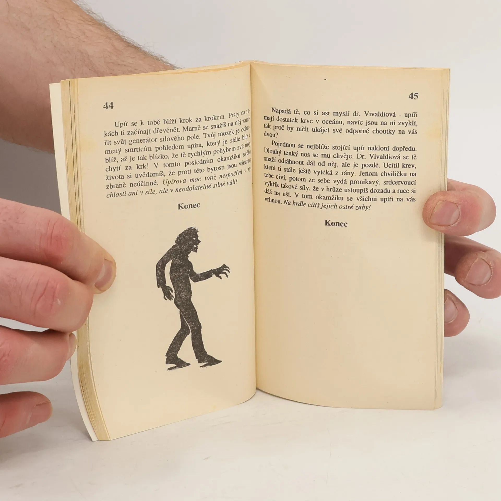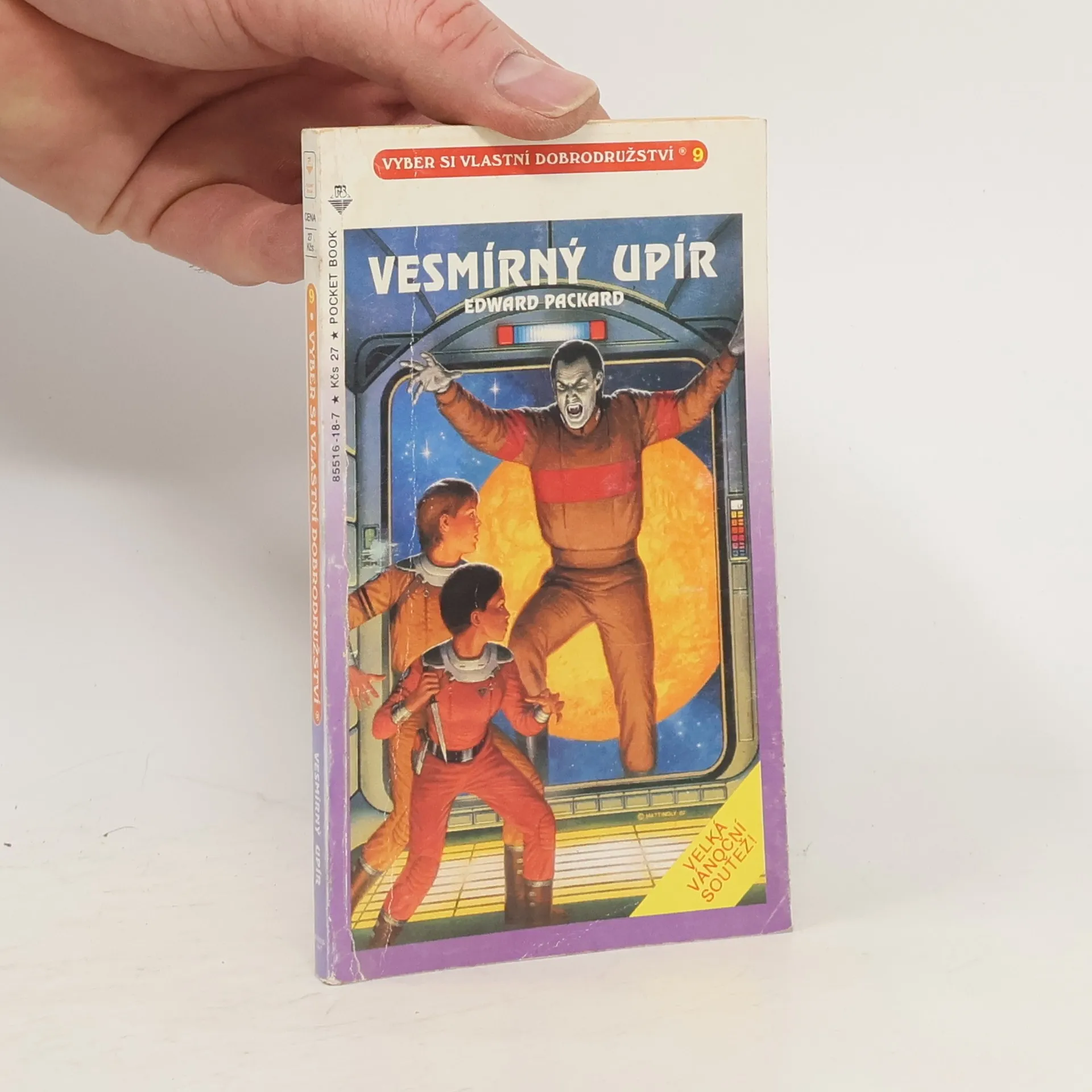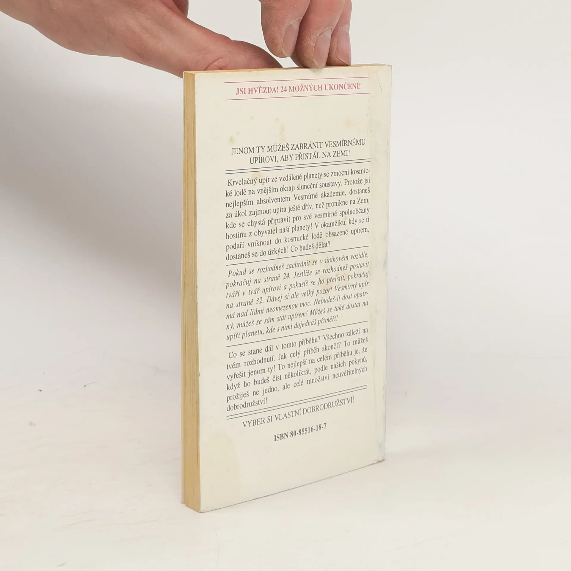 .. Krvelačný upír ze vzdálené planety se zmocní kosmické lodě na vnějším okraji sluneční soustavy. Protože jsi nejlepším absolventem Vesmírné akademie, dostaneš za úkol zajmout upíra ještě dřív, než pronikne na Zem, kde se chystá připravit pro své vesmírné spoluobčany hostinu z obyvatel naší planety! V okamžiku, kdy se ti podaří vniknout do kosmické lodě obsazené upírem, dostaneš se do úzkých! Co budeš dělat? Pokud se rozhodneš zachránit se v únikovém vozidle, pokračuj na straně 24. Jestliže se rozhodneš postavit tváři v tvář upírovi a pokusíš se ho přelstít, pokračuj na straně 32. Dávej si ale velký pozor! Vesmírný upír má nad lidmi neomezenou moc. Nebudeš-li dost opatrný, můžeš se sám stát upírem! Můžeš se také dostat na upíří planetu, kde s nimi dojednáš příměří! Co se stane dál v tomto příběhu? Všechno záleží na tvém rozhodnutí. Jak celý příběh skončí? To můžeš vyřešit jenom ty! To nejlepší na celém příběhu je, že když ho budeš číst několikrát, podle našich pokynů, prožiješ ne jedno, ale celé množství neuvěřitelných dobrodružství!