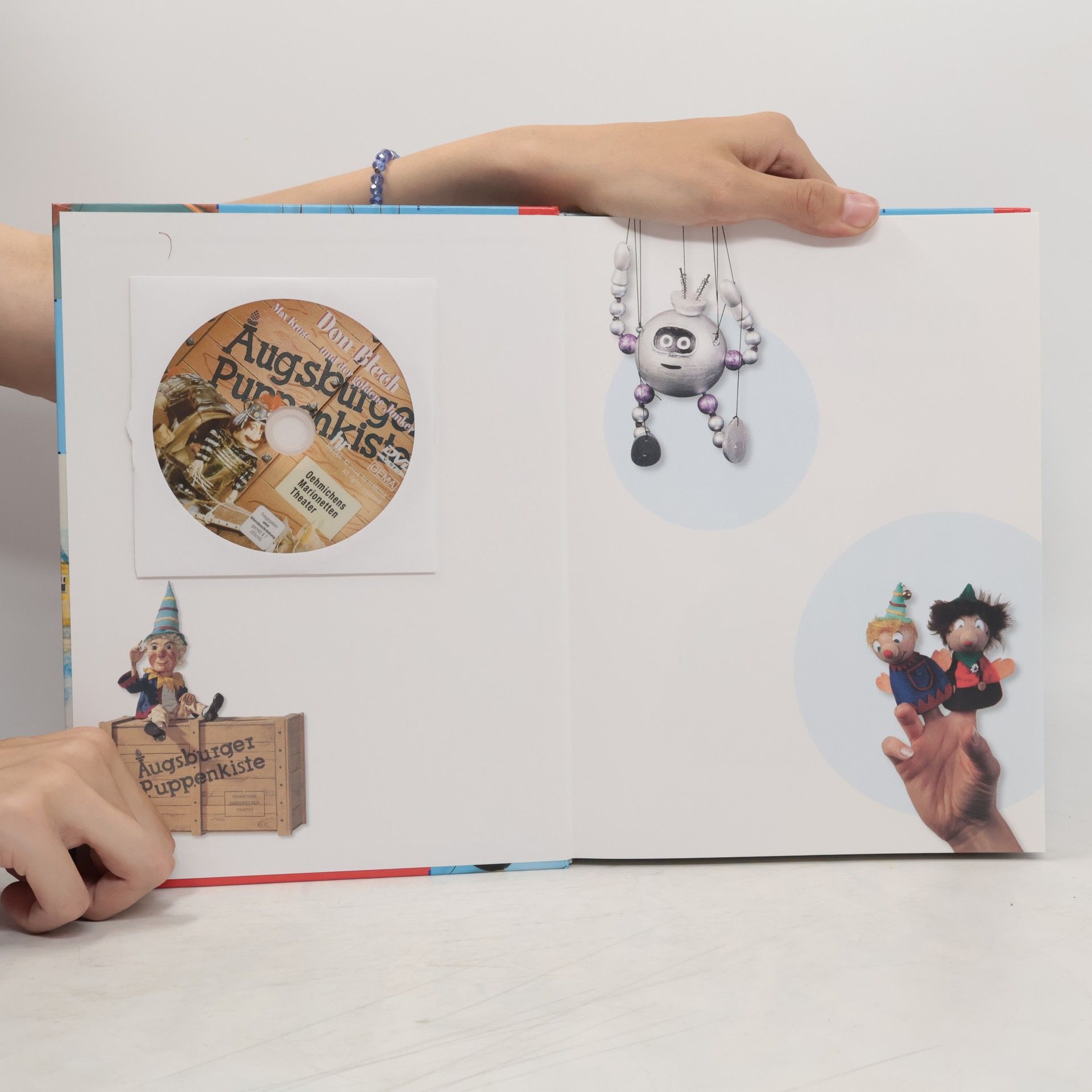 Anleitung zum Basteln eines Papiertheaters, verschiedener Handpuppen und Marionetten, alles stark vereinfachte Versionen beliebter Figuren aus den Stücken der Augsburger Puppenkiste.