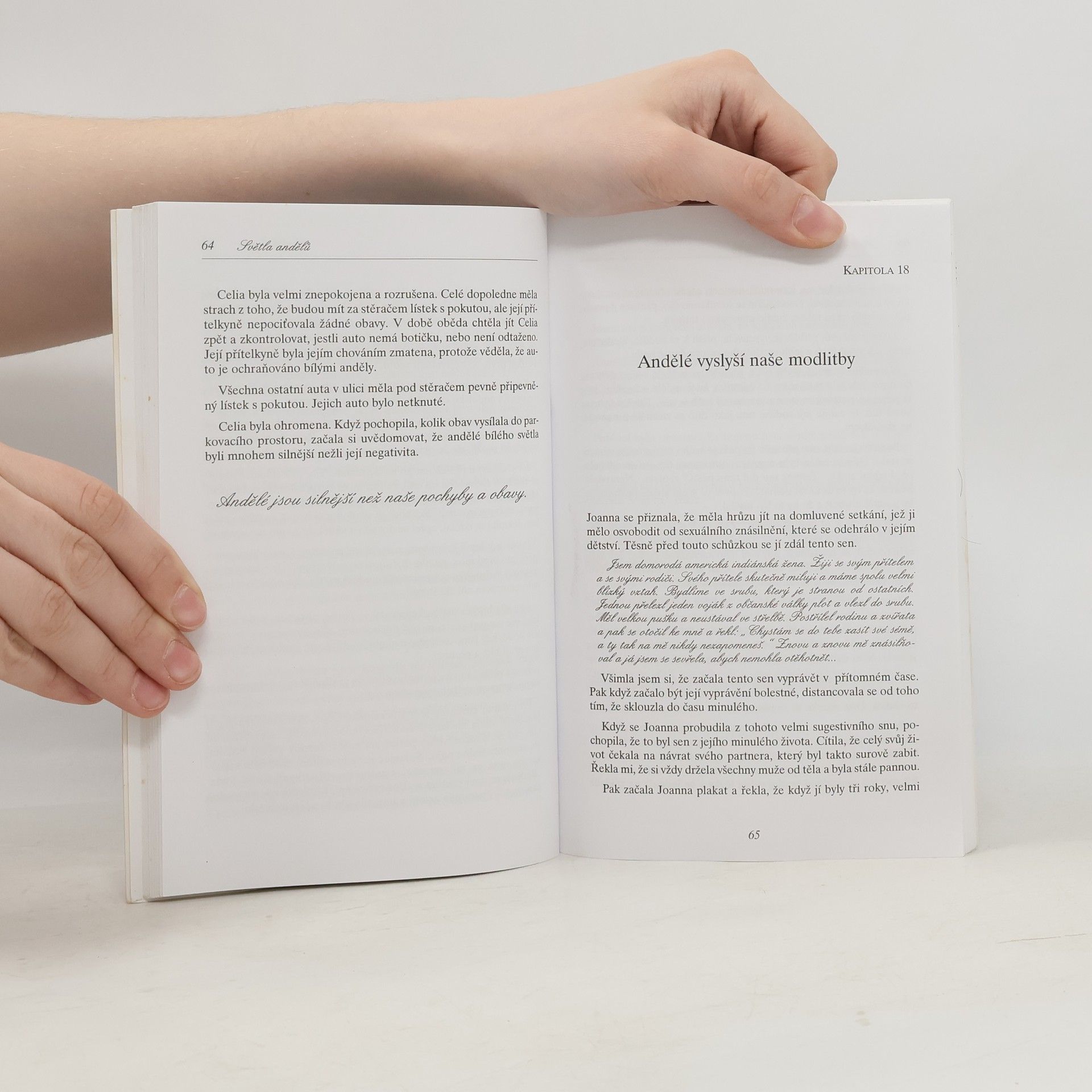 Kniha Světla andělů dává rady, jak můžeme zavolat anděly, aby nám v našem životě pomohli a dělali nám společnost. Jsme obklopeni anděly, jediné, co musíme udělat, je pozvednout své vědomí, abychom si jich mohli být vědomi a komunikovat s nimi, uvítat je ve svých životech a vpustit do našeho srdce radost, světlo a mír vycházející z jejich přítomnosti.