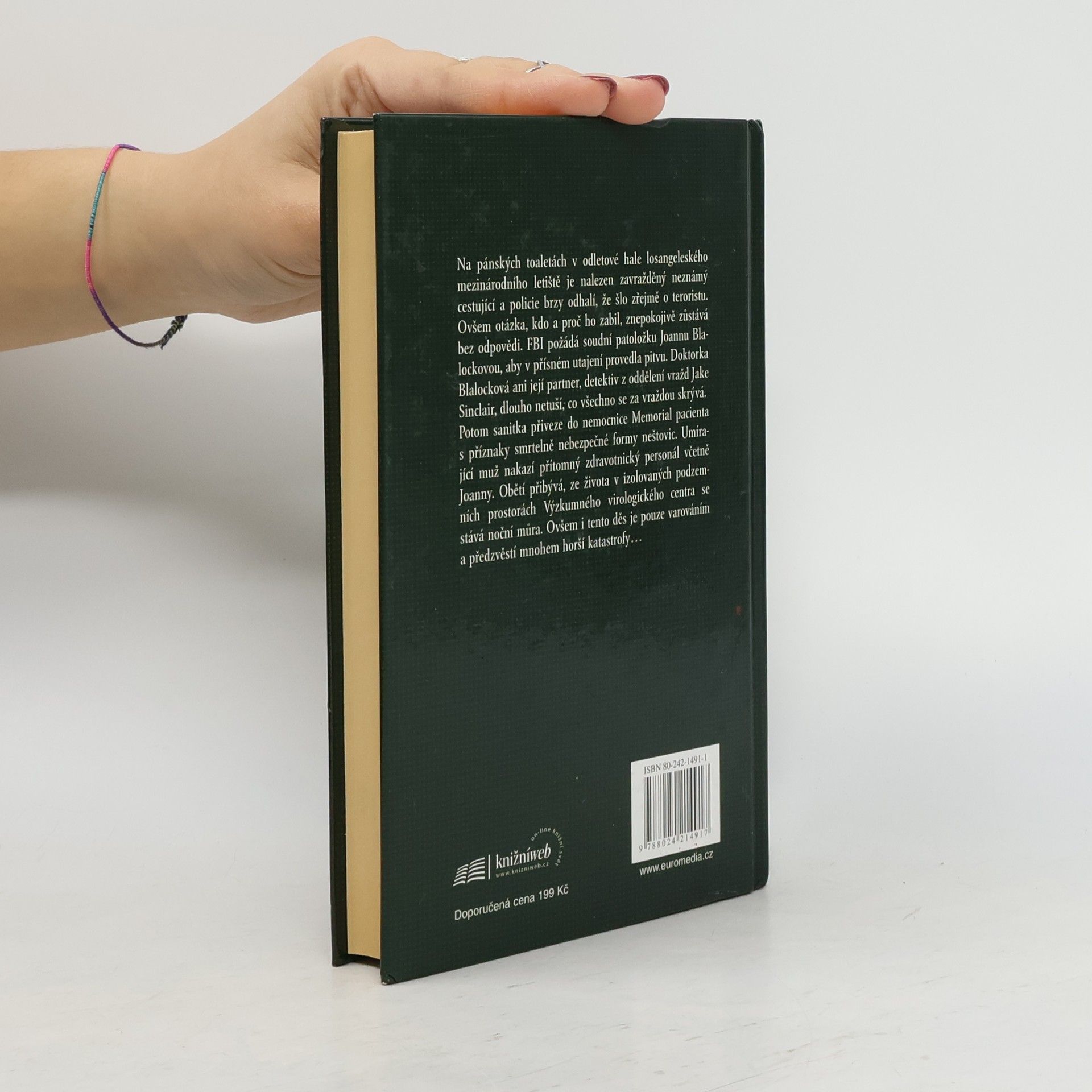 Na pánských toaletách v odletové hale losangeleského mezinárodního letiště je nalezen zavražděný neznámý cestující a policie brzy odhalí, že zřejmě šlo o teroristu. Ovšem otázka, kdo a proč ho zabil, znepokojivě zůstává bez odpovědi. FBI požádá soudní patoložku Joannu Blalockovou, aby v přísném utajení provedla pitvu. Doktorka Blalocková ani její partner, detektiv z oddělení vražd Jake Sinclair, dlouho netuší, co všechno se za vraždou skrývá. Potom sanitka přiveze do nemocnice Memorial pacienta s příznaky smrtelně nebezpečné formy neštovic. Umírající muž nakazí přítomný zdravotnický personál včetně Joanny. Obětí přibývá, ze života v izolovaných podzemních prostorách Výzkumného virologického centra se stává noční můra. Ovšem i tento děs je pouze varováním a předzvěstí mnohem horší katastrofy…