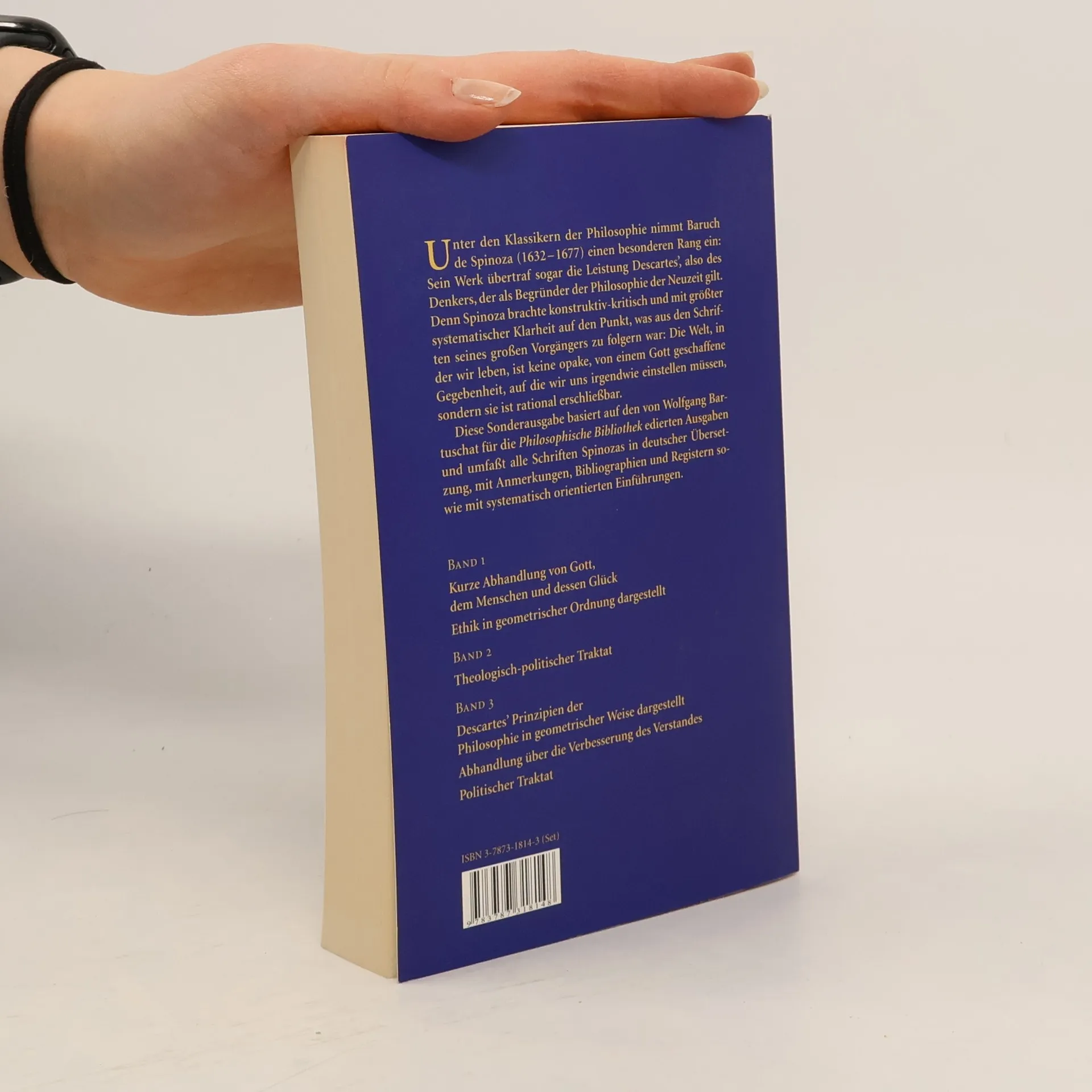 Band 1: Kurze Abhandlung von Gott, dem Menschen und dessen Glück Ethik in geometrischer Ordnung dargestellt Band 2: Theologisch-politischer Traktat Band 3: Descartes ’ Prinzipien der Philo sophie in geometrischer Weise dargestellt Abhandlung über die Verbesserung des Verstandes Politischer Traktat
