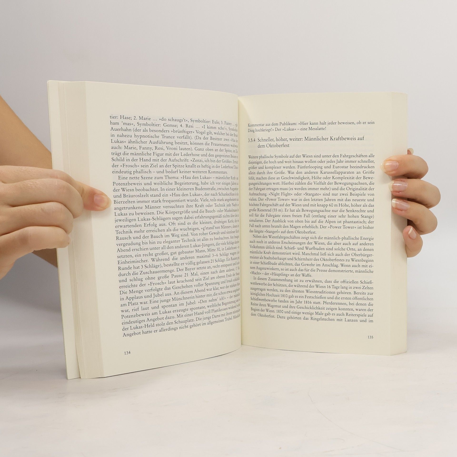 »Das Oktoberfest – Masse, Rausch und Ritual« ist die erste psychologische Studie zum Oktoberfest. Die sozialpsychologische Struktur des Oktoberfestes wird in Kapiteln zu Masse, Event, Sucht, Rausch und Ritual auf der Grundlage zahlreicher Interviews mit Besuchern und Beschäftigten auf der »Wiesn« untersucht. Die Autorin greift in ihrer Analyse dieses schon »institutionsgleichen« Festes bis auf Platon, Aristoteles, Elias Canetti, Norbert Elias, Nietzsche, Freud und die Ritualtheoretiker Van Gennep und Victor Turner zurück. Intelligent, leicht lesbar und oft mit einem Augenzwinkern geschrieben werden die rauschhaft-euphorischen Begebenheiten der »Wiesn« mit dionysischen Kulten im antiken Athen und der rituellen Communitas nach Turner verglichen. Die Betrachtung des Oktoberfestes als pseudo-sakrales Ritual, als Kommunion der Massen im Bierzelt mit den Eigenschaften eines archaisch-ekstatisch anmutenden Kultes, eröffnet einen außergewöhnlichen philosophischen Blick auf das größte Volksfest der Welt.