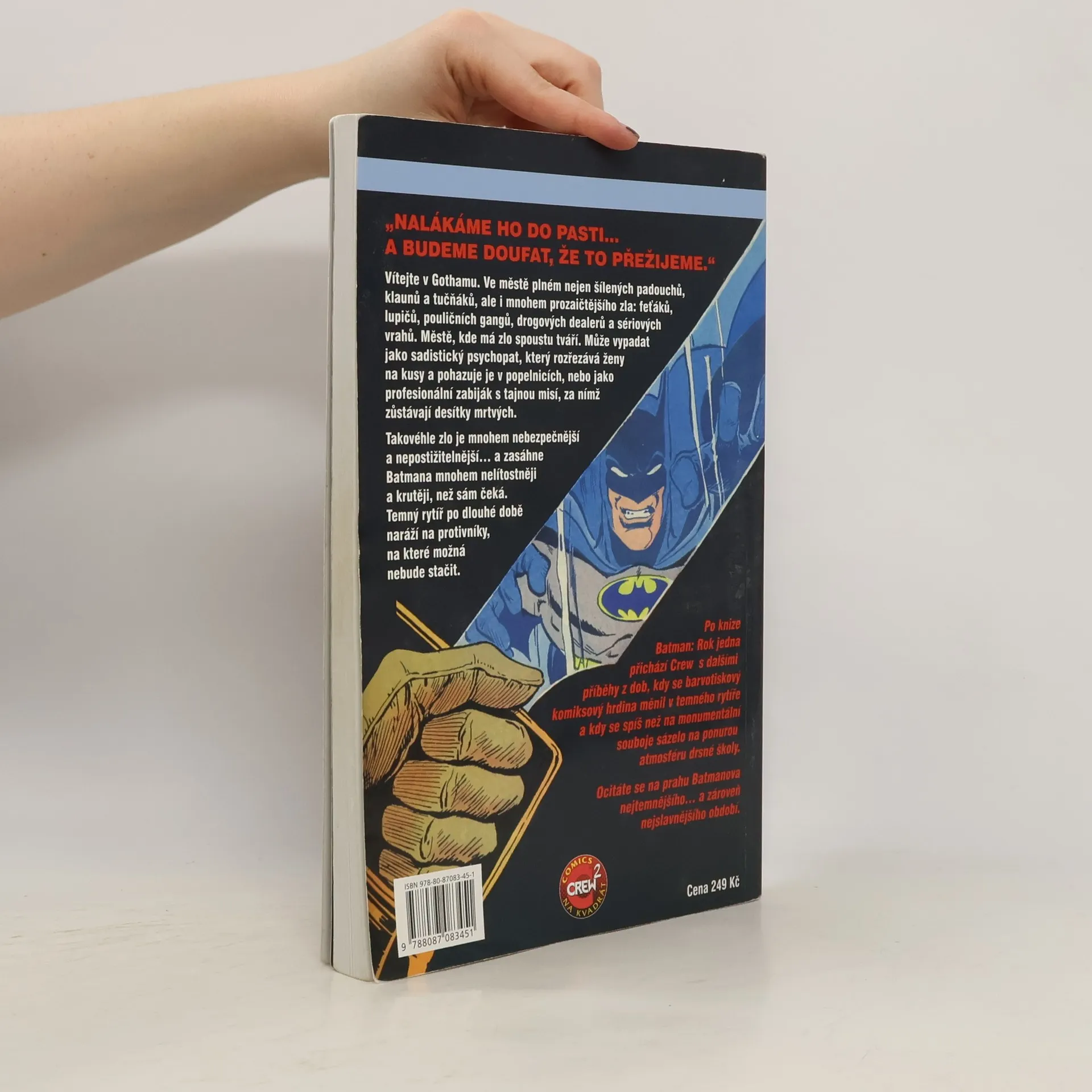 Vítejte v Gothamu. Ve městě plném nejen šílených padouchů, klaunů a tučňáků, ale i mnohem prozaičtějšího zla: feťáků, lupičů, pouličních gangů, drogových dealerů a sériových vrahů. Městě, kde má zlo spoustu tváří. Může vypadat jako sadistický psychopat, který rozřezává ženy na kusy a pohazuje je v popelnicích, nebo jako profesionální zabiják s tajnou misí, za nímž zůstávají desítky mrtvých. Takovéhle zlo je mnohem nebezpečnější a nepostižitelnější... a zasáhne Batmana mnohem nelítostněji a krutěji, než sám čeká. Temný rytíř po dlouhé době naráží na protivníky, na které možná nebude stačit. Po knize Batman: Rok jedna přichází Crew s dalšími příběhy z dob, kdy se barvotiskový komiksový hrdina měnil v temného rytíře a kdy se spíš než na monumentální souboje sázelo na ponurou atmosféru drsné školy. Ocitáte se na prahu Batmanova nejtemnějšího... a zároveň nejslavnějšího období.