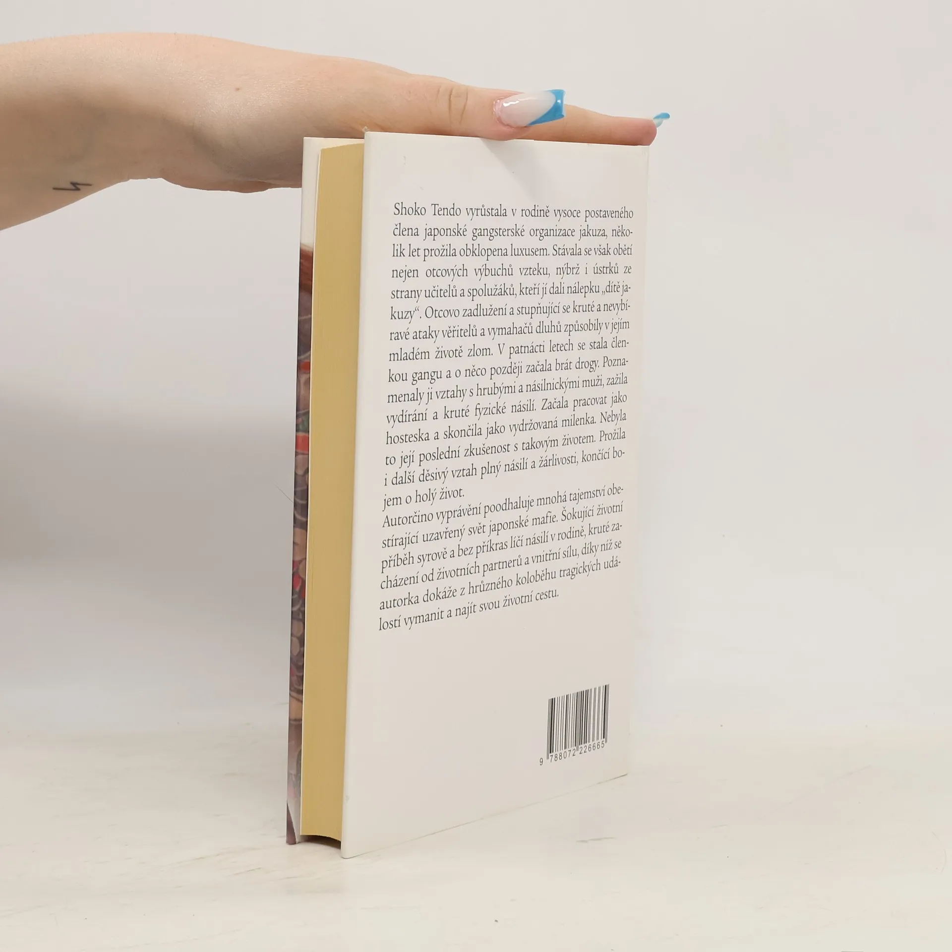 Shoko Tendo vyrůstala v rodině vysoce postaveného člena japonské gangsterské organizace jakuza, několik let prožila obklopena luxusem. Stávala se však obětí nejen otcových výbuchů vzteku, nýbrž i ústrků ze strany učitelů a spolužáků, kteří jí dali nálepku „dítě jakuzy“. Otcovo zadlužení a stupňující se kruté a nevybíravé ataky věřitelů a vymahačů dluhů způsobily v jejím mladém životě zlom. V patnácti letech se stala členkou gangu a o něco později začala brát drogy. Poznamenaly ji vztahy s hrubými a násilnickými muži, zažila vydírání a kruté fyzické násilí. Začala pracovat jako hosteska a skončila jako vydržovaná milenka. Nebyla to její poslední zkušenost s takovým životem. Prožila i další děsivý vztah plný násilí a žárlivosti, končící bojem o holý život. Autorčino vyprávění poodhaluje mnohá tajemství obestírající uzavřený svět japonské mafie. Šokující životní příběh syrově a bez příkras líčí násilí v rodině, kruté zacházení ze strany násilnických životních partnerů a vnitřní sílu, díky níž se autorka dokáže z hrůzného koloběhu tragických událostí vymanit a najít svou životní cestu.