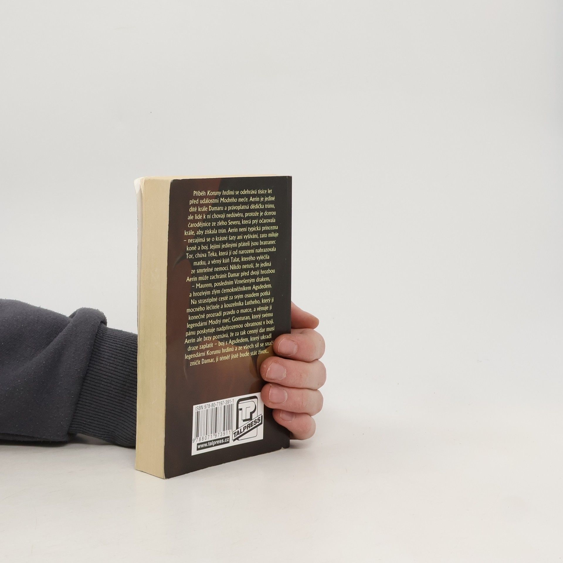 Příběh Koruny hrdinů se odehrává tisíce let před událostmi Modrého meče. Aerin je jediné dítě krále Damaru a právoplatná dědička trůnu, ale lidé k ní chovají nedůvěru, protože je dcerou čarodějnice ze zlého Severu, která prý očarovala krále, aby získala trůn. Aerin není typická princezna – nezajímá se o krásné šaty ani vyšívání, zato miluje koně a boj. Jejími jedinými přáteli jsou bratranec Tor, chůva Teka, která jí od narození nahrazovala matku, a věrný kůň Talat, kterého vyléčila ze smrtelné nemoci. Nikdo netuší, že jediná Aerin může zachránit Damar před dvojí hrozbou – Maurem, posledním Vznešeným drakem, a hrozivým zlým černokněžníkem Agsdedem. Na strastiplné cestě za svým osudem potká mocného léčitele a kouzelníka Lutheho, který jí konečně prozradí pravdu o matce, a věnuje jí legendární Modrý meč, Gonturan, který svému pánu poskytuje nadpřirozenou obratnost v boji. Aerin ale brzy poznává, že za tak cenný dar musí draze zaplatit – boj s Agsdedem, který ukradl legendární Korunu hrdinů a ze všech sil se snaží zničit Damar, ji téměř jistě může stát život...