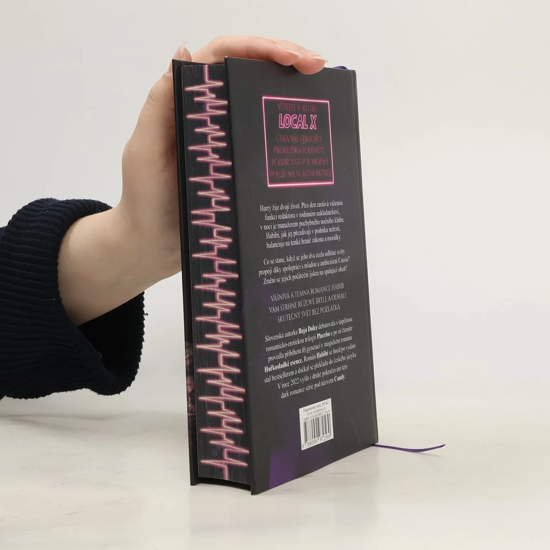 Vítejte v klubu LocalX. Čeká vás strhující prohlídka podsvětí. Pozor! Vstup je možný pouze na vlastní riziko. Harry žije dvojí život. Přes den zastává váženou funkci redaktora v rodinném nakladatelství, v noci je manažerem pochybného nočního klubu. Habibi, jak jej přezdívají v podniku neřestí, balancuje na tenké hraně zákona a morálky. Co se stane, když se jeho dva zcela odlišné světy propojí díky spolupráci s mladou a ambiciózní Cassie? Změní se jejich počáteční jiskra na spalující oheň? Vášnivá a temná romance Habibi vám strhne růžové brýle a odhalí skutečný svět bez pozlátka. Slovenská autorka Baja Dolce debutovala s úspěšnou romanticko-erotickou trilogií Placebo a po ní čtenáře provedla příběhem tří generací v magickém románu Hořkosladké esence. Román Habibi se hned po vydání stal bestsellerem a dočkal se překladu do českého jazyka. V roce 2022 vyšlo i druhé pokračování této dark romance série pod názvem Candy.
