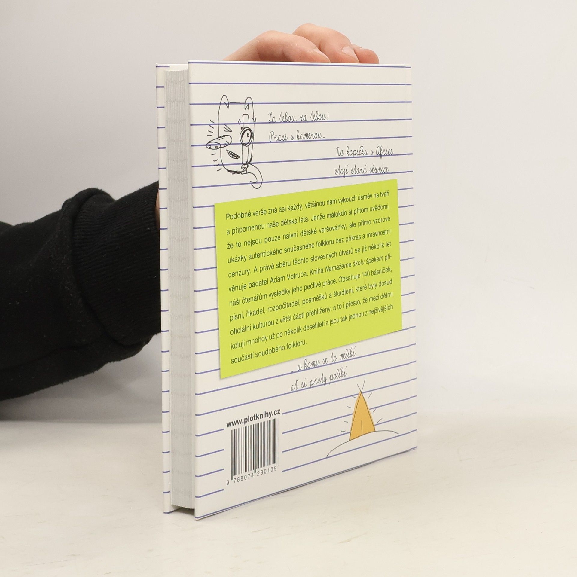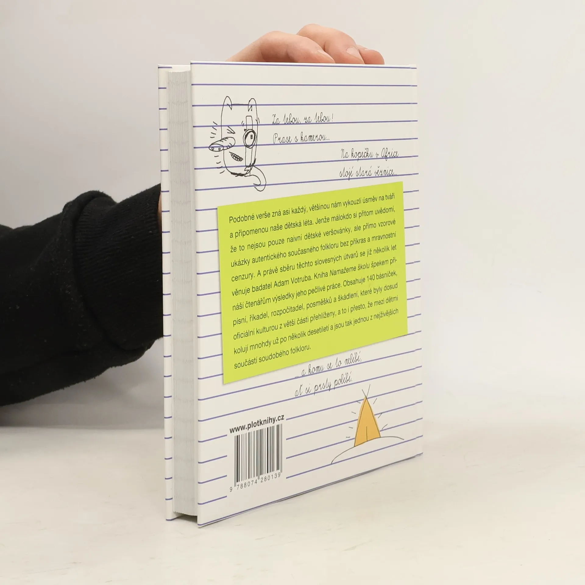 Za tebou, za tebou! Prase s kamerou... Na kopečku v Africe stojí stará věznice... Podobné verše zná asi každý, většinou nám vykouzlí úsměv na tváři a připomenou naše dětská léta. Jenže málokdo si přitom uvědomí, že to nejsou pouze naivní dětské veršovánky, ale přímo vzorové ukázky autentického současného folkloru bez příkras a mravnostní cenzury. A právě sběru těchto slovesných útvarů se již několik let věnuje badatel Adam Votruba. Kniha Namažeme školu špekem přináší čtenářům výsledky jeho pečlivé práce. Obsahuje 140 básniček, písní, říkadel, rozpočitadel, posměšků a škádlení, které byly dosud oficiální kulturou z větší části přehlíženy, a to i přesto, že mezi dětmi kolují mnohdy už po několik desetiletí a jsou tak jednou z nejživějších součástí soudobého folkloru.