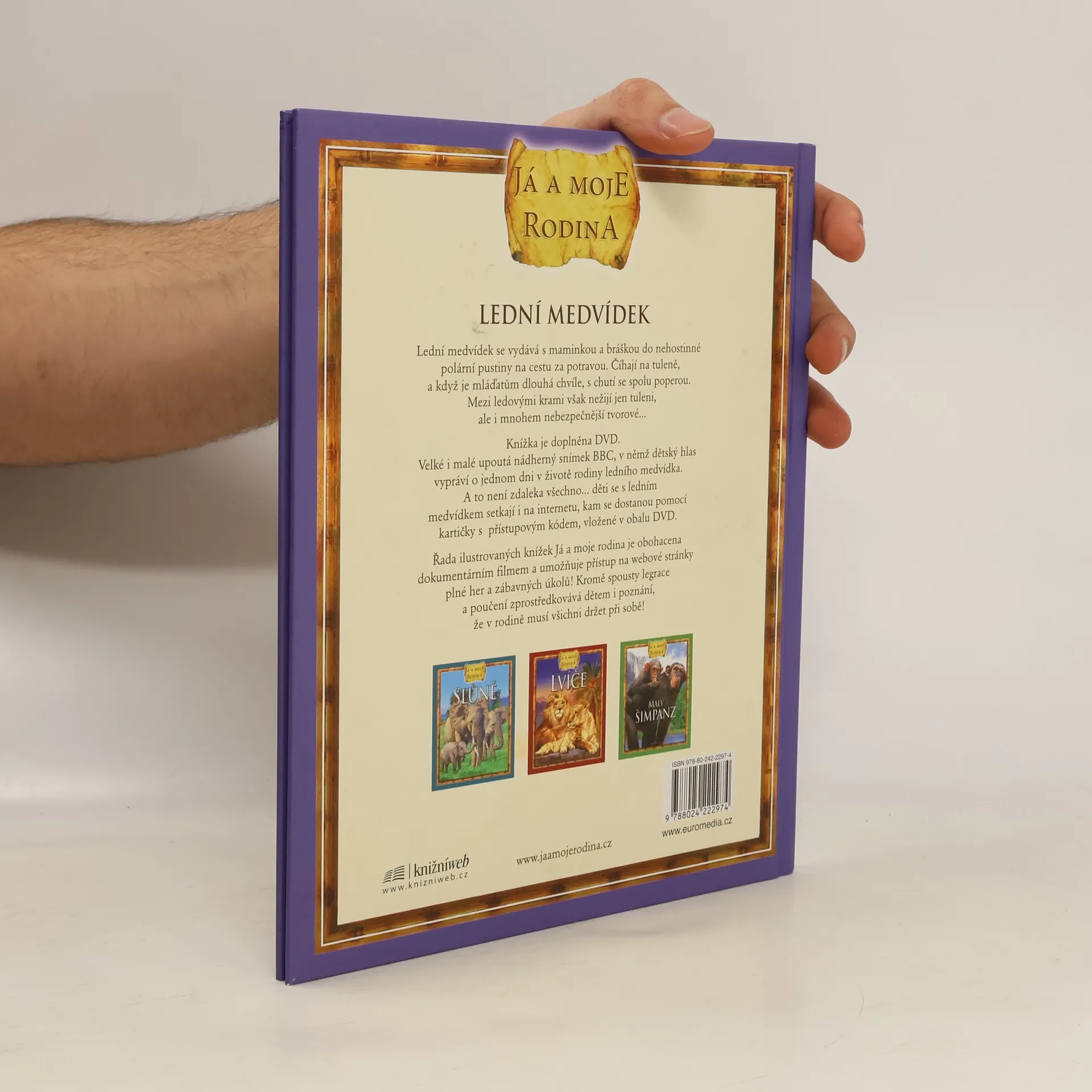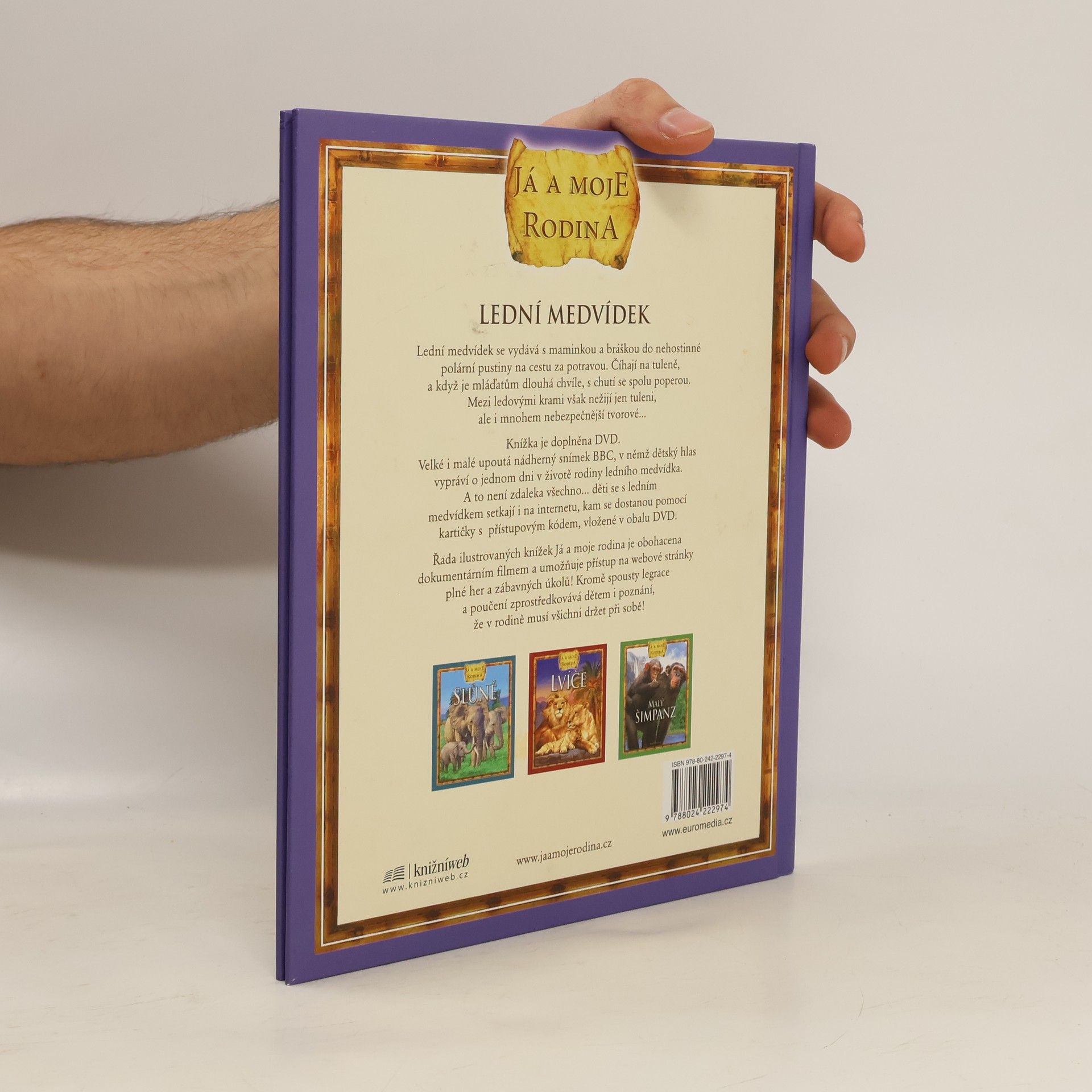 Krátký příběh s celostránkovými ilustracemi zavede malé čtenáře do Arktidy, kde prožívají svá každodenní dobrodružství dva malí medvědí kluci. Kniha určená dětem mladšího školního věku. Lední medvídek se vydává s maminkou a bráškou do nehostinné polární pustiny na cestu za potravou. Číhají na tuleně, a když je mláďatům dlouhá chvíle, s chutí se spolu poperou. Mezi ledovými krami však nežijí jen tulení, ale i mnohem nebezpečnější tvorové... Velké i malé upotá nádherný snímek BBc, v němž dětský hlas vypráví o jednom dni v životě rodiny ledního medvídka. A to není zdaleka všechno... Řada ilustrovaných knížek Já a moje rodina je obohacena dokumentárním filmem a umožňuje přístup na webové stránky plné her a zábavných úkolů! Kromě sousty legrace a poučení zprostředkovává dětem i poznání, že v rodině musí všichni držet pri sobě!