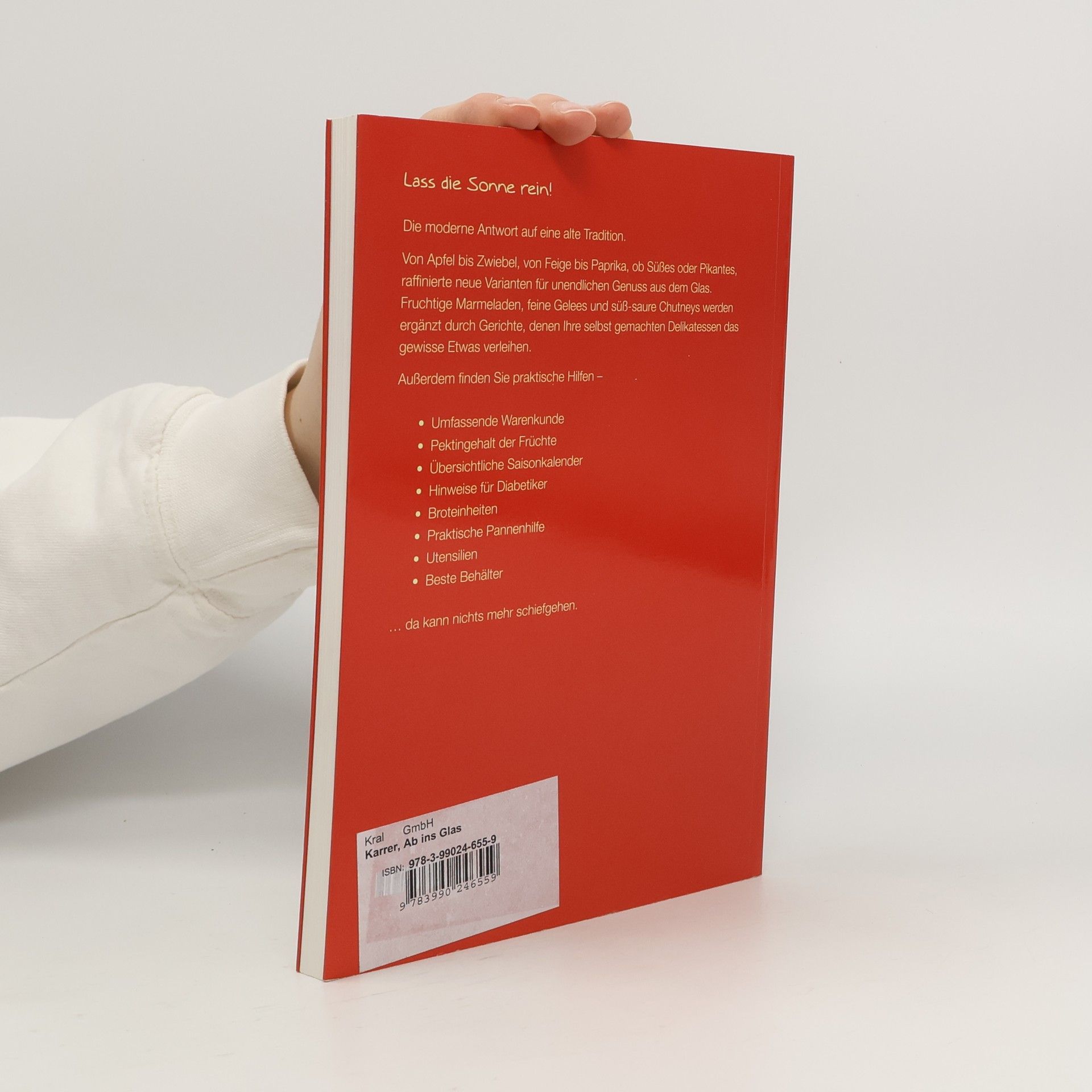 EINKOCHEN IST NICHT SCHWER! Ab ins Glas fängt den Duft des Sommers ein, damit uns seine Düfte und Geschmäcker auf lustvolle Weise durch das Jahr begleiten können. Sonnensatte Früchte und Gemüse verwandeln die hier versammelten Anregungen in fruchtige Marmeladen, feine Gelees und süßsaure Chutneys. Andrea Karrer hat die raffiniertesten Einkoch-Rezepte gesammelt und neue Rezeptideen mit klassischen Einmachtechniken kreativ kombiniert. Genauso präsentiert sie Rezepte für Gerichte, denen Ihre selbst gemachten Delikatessen das gewisse Etwas verleihen. Die unglaubliche Rezeptsammlung reicht von A wie Adventmarmelade bis Z wie Zwiebelrelish, sodass Ihnen schon beim Lesen das Wasser im Mund zusammenläuft. Eine umfassende Warenkunde, der Pektingehalt der Früchte und ein praktischer Saisonkalender liefern wertvolle Ergänzungen. Völlig neu! Hinweise für Diabetiker. Zum guten Gelingen hilft eine detaillierte Beschreibung der Arbeitsabläufe. Eine praktische Pannenhilfe wird ergänzt durch Tipps und Tricks zu den einzelnen Früchten und Gemüsen, da kann nichts mehr schief gehen. Die moderne Antwort auf eine alte Tradition!