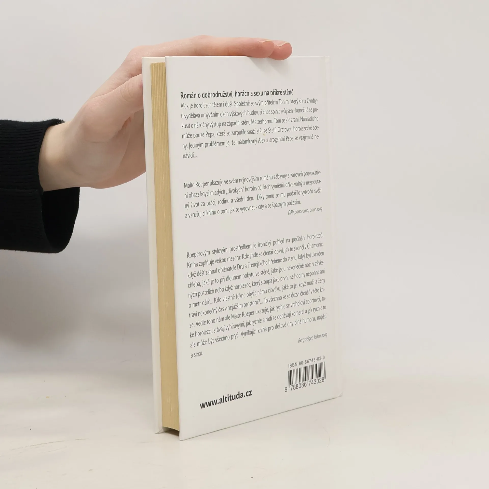 Alex je horolezec tělem i duší. Společně se svým přítelem Tonim, který si na živobytí vydělává umýváním oken výškových budov, si chce splnit svůj sen - konečně se pokusit o náročný výstup na západní stěnu Matterhornu. Toni se ale zraní. Nahradit ho může pouze Pepa, která se zarputile snaží stát se Steffi Grafovou horolezecké scény. Jediným problémem je, že málomluvný Alex a arogantní Pepa se vzájemně nenávidí… Roeperovým stylovým prostředkem je ironický pohled na počínání horolezců. Kniha zaplňuje velkou mezeru: Kde jinde se čtenář dozví, jak to skončí v Chamonix, když déšť zahnal obléhatele Dru a Frenejského hřebene do stanu, když byl ukraden chleba, jaké je to při dlouhém pobytu ve stěně, jaké jsou nekonečné noci v závěsných postelích nebo když horolezec, který stoupá jako první, se hodiny nepohne ani o metr dál?… Kdo vlastně řekne obyčejnému člověku, jaké to je, když muži a ženy tráví nekonečný čas v nejužším prostoru?… To všechno se se dozví čtenář v této knize. Vedle toho nám ale Malte Roeper ukazuje, jak rychle se vrcholoví sportovci, také horolezci, stávají vybíravými, jak rychle a rádi se oddávají komerci a jak rychle to ale může být všechno pryč. Vynikající kniha pro deštivé dny plná humoru, napětí a sexu.