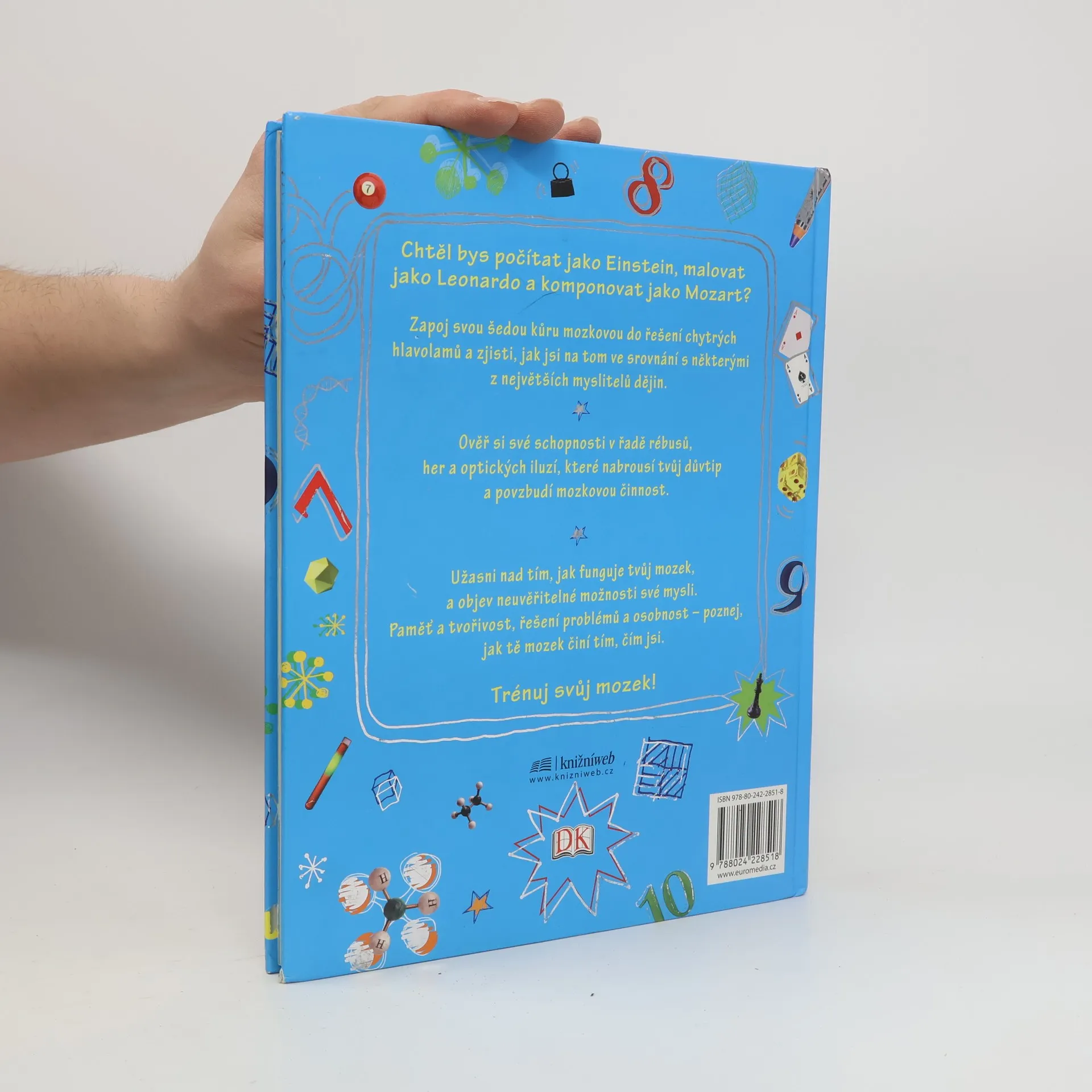 Kniha plná informací o mozku a jeho fungování a nepřeberného množství podnětů, cvičení na paměť, pozornost a představivost, příkladů a jejich řešení, praktických situací a tvůrčích aktivit. Neotřelým a zábavným způsobem vede děti k maximálnímu využití mozku a k rozvinutí všech jeho možností. Zapojí je do řešení chytrých hlavolamů a nabrousí jejich důvtip. Chtěli byste, aby vaše dítě počítalo jako Einstein, malovalo jako Leonardo da Vinci a komponovalo jako Mozart? Tato kniha pro něj bude skvělým pomocníkem.