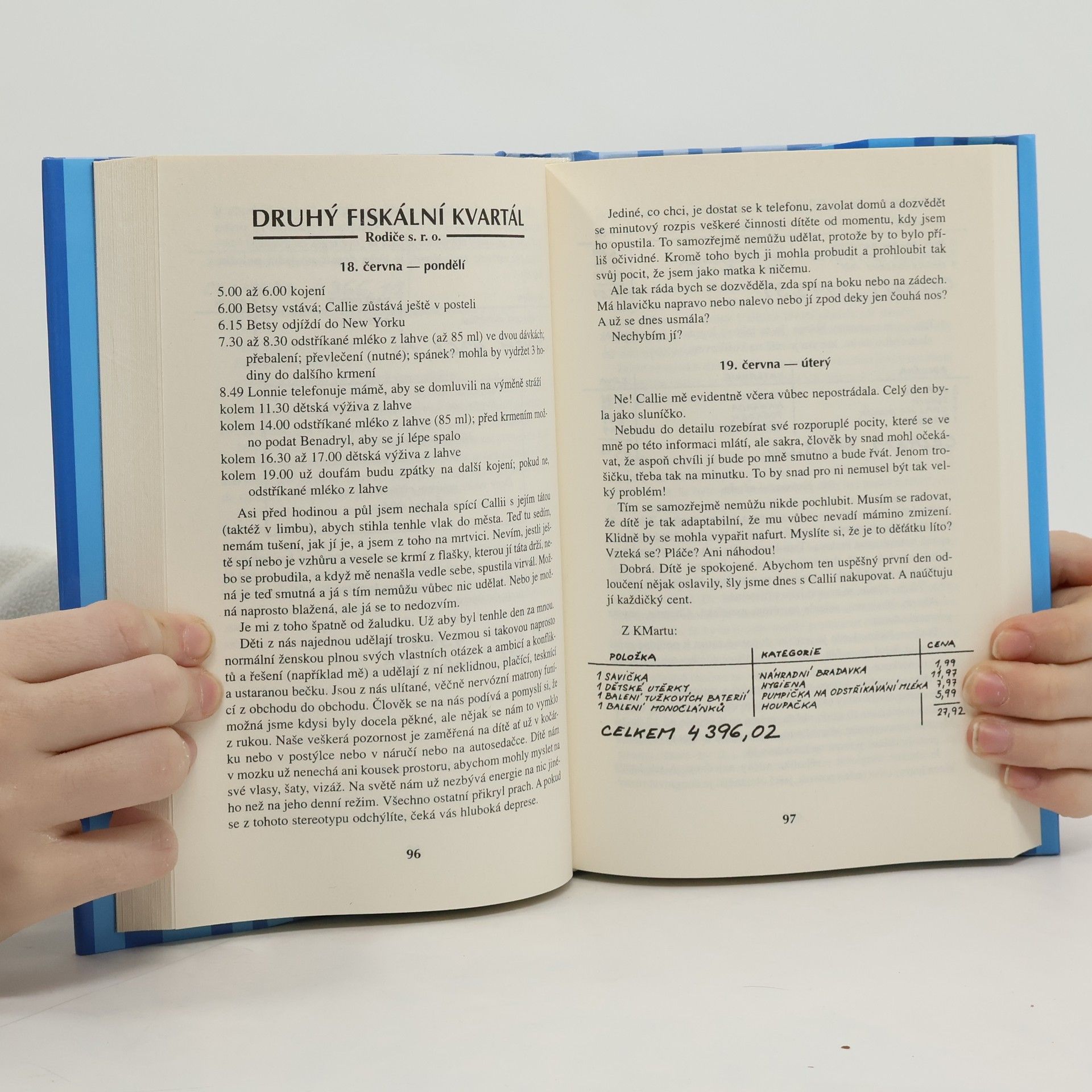 Čtyřicetiletá žena se po dlouhém váhání odhodlá mít dítě. Zhostí se svého předsevzetí bez sentimentu a racionálně. Součástí jejího rozhodnutí je také záměr zaznamenat pro svého potomka vše, co pro něj musí podstoupit, a především všechny výdaje, co s ním od prvního měsíce těhotenství má. Vzniká tak poutavá, podivuhodně realistická reflexe obav i očekávání ženy v prvním roce mateřství. Svérázná, autobiograficky laděná výpověď americké spisovatelky, dramatičky a herečky se pohybuje na pomezí dvou žánrů – účetnictví a deníku ve stylu Bridget Jonesové. Tato svěží a vtipná kniha strhne svou originalitou od prvního odstavce. Čtenářky a čtenáře možná zpočátku zaskočí cynismus, s nímž matka pro svou dceru střádá své útrapy, ale s přibývajícími stranami si je podmaňuje matčina upřímnost a jedinečný smysl pro humor. Jsme na prahu nového tisíciletí a takové budou jeho matky – ironické, počítající, přesto však stále obětavé a milující.