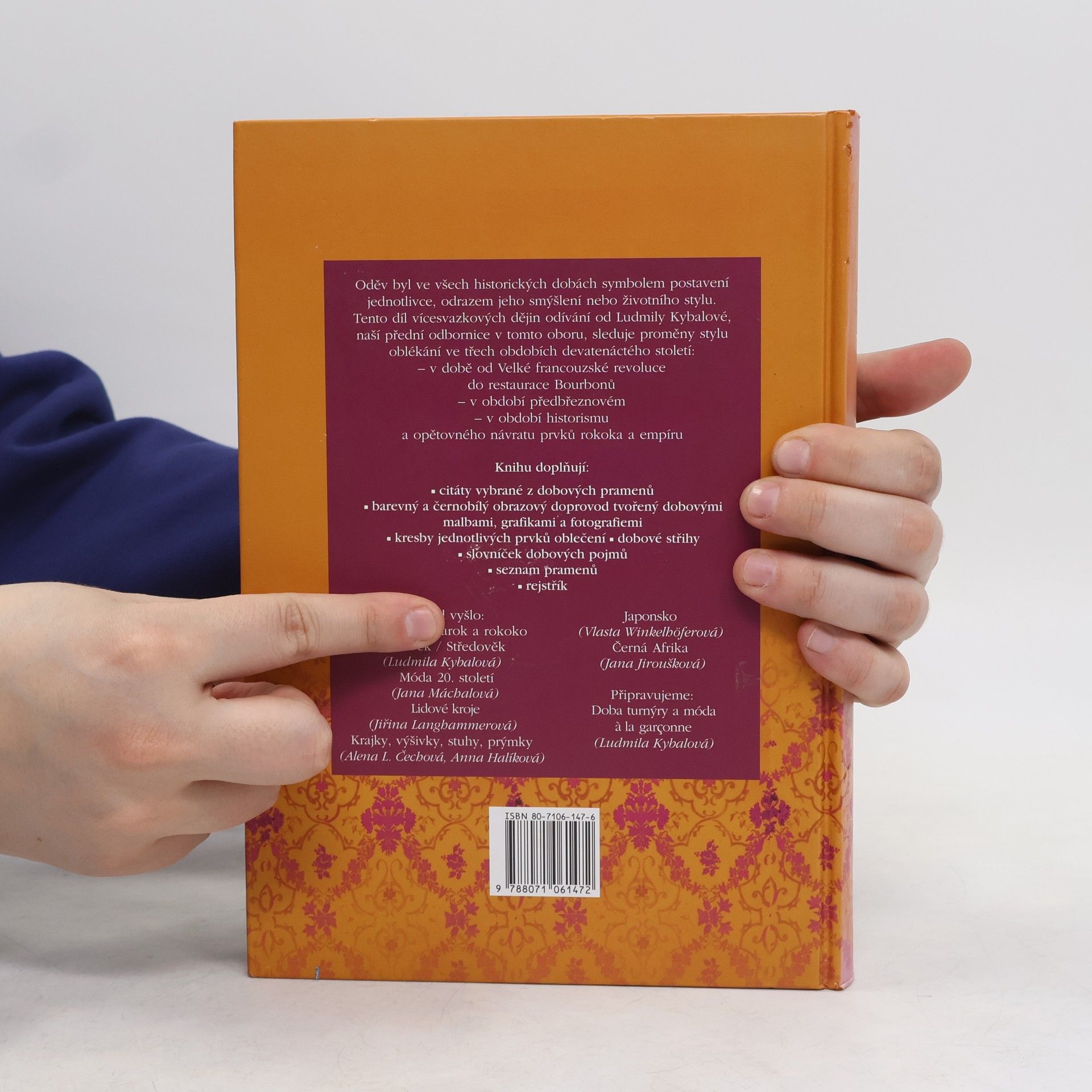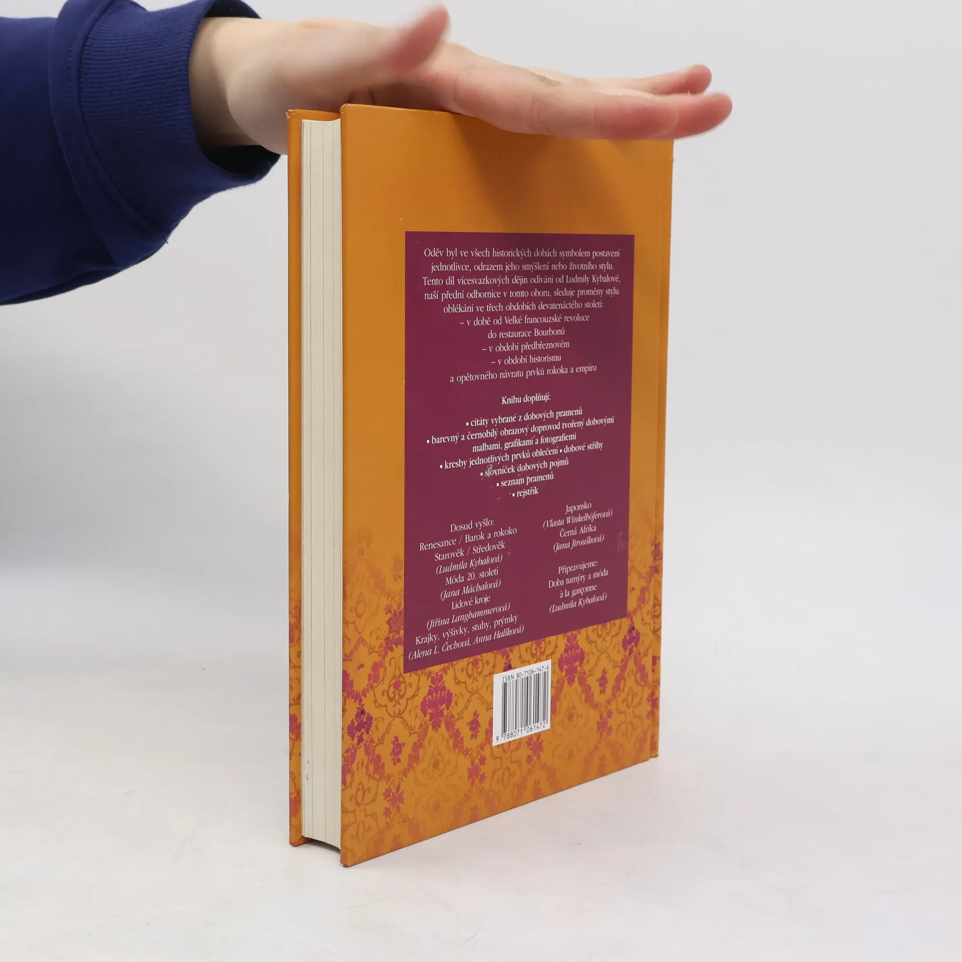 Další svazek edice Dějiny odívání sleduje proměny stylu oblékání ve třech obdobích devatenáctého století – v době od Velké francouzské revoluce do restaurace Bourbonů, v období předbřeznovém, v období historismu a opětovného návratu prvků rokoka a empíru. Barevný a černobílý obrazový doprovod, názorné kresby, citáty, střihy, slovníček.