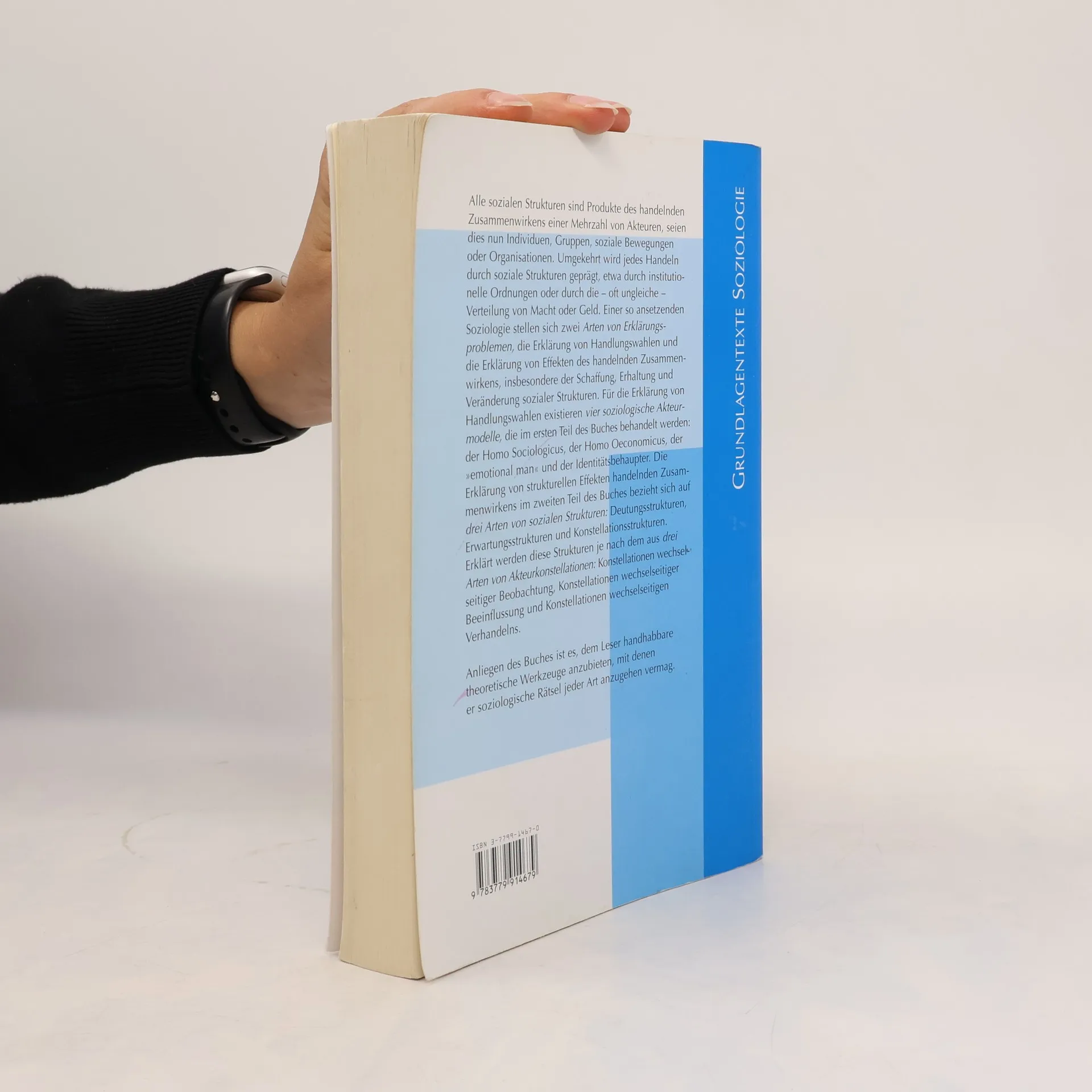Alle sozialen Strukturen sind Produkte des Zusammenwirkens von Akteuren, seien es Individuen, Gruppen oder Organisationen. Jedes Handeln wird durch soziale Strukturen wie institutionelle Ordnungen oder die ungleiche Verteilung von Macht und Geld geprägt. Die Soziologie sieht sich zwei Erklärungsproblemen gegenüber: der Erklärung von Handlungswahlen und den Effekten des Zusammenwirkens, insbesondere der Schaffung, Erhaltung und Veränderung sozialer Strukturen. Im ersten Teil werden vier Akteurmodelle zur Erklärung von Handlungswahlen behandelt: Homo Sociologicus, Homo Oeconomicus, „emotional man“ und Identitätsbehaupter. Der zweite Teil widmet sich den strukturellen Effekten und drei Arten von sozialen Strukturen: Deutungsstrukturen, Erwartungsstrukturen und Konstellationsstrukturen, die anhand von drei Akteurkonstellationen erklärt werden: wechselseitige Beobachtung, Beeinflussung und Verhandlung. Ziel ist es, dem Leser theoretische Werkzeuge an die Hand zu geben, um soziologische Rätsel zu lösen. Der Inhalt umfasst eine Einführung in die Erklärungsprobleme, verschiedene Akteurmodelle, soziale Dynamiken und Struktureffekte sowie deren Verknüpfungen. Abschließend werden Werkzeuge und Denkstile zur Analyse von sozialen Strukturen angeboten.