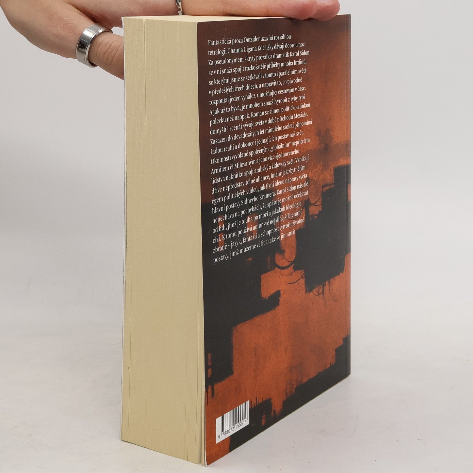 Fantastická próza Outsider uzavírá rozsáhlou tetralogii Chaima Cigana Kde lišky dávají dobrou noc. Za pseudonymem skrytý prozaik a dramatik Karol Sidon se v ní snaží spojit rozkošatělé příběhy mnoha hrdinů, se kterými jsme se setkávali v tomto i paralelním světě v předešlých třech dílech, a napravit to, co původně rozpoutal jeden vynález, umožňující cestování v čase. A jak už to bývá, je mnohem snazší vyrobit z ryby rybí polévku než naopak. Román se silnou politickou linkou domýšlí i scénář vývoje světa v době příchodu Mesiáše. Zasazen do devadesátých let minulého století připomíná řadou reálií a dokonce i jednajících postav náš svět. Okolnosti vyvolané společným „globálním“ nepřítelem Armilem či Milovaným a jeho vize sjednoceného lidstva nakrátko spojí arabský a židovský svět. Vznikají dříve nepředstavitelné aliance, hnané jak zbytnělým egem politických vůdců, tak fixní ideou nápravy světa hlavní postavy Sidneyho Kramera. Karol Sidon nás ale nenechává na pochybách, že spásu je možné očekávat od lidí, jimž je touha po moci a jakákoli ideologie cizí. K tomu používá autor své nejsilnější literární zbraně – jazyk, fantazii a schopnost vytvořit životné postavy, jimž můžeme věřit a také se jim smát.