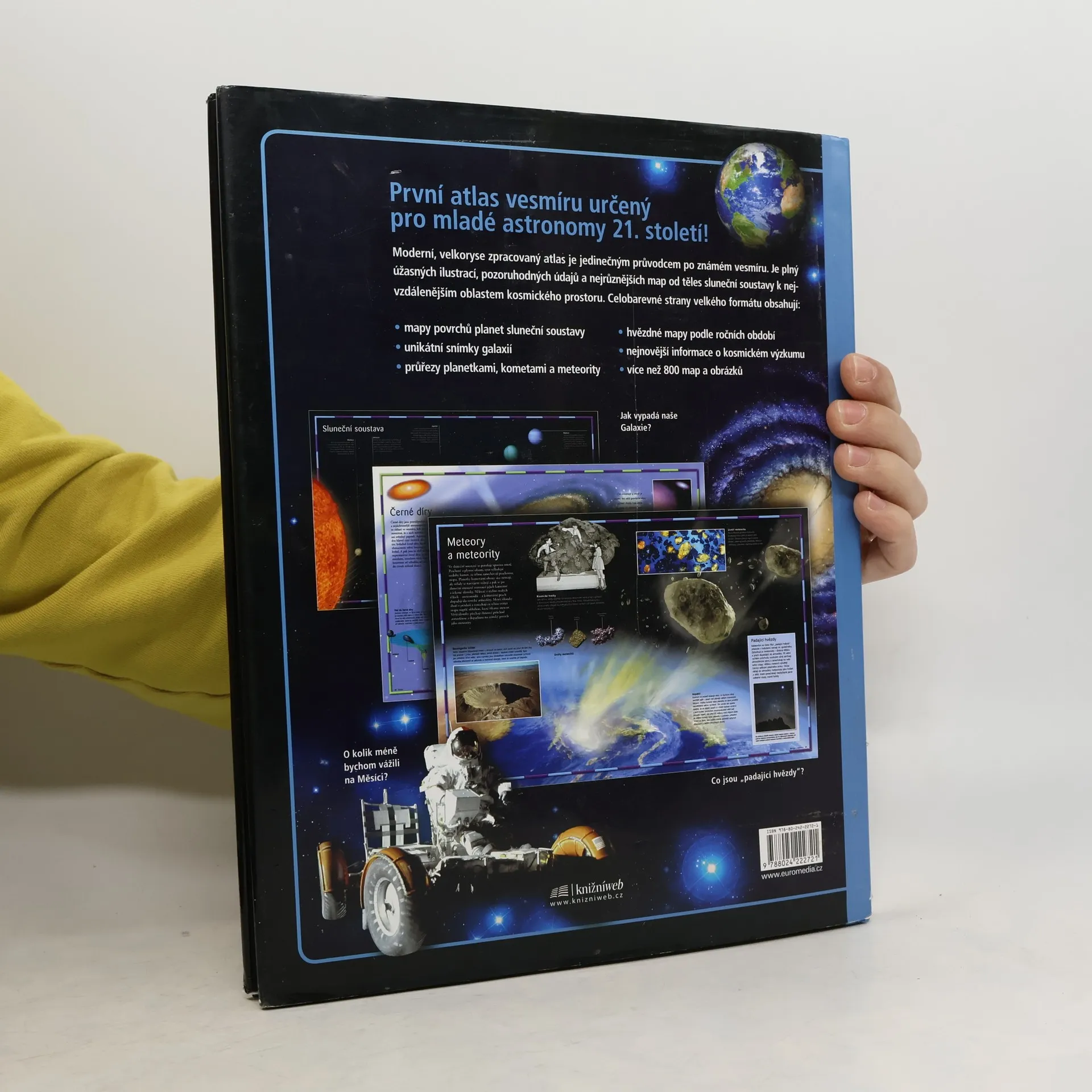 Moderní, velkoryse zpracovaný atlas je jedinečným průvodcem po známém vesmíru. Nabízí pozoruhodné množství aktuálních informací o všem od těles sluneční soustavy k nejvzdálenějším oblastem kosmického prostoru. Celobarevné strany velkého formátu obsahují mapy povrchů planet sluneční soustavy, unikátní snímky galaxií, průřezy planetkami, kometami a meteority, hvězdné mapy podle ročních období a více než 800 map a obrázků.